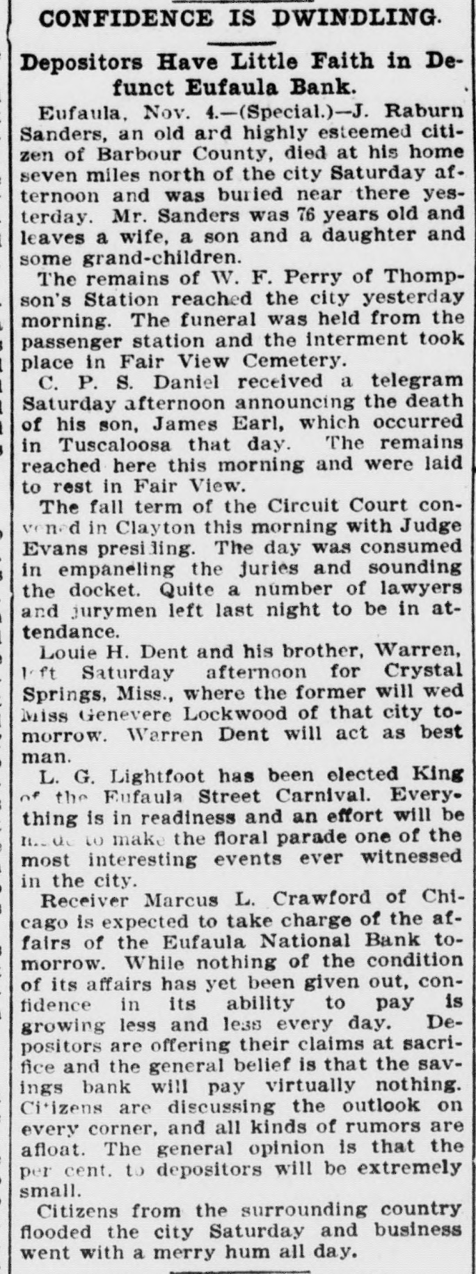 CONFIDENCE IS DWINDLING Depositors Have Little Faith in Defunct Eufaula Bank. Eufaula. Nov. 4.-(Special.)-J. Raburn Sanders, an old ard highly esteemed citizen of Barbour County, died at his home seven miles north of the city Saturday afternoon and was buried near there yesterday. Mr. Sanders was 76 years old and leaves a wife, a son and a daughter and some grand-children. The remains of W. F. Perry of Thompson's Station reached the city yesterday morning. The funeral was held from the passenger station and the interment took place in Fair View Cemetery. C. P. S. Daniel received a telegram Saturday afternoon announcing the death of his son, James Earl, which occurred in Tuscaloosa that day. The remains reached here this morning and were laid to rest in Fair View. The fall term of the Circuit Court convoned in Clayton this morning with Judge Evans presi iding. The day was consumed in empaneling the juries and sounding the docket. Quite a number of lawyers and jurymen left last night to be in attendance. Louie H. Dent and his brother, Warren, ft Saturday afternoon for Crystal Springs, Miss., where the former will wed Miss Genevere Lockwood of that city tomorrow. Warren Dent will act as best man. L. G. Lightfoot has been elected King of the Eufaula Street Carnival. Everything is in readiness and an effort will be It us to make the floral parade one of the most interesting events ever witnessed in the city. Receiver Marcus L. Crawford of Chicago is expected to take charge of the affairs of the Eufaula National Bank tomorrow. While nothing of the condition of its affairs has yet been given out, confidence in its ability to pay is growing less and 1e38 every day. Depositors are offering their claims at sacrifice and the general belief is that the savings bank will pay virtually nothing. Citizens are discussing the outlook on every corner, and all kinds of rumors are afloat. The general opinion is that the per cent. to depositors will be extremely small. Citizens from the surrounding country flooded the city Saturday and business went with a merry hum all day.