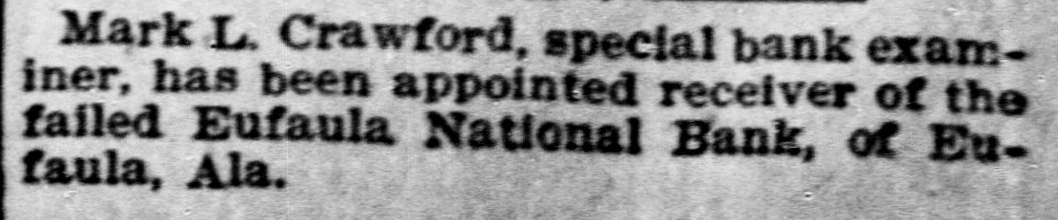 Mark L. Crawford, special bank examiner, has been appointed receiver of the failed Eufaula National Bank, of Eufaula, Ala.