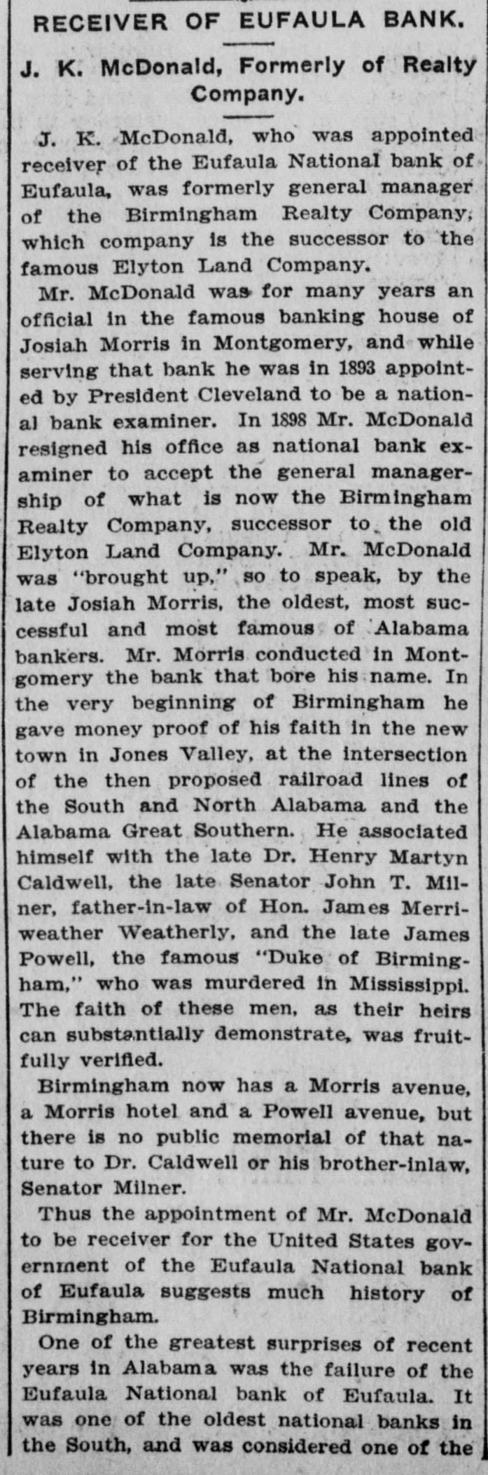 RECEIVER OF EUFAULA BANK. J. K. McDonald, Formerly of Realty Company. J. K. McDonald, who was appointed receiver of the Eufaula National bank of Eufaula, was formerly general manager of the Birmingham Realty Company, which company is the successor to the famous Elyton Land Company. Mr. McDonald was for many years an official in the famous banking house of Josiah Morris in Montgomery, and while serving that bank he was in 1893 appointed by President Cleveland to be a national bank examiner. In 1898 Mr. McDonald resigned his office as national bank examiner to accept the general managership of what is now the Birmingham Realty Company, successor to. the old Elyton Land Company. Mr. McDonald was "brought up," so to speak, by the late Josiah Morris, the oldest, most successful and most famous of Alabama bankers. Mr. Morris conducted in Montgomery the bank that bore his name. In the very beginning of Birmingham he gave money proof of his faith in the new town in Jones Valley, at the intersection of the then proposed railroad lines of the South and North Alabama and the Alabama Great Southern. He associated himself with the late Dr. Henry Martyn Caldwell, the late Senator John T. Milner, father-in-law of Hon. James Merriweather Weatherly, and the late James Powell, the famous "Duke of Birmingham," who was murdered in Mississippi. The faith of these men, as their heirs can substantially demonstrate, was fruitfully verified. Birmingham now has a Morris avenue, a Morris hotel and a Powell avenue, but there is no public memorial of that nature to Dr. Caldwell or his brother-inlaw, Senator Milner. Thus the appointment of Mr. McDonald to be receiver for the United States government of the Eufaula National bank of Eufaula suggests much history of Birmingham. One of the greatest surprises of recent years in Alabama was the failure of the Eufaula National bank of Eufaula. It was one of the oldest national banks in the South, and was considered one of the