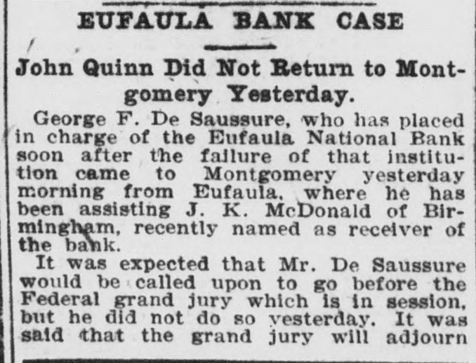 EUFAULA BANK CASE John Quinn Did Not Return to Montgomery Yesterday. George F. De Saussure, who has placed in charge of the Eufaula National Bank soon after the failure of that institution came to Montgomery yesterday morning from Eufaula. where he has been assisting J. K. McDonald of Birmingham, recently named as receiver of the bank. It was expected that Mr. De Saussure would be called upon to go before the Federal grand jury which is in session, but he did not do so vesterday. It was said that the grand jury will adjourn