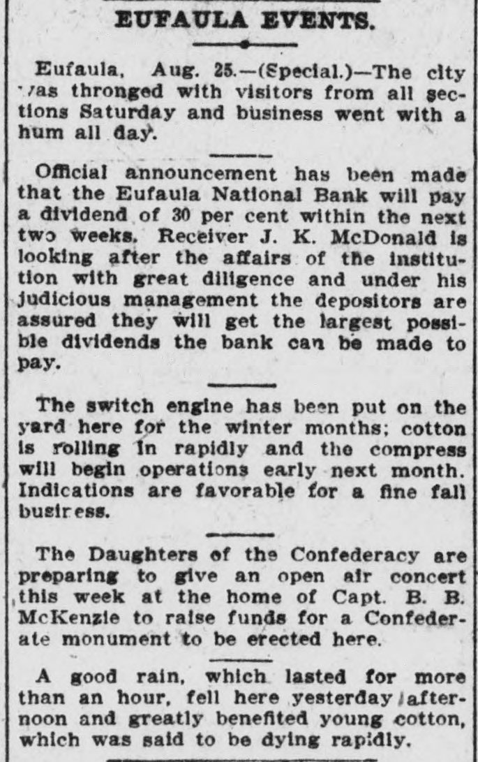 EUFAULA EVENTS. Eufaula, Aug. 25.-(Special.)-The city was thronged with visitors from all sections Saturday and business went with a hum all day. Official announcement has been made that the Eufaula National Bank will pay a dividend of 30 per cent within the next two weeks. Receiver J. K. McDonald is looking after the affairs of the institution with great diligence and under his judicious management the depositors are assured they will get the largest possible dividends the bank can be made to pay. The switch engine has been put on the yard here for the winter months; cotton is rolling In rapidly and the compress will begin operations early next month. Indications are favorable for a fine fall business. The Daughters of the Confederacy are preparing to give an open air concert this week at the home of Capt. B. B. McKenzie to raise funds for a Confederate monument to be erected here. A good rain, which lasted for more than an hour, fell here yesterday afternoon and greatly benefited young cotton, which was said to be dying rapidly.
