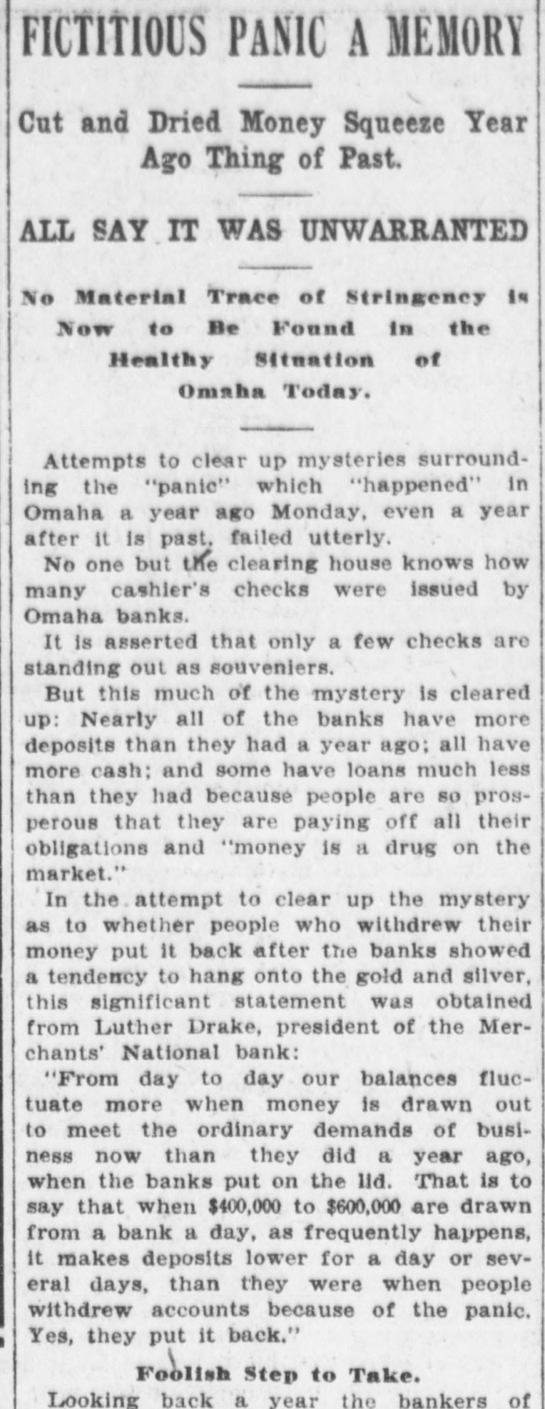 FICTITIOUS PANIC A MEMORY Cut and Dried Money Squeeze Year Ago Thing of Past. ALL SAY IT WAS UNWARRANTED No Material Trace of Stringency is Now to Be Found in the Healthy Situation of Omaha Today. Attempts to clear up mysteries surrounding the "panic" which "happened" in Omaha a year ago Monday, even a year after it is past, failed utterly. No one but the clearing house knows how many cashier's checks were issued by Omaha banks. It is asserted that only a few checks are standing out as souveniers. But this much of the mystery is cleared up: Nearly all of the banks have more deposits than they had a year ago; all have more cash; and some have loans much less than they had because people are so prosperous that they are paying off all their obligations and "money is a drug on the market." In the attempt to clear up the mystery as to whether people who withdrew their money put it back after the banks showed a tendency to hang onto the gold and silver, this significant statement was obtained from Luther Drake, president of the Merchants' National bank: "From day to day our balances fluctuate more when money is drawn out to meet the ordinary demands of business now than they did a year ago, when the banks put on the lid. That is to say that when $400,000 to $600,000 are drawn from a bank a day, as frequently happens, it makes deposits lower for a day or several days, than they were when people withdrew accounts because of the panic. Yes, they put it back." Foolish Step to Take. Looking back a year the bankers of