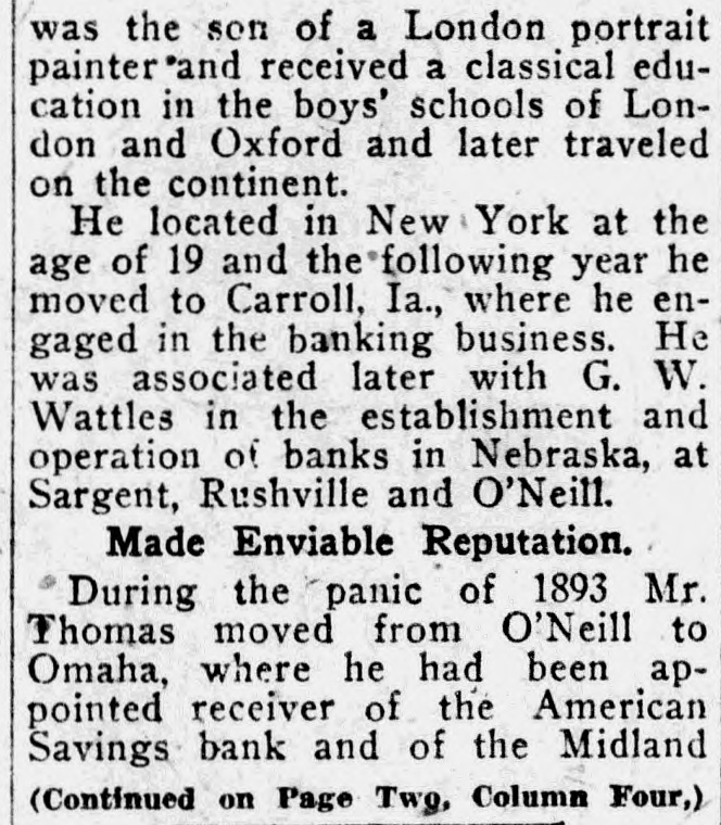 was the son of a London portrait painter*and received a classical education in the boys' schools of London and Oxford and later traveled on the continent. He located in New York at the age of 19 and the following year he moved to Carroll, Ia., where he engaged in the banking business. He was associated later with G. W. Wattles in the establishment and operation of banks in Nebraska, at Sargent, Rushville and O'Neill. Made Enviable Reputation. During the panic of 1893 Mr. Thomas moved from O'Neill to Omaha, where he had been appointed receiver of the American Savings bank and of the Midland (Continued on Page Twg, Column Four,)