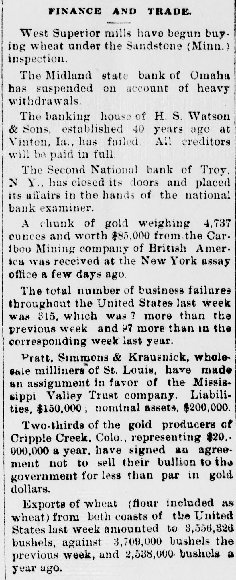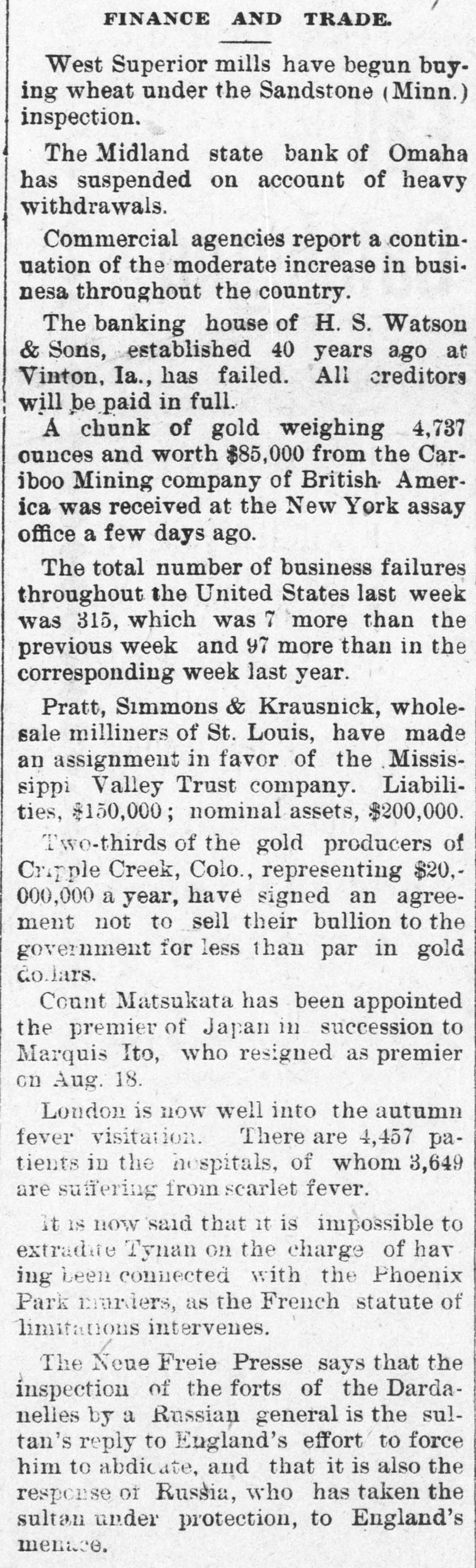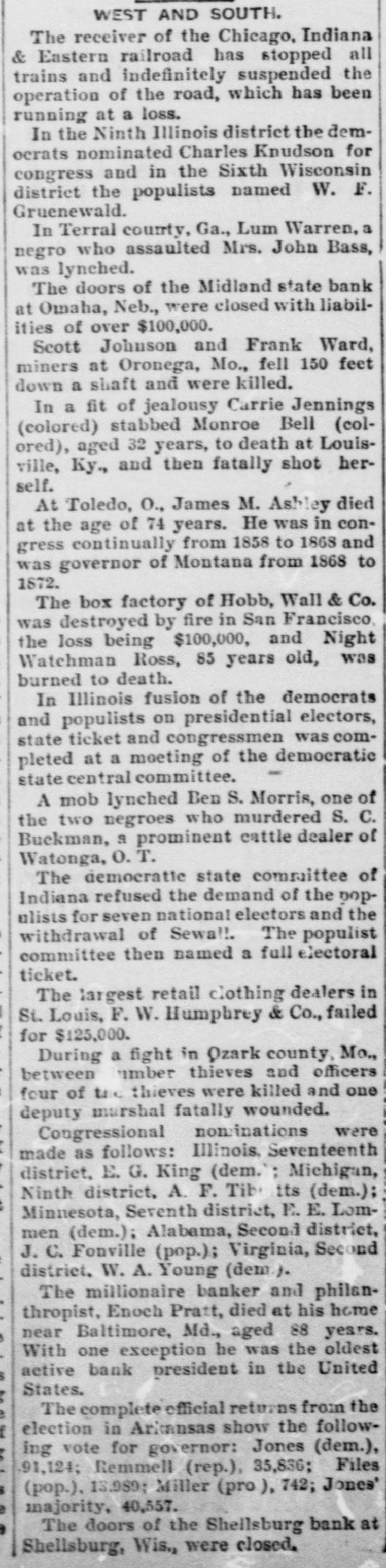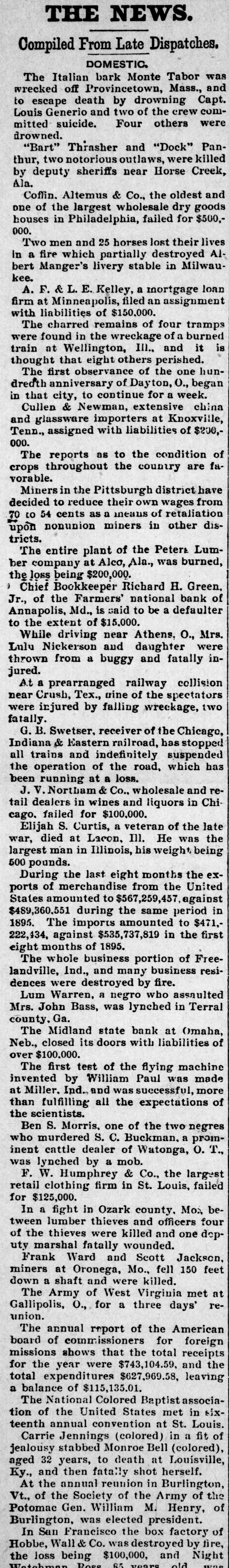 THE NEWS. Compiled From Late Dispatches. DOMESTIC. The Italian bark Monte Tabor was wrecked off Provincetown, Mass., and to escape death by drowning Capt. Louis Generio and two of the crew committed suicide. Four others were drowned. "Bart" Thrasher and "Dock" Panthur, two notorious outlaws, were killed by deputy sheriffs near Horse Creek, Ala. Coffin. Altemus & Co., the oldest and one of the largest wholesale dry goods houses in Philadelphia, failed for $500,000. Two men and 25 horses lost their lives in a fire which partially destroyed Albert Manger's livery stable in Milwaukee. A. F. & L. E. Kelley, a mortgage loan firm at Minneapolis, filed an assignment with liabilities of $150,000. The charred remains of four tramps were found in the wreckage of a burned train at Wellington, III., and it is thought that eight others perished. The first observance of the one hundredth anniversary of Dayton, O., began in that city, to continue for a week. Cullen & Newman, extensive china and glassware importers at Knoxville, Tenn., assigned with liabilities of $200,000. The reports as to the condition of crops throughout the country are favorable. Miners in the Pittsburgh district have decided to reduce their own wages from 70 to 54 cents as a means of retaliation upon nonunion miners in other districts. The entire plant of the Peters Lumber company at Alco, Ala., was burned, the loss being $200,000. , Chief Bookkeeper Richard H. Green, Jr., of the Farmers' national bank of Annapolis, Md., is said to be a defaulter to the extent of $15,000. While driving near Athens, O., Mrs. Lulu Nickerson and daughter were thrown from a buggy and fatally injured. At a prearranged railway collision near Crush, Tex., orine of the spectators were injured by falling wreckage, two fatally. G. B. Swetser, receiver of the Chicago, Indiana & Eastern railroad, has stopped all trains and indefinitely suspended the operation of the road, which has been running at a loss. J. V. Northam & Co., wholesale and retail dealers in wines and liquors in Chicago. failed for $100,000. Elijah S. Curtis, a veteran of the late war, died at Lacon, Ill. He was the largest man in Illinois, his weight being 500 pounds. During the last eight months the exports of merchandise from the United States amounted to $567,259,457, against $489,360,551 during the same period in 1895. The imports amounted to $471,222,434, against $535,737,819 in the first eight months of 1895. The whole business portion of Freelandville, Ind., and many business residences were destroyed by fire. Lum Warren, a negro who assaulted Mrs. John Bass, was lynched in Terral county. Ga. The Midland state bank at Omaha, Neb., closed its doors with liabilities of over $100,000. The first test of the flying machine invented by William Paul was made at Miller. Ind., and was successful, more than fulfilling all the expectations of the scientists. Ben S. Morris, one of the two negres who murdered S. C. Buckman. a prominent cattle dealer of Watonga, O. T., was lynched by a mob. F. W. Humphrey & Co., the largest retail clothing firm in St. Louis, failed for $125,000. In a fight in Ozark county. Mo., between lumber thieves and officers four of the thieves were killed and one deputy marshal fatally wounded. Frank Ward and Scott Jackson, miners at Oronega, Mo., fell 150 feet down a shaft and were killed. The Army of West Virginia met at Gallipolis, O., for a three days' reunion. The annual report of the American board of commissioners for foreign missions shows that the total receipts for the year were $743,104.59, and the total expenditures $627,969.58, leaving a balance of $115,135.01. The National Colored Baptist association of the United States met in sixteenth annual convention at St. Louis. Carrie Jennings (colored) in a fit of jealousy stabbed Monroe Bell (colored), aged 32 years, to death at Louisville, Ky., and then fatally shot herself. At the annual reunion in Burlington, Vt., of the Society of the Army of the Potomac Gen. William M. Henry, of Burlington, was elected president. In San Francisco the box factory of Hobbe, Wall & Co. was destroyed by fire,