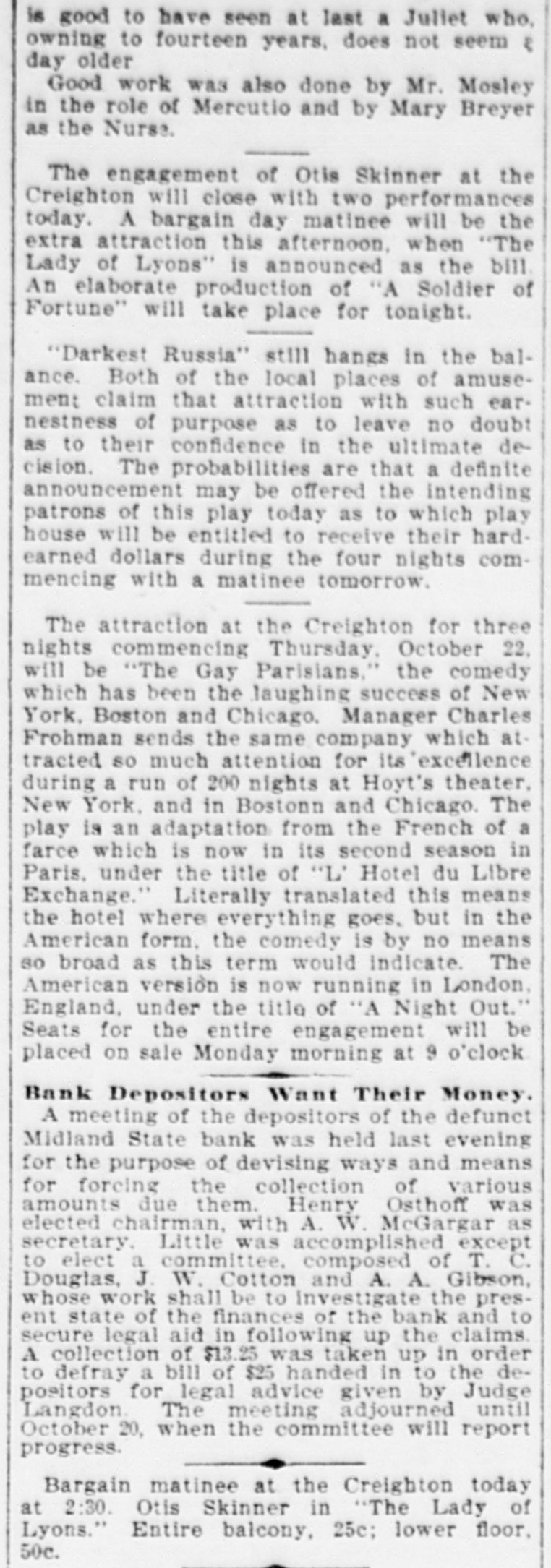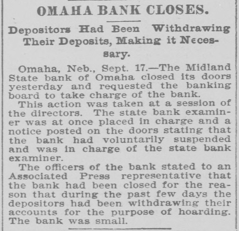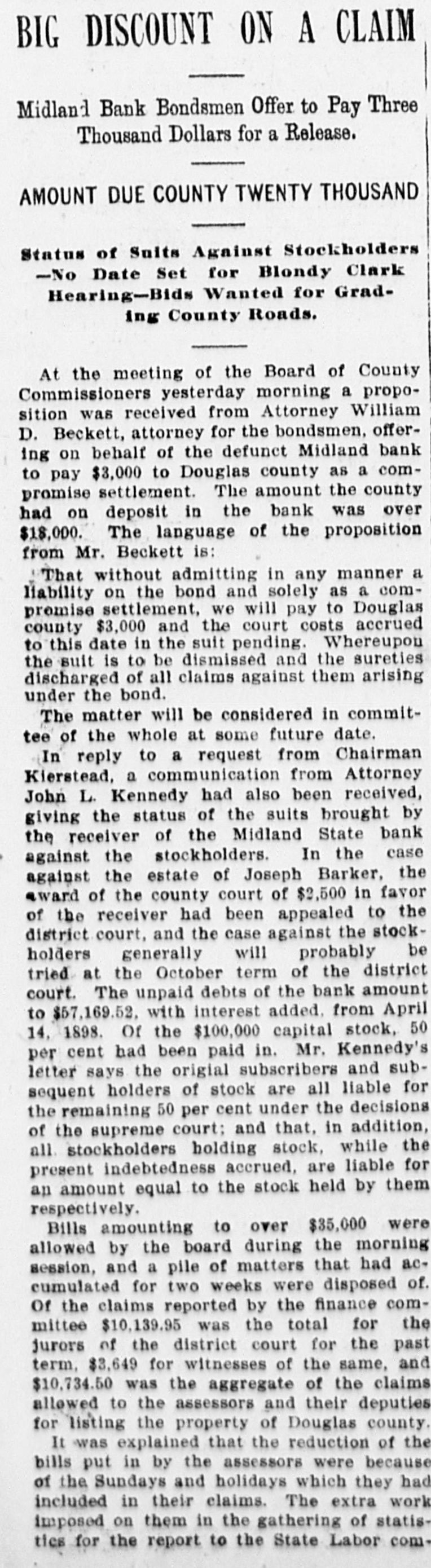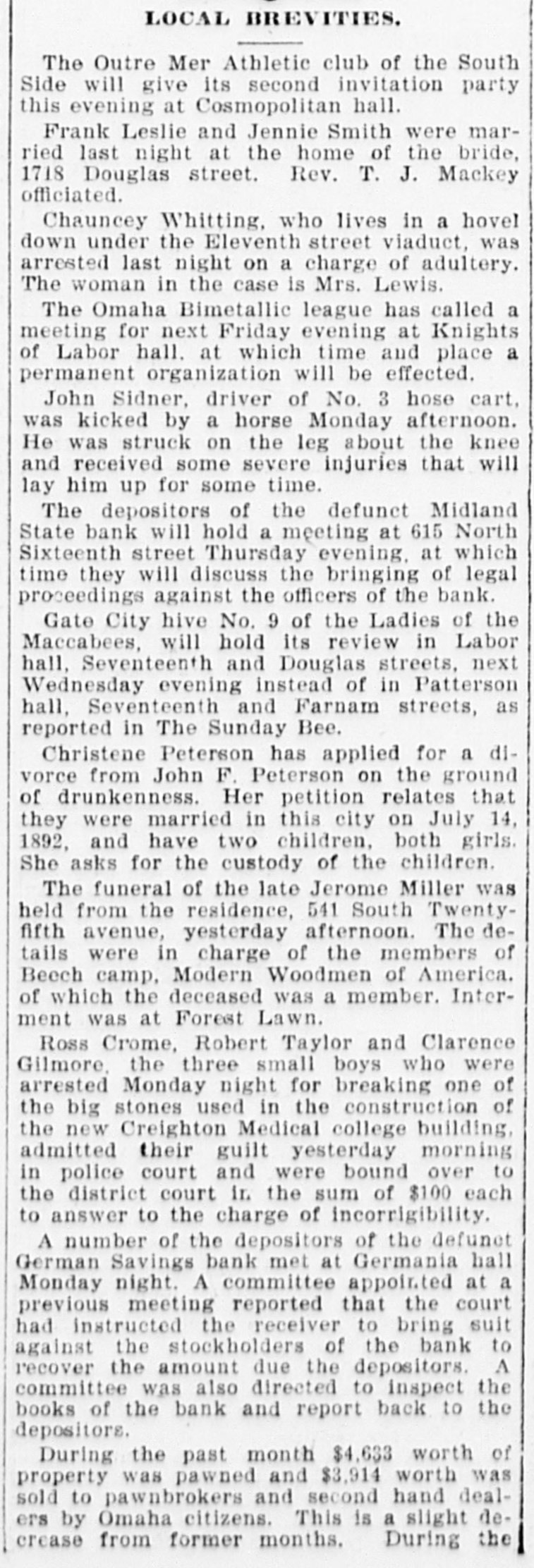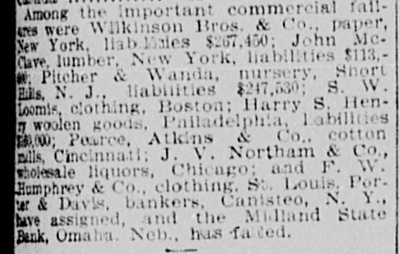 THE NEWS. Compiled From Late Dispatches. DOMESTIC. The Italian bark Monte Tabor was wrecked off Provincetown, Mass., and to escape death by drowning Capt. Louis Generio and two of the crew committed suicide. Four others were drowned. "Bart" Thrasher and "Dock" Panthur, two notorious outlaws, were killed by deputy sheriffs near Horse Creek, Ala. Coffin. Altemus & Co., the oldest and one of the largest wholesale dry goods houses in Philadelphia, failed for $500,000. Two men and 25 horses lost their lives in a fire which partially destroyed Albert Manger's livery stable in Milwaukee. A. F. & L. E. Kelley, a mortgage loan firm at Minneapolis, filed an assignment with liabilities of $150,000. The charred remains of four tramps were found in the wreckage of a burned train at Wellington, III., and it is thought that eight others perished. The first observance of the one hundredth anniversary of Dayton, O., began in that city, to continue for a week. Cullen & Newman, extensive china and glassware importers at Knoxville, Tenn., assigned with liabilities of $200,000. The reports as to the condition of crops throughout the country are favorable. Miners in the Pittsburgh district have decided to reduce their own wages from 70 to 54 cents as a means of retaliation upon nonunion miners in other districts. The entire plant of the Peters Lumber company at Alco, Ala., was burned, the loss being $200,000. , Chief Bookkeeper Richard H. Green, Jr., of the Farmers' national bank of Annapolis, Md., is said to be a defaulter to the extent of $15,000. While driving near Athens, O., Mrs. Lulu Nickerson and daughter were thrown from a buggy and fatally injured. At a prearranged railway collision near Crush, Tex., orine of the spectators were injured by falling wreckage, two fatally. G. B. Swetser, receiver of the Chicago, Indiana & Eastern railroad, has stopped all trains and indefinitely suspended the operation of the road, which has been running at a loss. J. V. Northam & Co., wholesale and retail dealers in wines and liquors in Chicago. failed for $100,000. Elijah S. Curtis, a veteran of the late war, died at Lacon, Ill. He was the largest man in Illinois, his weight being 500 pounds. During the last eight months the exports of merchandise from the United States amounted to $567,259,457, against $489,360,551 during the same period in 1895. The imports amounted to $471,222,434, against $535,737,819 in the first eight months of 1895. The whole business portion of Freelandville, Ind., and many business residences were destroyed by fire. Lum Warren, a negro who assaulted Mrs. John Bass, was lynched in Terral county. Ga. The Midland state bank at Omaha, Neb., closed its doors with liabilities of over $100,000. The first test of the flying machine invented by William Paul was made at Miller. Ind., and was successful, more than fulfilling all the expectations of the scientists. Ben S. Morris, one of the two negres who murdered S. C. Buckman. a prominent cattle dealer of Watonga, O. T., was lynched by a mob. F. W. Humphrey & Co., the largest retail clothing firm in St. Louis, failed for $125,000. In a fight in Ozark county. Mo., between lumber thieves and officers four of the thieves were killed and one deputy marshal fatally wounded. Frank Ward and Scott Jackson, miners at Oronega, Mo., fell 150 feet down a shaft and were killed. The Army of West Virginia met at Gallipolis, O., for a three days' reunion. The annual report of the American board of commissioners for foreign missions shows that the total receipts for the year were $743,104.59, and the total expenditures $627,969.58, leaving a balance of $115,135.01. The National Colored Baptist association of the United States met in sixteenth annual convention at St. Louis. Carrie Jennings (colored) in a fit of jealousy stabbed Monroe Bell (colored), aged 32 years, to death at Louisville, Ky., and then fatally shot herself. At the annual reunion in Burlington, Vt., of the Society of the Army of the Potomac Gen. William M. Henry, of Burlington, was elected president. In San Francisco the box factory of Hobbe, Wall & Co. was destroyed by fire,