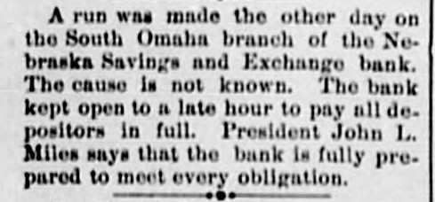 A run was made the other day on the South Omaha branch of the Nebraska Savings and Exchange bank. The cause is not known. The bank kept open to a late hour to pay all depositors in full. President John L. Miles says that the bank is fully prepared to meet every obligation.
