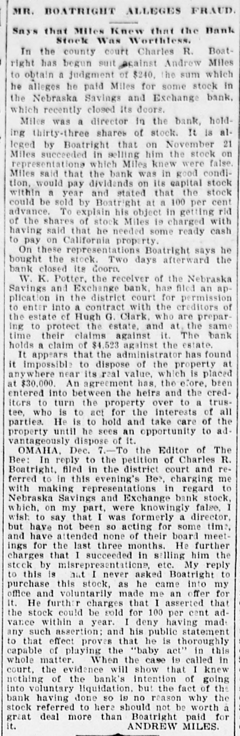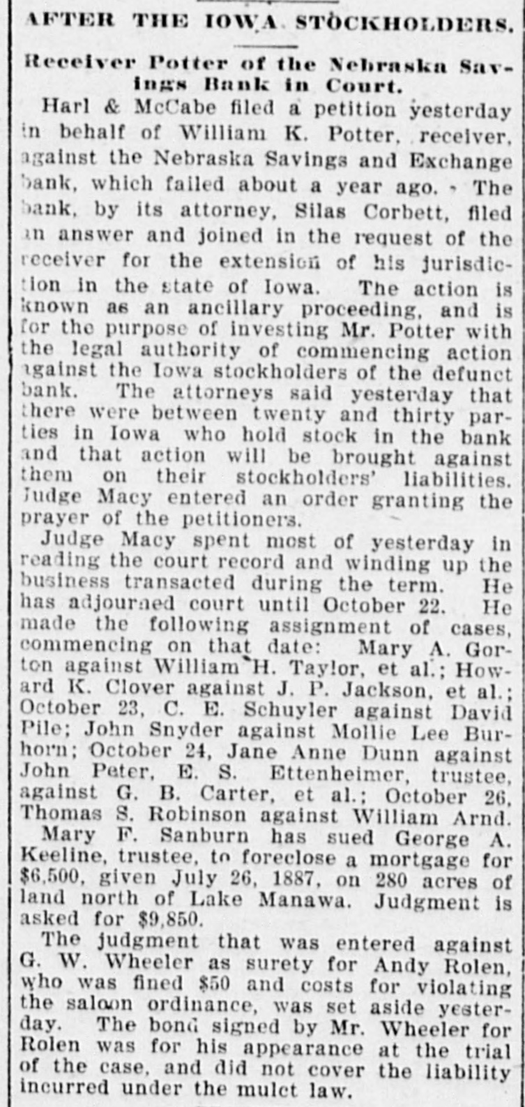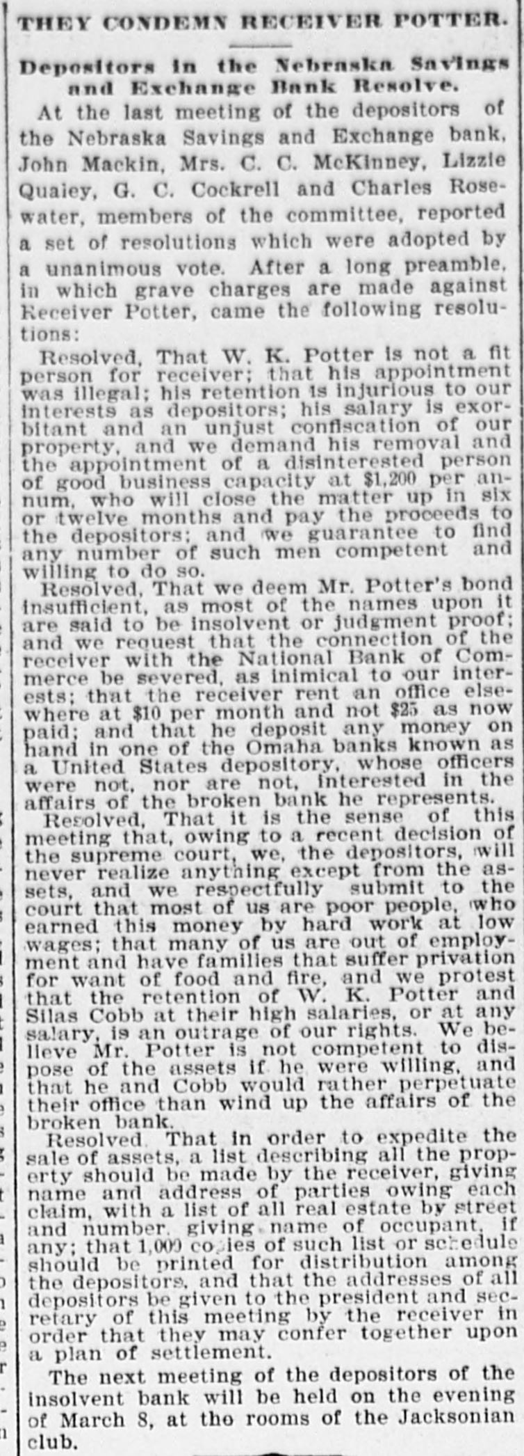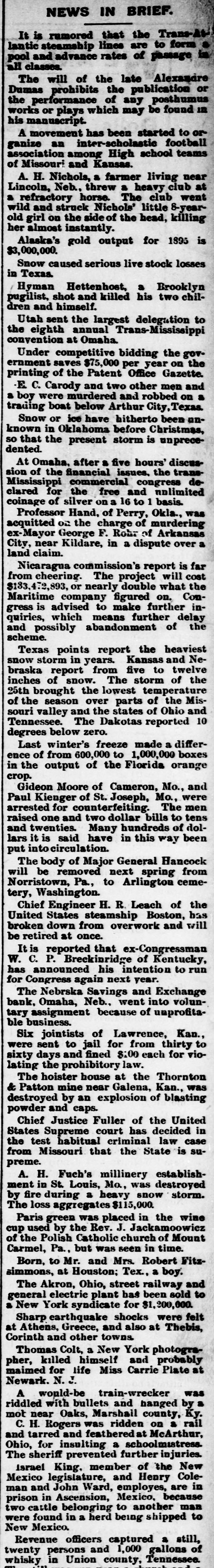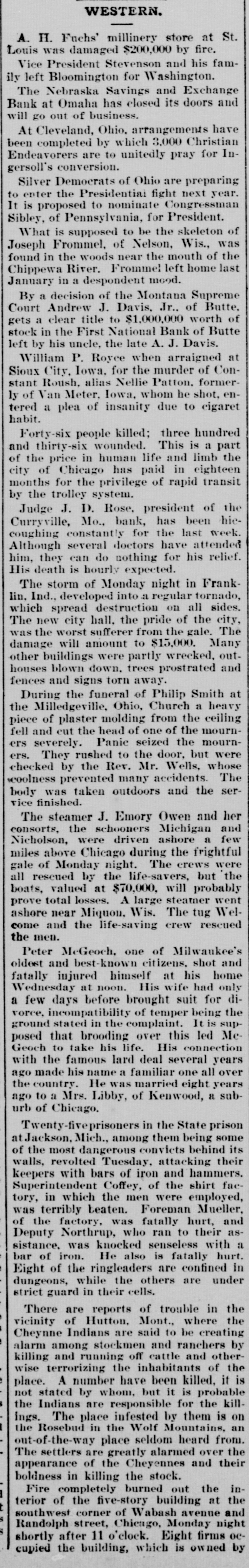 WESTERN. A. H. Fuchs' millinery store at St. Louis was damaged $200,000 by fire. Vice President Stevenson and his family left Bloomington for Washington. The Nebraska Savings and Exchange Bank at Omaha has closed its doors and will go out of business. At Cleveland, Ohio. arrangements have been completed by which 3.000 Christian Endeavorers are to unitedly pray for Ingersoll's conversion. Silver Democrats of Ohio are preparing to enter the Presidential fight next year. It is proposed to nominate Congressman Sibley, of Pennsylvania, for President. What is supposed to be the skeleton of Joseph Frommel, of Nelson, Wis., was found in the woods near the mouth of the Chippewa River. Frommel left home last January in a despondent mood. By a decision of the Montana Supreme Court Andrew J. Davis, Jr., of Butte. gets a clear title to $1,000,000 worth of stock in the First National Bank of Butte left by his uncle, the late A. J. Davis. William P. Royce when arraigned at Sioux City, Iowa, for the murder of Constant Roush, alias Nellie Patton. formerly of Van Meter. Iowa, whom he shot, entered a plea of insanity due to cigaret habit. Forty-six people killed; three hundred and thirty-six wounded. This is a part of the price in human life and limb the city of Chicago has paid in eighteen months for the privilege of rapid transit by the trolley system. Judge J. D. Rose, president of the Curryville, Mo., bank, has been hiecoughing constantly for the last week. Although several doctors have attended him, they can do nothing for his relief. His death is hourly expected. The storm of Monday night in Franklin. Ind., developed into a regular tornado, which spread destruction on all sides. The new city hall, the pride of the city, was the worst sufferer from the gale. The damage will amount to $15,000. Many other buildings were partly wrecked. outhouses blown down. trees prostrated and fences and signs torn away. During the funeral of Philip Smith at the Milledgeville, Ohio, Church a heavy piece of plaster molding from the ceiling fell and cut the head of one of the mourners severely. Panic seized the mourners. They rushed to the door, but were checked by the Rev. Mr. Wells, whose «coolness prevented many accidents. The body was taken outdoors and the service finished. The steamer J. Emory Owen and her consorts, the schooners Michigan and Nicholson, were driven ashore a few miles above Chicago during the frightful gale of Monday night. The crews were all rescued by the life-savers, but the boats, valued at $70,000, will probably prove total losses. A large steamer went ashore near Miquon, Wis. The tug Welcome and the life-saving crew rescued the men. Peter McGeoch. one of Milwaukee's oldest and best-known citizens. shot and fatally injured himself at his home Wednesday at noon. His wife had only a few days before brought suit for vorce, incompatibility of temper being the ground stated in the complaint. It is supposed that brooding over this led MeGeoch to take his life. His connection with the famous lard deal several years ago made his name a familiar one all over the country. He was married eight years ago to a Mrs. Libby, of Kenwood, a suburb of Chicago. Twenty-fiveprisoners in the State prison at Jackson, Mich., among them being some of the most dangerous convicts behind its walls, revolted Tuesday, attacking their keepers with bars of iron and hammers.