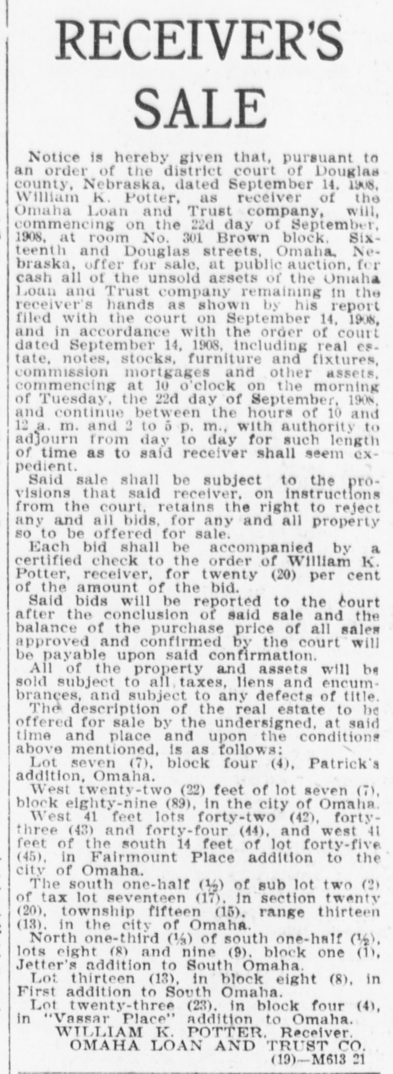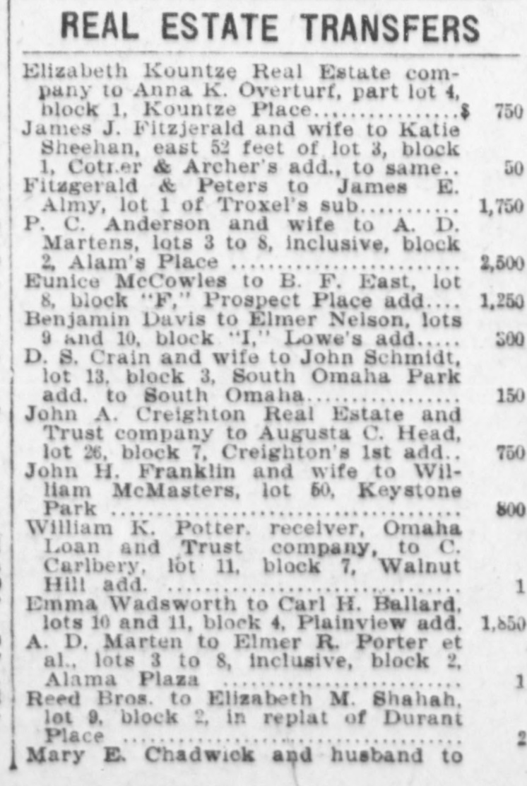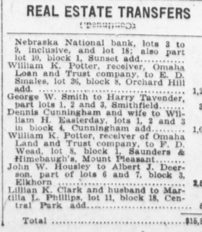REAL ESTATE TRANSFERS Elizabeth Cameron to Johana L. W. Hoppe, lot 11, block 21, Gate City Park addition 75 $ Margaret C. Dewitt to same, lot 10, block 2, Gate City Park addition 75 John Rush and wife to Lucella B. Mendenhall, lot 14, block 6, Riverside addition 2 George Seletos to Samuel Mancuse, lot 4, block 21, Shull's addition 2 Rachael Cameros to Joseph Camero, part of lot 13, block 7, Patrick's 2d addition 1 John C. Blouck to William A. Trumbo, lot 20, Luke & Templeton's addition 2,800 Edwin F. Brailey, sheriff, to Edward T. Heyden, lot 12, block 22, Kountze Place 1,550 Frank R. Vierling and wife to Emil Rix, lot 3, block 9, Shull's 2d addition 1,000 William K. Potter, receiver of Omaha Loan and Trust company, to J. C. Vizzard, part sublot 4, tax lot 16, sec. 10-15-13 1,250 John A. Creighton Real Estate and Trust company to Irving H. Arey, lot 1, block 6, Creighton's 1st addition 950 Meliora W. `airchild and husband to F. Isabel Pollard, lot 3, block 3, Oak Hurst park 475 Chris Berger and wife to Annie R. Matthews, lot 18, block 1, Hastings & Heyden's addition 2,300 John J. Mirten and wife to John Ternus, part of lot 4 and lot 3, block 6, Improvement. Association adaddition 2,050 United States National bank to Missouri Valley Land and Live Stock company, lots 5, 6, 7 and 8, block 1971/2, and other property 1 James M. Robinson to Edward F. Leavy, lot 1, A. H. Sanders' addition 1 Saunders County National bank to Ellen Rosten et al, lots 3, 6, 7, 8, 17, 18, 19 and 20, block -, and other property in Mayne addition 1 Same to Ellen Rosten et al, lots 4, 5, 7, 15, 16, 17 and 18, block 2, and other property in Mayne addition 1 Augusta E. Crissman to May E. Russell, s½ lot 91, Nelson's addition 2,000 Total $14,534