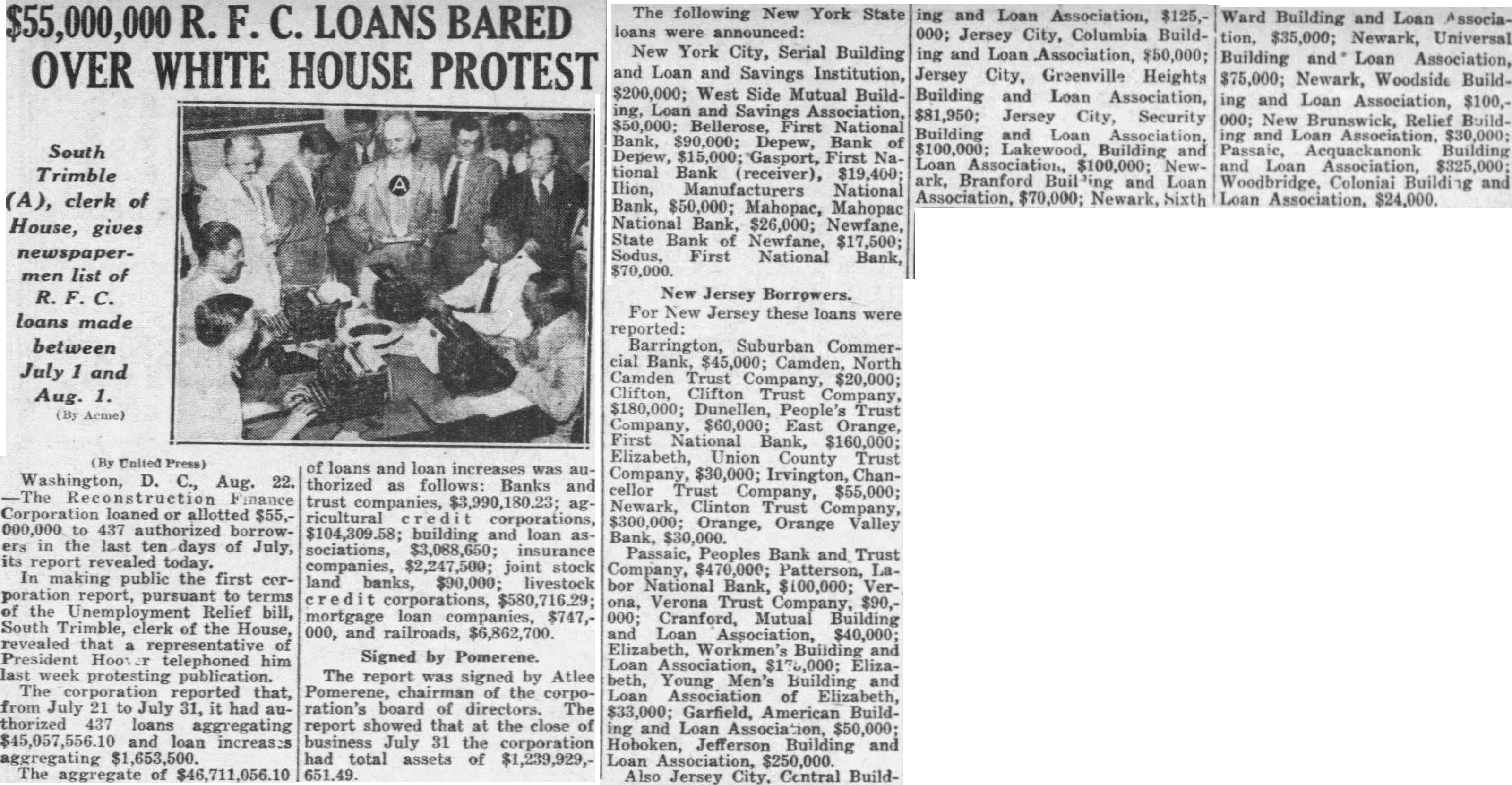 (By United Press) Washington, D. C., Aug. 22. -The Reconstruction Finance Corporation loaned or allotted $55,000,000 to 437 authorized borrowers in the last ten days of July, its report revealed today. In making public the first corporation report, pursuant to terms of the Unemployment Relief bill, South Trimble, clerk of the House, revealed that ร representative of President Hoo r telephoned him last week protesting publication. The corporation reported that, from July 21 to July 31, it had authorized 437 loans aggregating $45,057,556.10 and loan increases aggregating $1,653,500. The aggregate of $46,711,056.10 of loans and loan increases was authorized as follows: Banks and trust companies, $3,990,180.23; agricultural credit corporations, $104,309.58; building and loan associations, $3,088,650; insurance companies, $2,247,500; joint stock land banks, $90,000; livestock it corporations, $580,716.29; mortgage loan companies, $747,000, and railroads, $6,862,700.