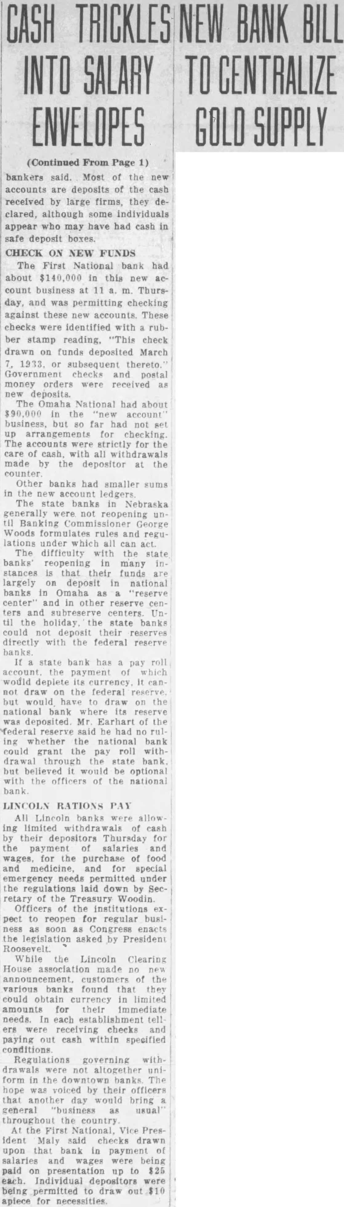 CASH BANK INTO SALARY CENTRALIZE ENVELOPES SUPPLY (Continued From Page bankers said. Most of the accounts are deposits of the cash received by large firms, they clared, although some individuals appear who may have had cash in deposit boxes. CHECK ON NEW FUNDS The First National bank had about $140,000 in this new count business Thursday, and was permitting checking against these accounts. These checks were identified with ber stamp reading, "This check drawn on funds deposited March subsequent thereto. Government checks and postal money orders received deposits. The Omaha National had about $90,000 the "new account business, 80 far had arrangements for The accounts strictly for the care cash, with all made by the depositor the counter Other banks had smaller sums in the ledgers. The state banks Nebraska not Woods rules and regulations under The difficulty with the banks' reopening many stances that their funds largely deposit in national banks Omaha "reserve center" and in other reserve and subreserve centers Unthe holiday state banks could deposit their reserves directly with the federal reserve state bank has account the payment would deplete its draw the federal reserve but would have draw national where its reserve deposited Mr. Earhart of federal reserve said he had ing whether the national bank could grant the pay roll withthrough the state bank but would be optional the officers of the national bank LINCOLN RATIONS PAY All Lincoln banks ing limited withdrawals cash their depositors Thursday for the payment salaries and wages, the purchase of food and medicine, special emergency needs permitted under the regulations laid down by Secretary of the Treasury Woodin Officers the pect to reopen for regular busisoon Congress enacts the legislation asked by President the Lincoln Clearing House association made customers of various banks found that they could obtain currency in limited amounts for their immediate needs. each establishment tell ers were receiving checks and paying out cash within specified conditions Regulations governing withwere altogether uniform the downtown banks The hope voiced by their officers that day would bring general "business as usual throughout the country First National, Vice President Maly said checks drawn upon that bank in payment salaries wages were being paid presentation up to $25 each. Individual depositors being permitted to out apiece for necessities.