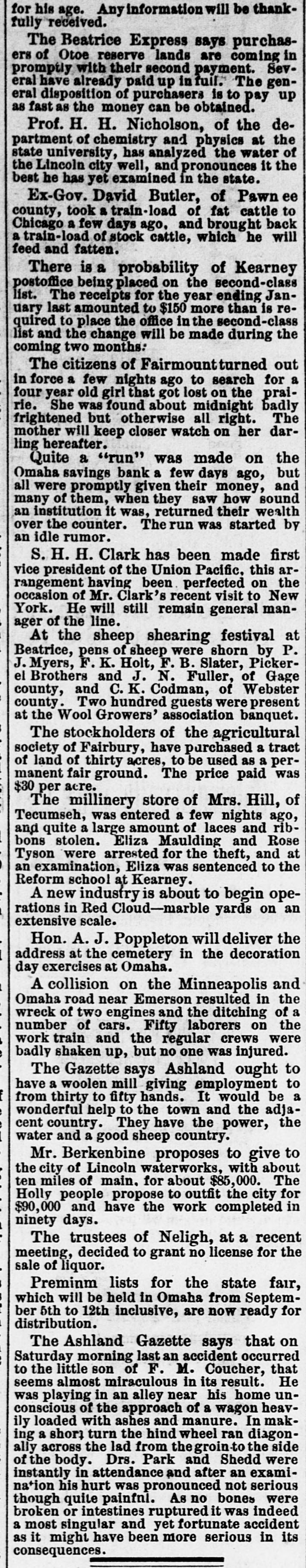for his age. Any information will be thankfully received. The Beatrice Express says purchasers of Otoe reserve lands are coming in promptly with their second payment. Several have already paid up in full. The general disposition of purchasers is to pay up as fast as the money can be obtained. Prof. H. H. Nicholson, of the department of chemistry and physics at the state university, has analyzed the water of the Lincoln city well, and pronounces it the best he has yet examined in the state. Ex-Gov. David Butler, of Pawn ee county, took a train-load of fat cattle to Chicago a few days ago, and brought back a train-load of stock cattle, which he will feed and fatten. There is a probability of Kearney postoffice being placed on the second-class list. The receipts for the year ending January last amounted to $150 more than is required to place the office in the second-class list and the change will be made during the coming two months: The citizens of Fairmount turned out in force a few nights ago to search for a four year old girl that got lost on the prairie. She was found about midnight badly frightened but otherwise all right. The mother will keep closer watch on her darling hereafter. Quite a "run" was made on the Omaha savings bank a few days ago, but all were promptly given their money, and many of them, when they saw how sound an institution it was, returned their wealth over the counter. The run was started by an idle rumor. S. H. H. Clark has been made first vice president of the Union Pacific, this arrangement having been perfected on the occasion of Mr. Clark's recent visit to New York. He will still remain general manager of the line. At the sheep shearing festival at Beatrice, pens of sheep were shorn by P. J. Myers, F. K. Holt, F. B. Slater, Pickerel Brothers and J. N. Fuller, of Gage county, and C. K. Codman, of Webster county. Two hundred guests were present at the Wool Growers' association banquet. The stockholders of the agricultural society of Fairbury, have purchased a tract of land of thirty acres, to be used as a permanent fair ground. The price paid was $30 per acre. The millinery store of Mrs. Hill, of Tecumseh, was entered a few nights ago, and quite a large amount of laces and ribbons stolen. Eliza Maulding and Rose Tyson were arrested for the theft, and at an examination, Eliza was sentenced to the Reform school at Kearney. A new industry is about to begin operations in Red Cloud-marble yards on an extensive scale. Hon. A. J. Poppleton will deliver the address at the cemetery in the decoration day exercises at Omaha. A collision on the Minneapolis and Omaha road near Emerson resulted in the wreck of two engines and the ditching of a number of cars. Fifty laborers on the work train and the regular crews were badly shaken up, but no one was injured. The Gazette says Ashland ought to have a woolen mill giving employment to from thirty to fifty hands. It would be a wonderful help to the town and the adjacent country. They have the power, the water and a good sheep country. Mr. Berkenbine proposes to give to the city of Lincoln waterworks, with about ten miles of main. for about $85,000. The Holly people propose to outfit the city for $90,000 and have the work completed in ninety days. The trustees of Neligh, at a recent meeting, decided to grant no license for the sale of liquor. Preminm lists for the state fair, which will be held in Omaha from September 5th to 12th inclusive, are now ready for distribution. The Ashland Gazette says that on Saturday morning last an accident occurred to the little son of F. M. Coucher, that seems almost miraculous in its result. He was playing in an alley near his home unconscious of the approach of a wagon heavily loaded with ashes and manure. In making a short turn the hind wheel ran diagonally across the lad from the groin to the side
