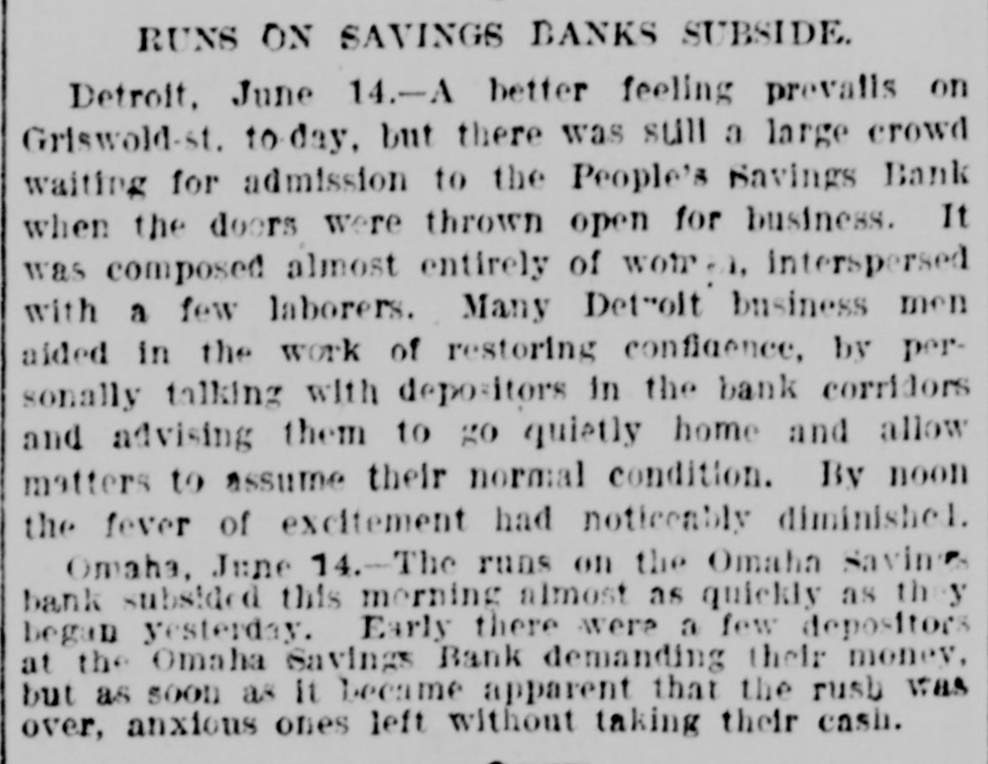 RUNS ON SAVINGS BANKS SUBSIDE. Detroit, June 14.-A better feeling prevails on Griswold-st. to day. but there was still a large crowd waiting for admission to the People's Savings Bank when the doors were thrown open for business. It was composed almost entirely of worrel, interspersed with a few laborers. Many Detrolt business men aided in the work of restoring configence, by personally talking with depositors in the bank corridors and advising them to go quietly home and allow matters to assume their normal condition. By noon the fever of excitement had noticeably diminished. Omaha, June 14.-The runs on the Omaha Savings bank subsided this morning almost as quickly as th y began yesterday. Early there were a few depositors at the Omaha Savings Bank demanding their money, but as SOOD as it became apparent that the rusb was over, anxious ones left without taking their cash.