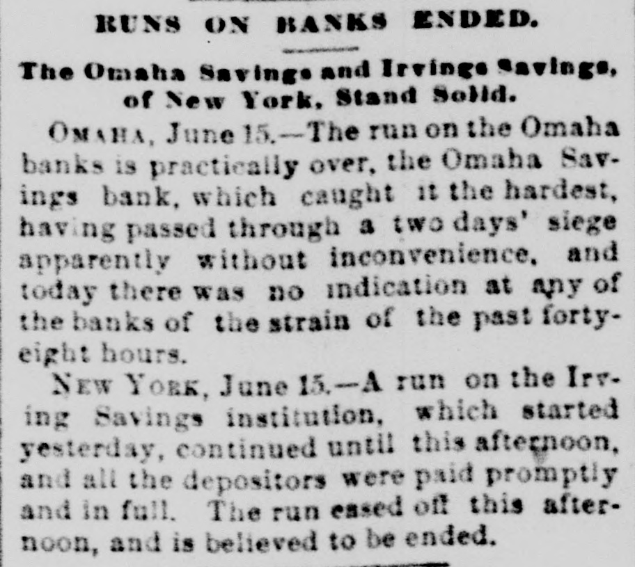 Multiple contemporary articles (June 13-15, 1893) report a heavy run on Omaha Savings Bank precipitated by the failure/suspension of McCague Savings Bank and the closing of the American National. Omaha Savings Bank paid depositors in cash and in full and the runs subsided within about two days; there is no evidence the Omaha Savings Bank suspended or closed.