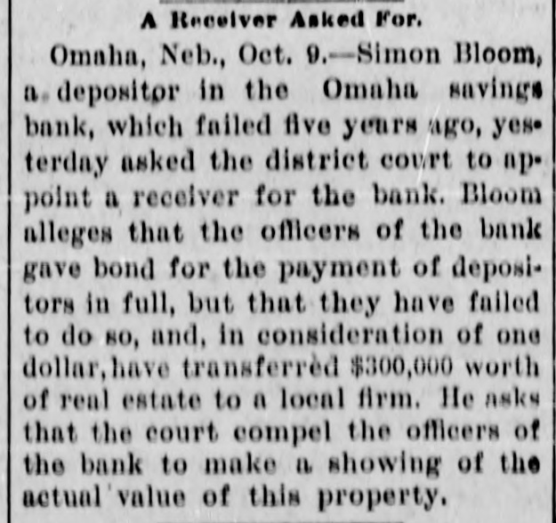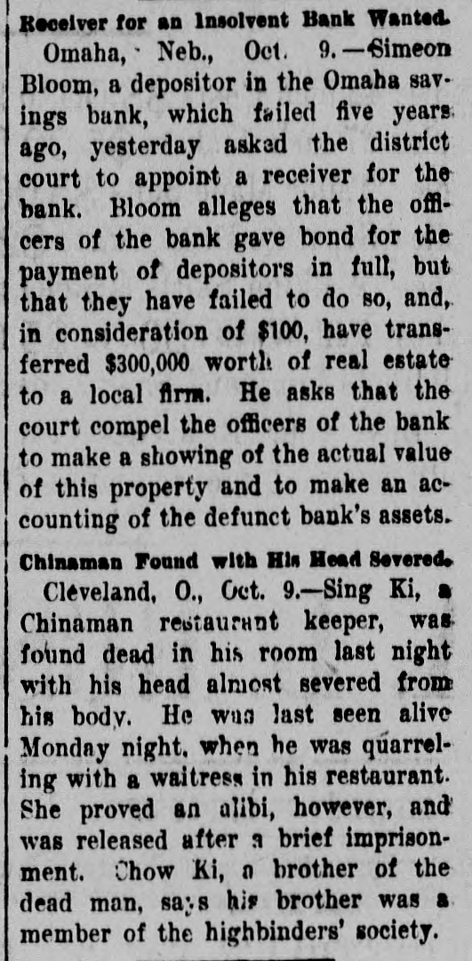 Receiver for an Insolvent Bank Wanted. Omaha, Neb., Oct. 9.-Simeon Bloom, a depositor in the Omaha savings bank, which failed five years. ago, yesterday asked the district court to appoint a receiver for the bank. Bloom alleges that the officers of the bank gave bond for the payment of depositors in full, but that they have failed to do so, and, in consideration of $100, have transferred $300,000 worth of real estate to a local firm. He asks that the court compel the officers of the bank to make a showing of the actual value of this property and to make an accounting of the defunct bank's assets. Chinaman Found with His Head Severed. Cléveland, O., Oct. 9.-Sing Ki, a Chinaman restaurant keeper, was found dead in his room last night with his head almost severed from his body. He was last seen alive Monday night. when he was quarreling with a waitress in his restaurant. She proved an alibi, however, and was released after a brief imprisonment. Chow Ki, a brother of the dead man, says his brother was a member of the highbinders' society.