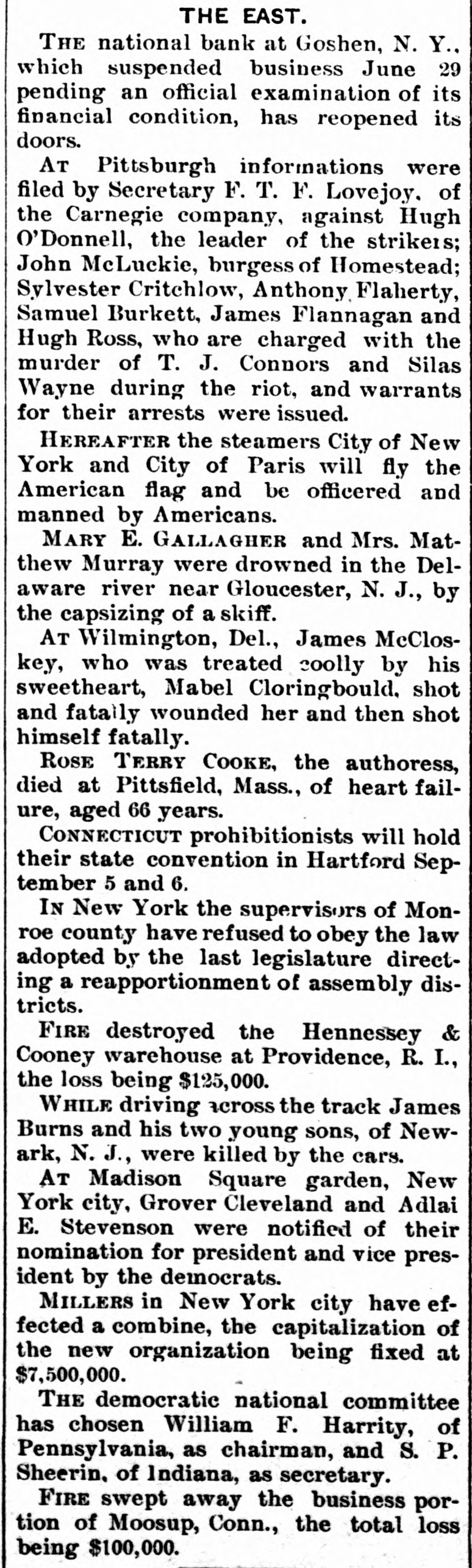 CASHIER MURRAY MISSING. 4 BAD STATE OF AFFAIRS IN THE GOSHEN NATIONAL BANK. Saturday's Run Followed Yesterday by the Announcement of the Bank's Suspension -Murray was also County Treasurer. GOSHEN. June 27.-The Goshen National Bank failed to open its doors for business at the usual hour this morning. The following notice was appended on its doors: By order of the Board of Directors of the National Bank, pending an examination of the books, securities. and accounts by the bank examiners, this bank will be closed. The directors desire to say to the depositors and the public that a somewhat hasty examination has been made by them. and nothing has been discovered which renders doubtful speedy payment in full to all the depositors. and it is now expected that the bank will be open for the regular transaction of business in a few days." William M. Murray. the cashier of the bank. is missing. and is said to be in New York. At a special meeting of the directors held on Thursday it was discovered that the bank had been making loans to Mr. Murray and others on insufficient securites, and that its finances were in a very confused and unsatisfactory condition. At another meeting of the directors held on Saturday it was decided that the institution be closed pending an official investigation of its affairs. Bank Examiner E. M. Gettman arrived this morning and began the investigation. Cashier Murray is n son of the late Congressman William Murray. a former President of the bank. Murray is also Treasurer of Orange county. His friends say he has acted strangely of iate. and they believe that his mind is affected. He returned from New York last night. but left again this morning. and his present whereabouts are unknown. It is said that before leaving home this morning he filed his resignation of the post of County Treasurer. All sorts of rumors are current concerning the actual condition of the bank. It is generally reported that there is a shortage of from $50,000 to $60.000. The capital stock of the bank is $110.000. and its surplus about $22,000. The surplus is believed to have been sunk and the capital seriously impaired. The directors are wealthy men. so it is believed that the impairment of the capital will be made good and the bank resume business. The funds of the county in Trensurer Murray's hands are believed to be intact. It is said here that Cashier Murray and his family have been living extravgantly for some years past, and that his expenses have considerably exceeded his income. He recently built a house at a cost of $15,000. and fitted it with expensive furniture. This and other extravagances are mentioned as accounting in a large degree for his present financial troubles. Cashier Murray was out of town several days last week.and his absence caused alarm among depositors when it became known. This feeling of distrust increased until Saturday. when there was a small-sized run on the bank. Over $30,000 were withdrawn during the latter hours of the day. The Hon. Henry Bacon. counsel for the bank. hastened home from Washington when he heard of Murray's disappearance, and took charge of affairs. He foresaw that it would be impracticable to stand a second day's run like that of Saturday, and upon his advice it was decided to announce the temporary suspension of business. The last report of the bank was made on May 17. The resources were then placed at $446,938. including $110,000 capital stock. $22,000 surplus. $10.711 undivided profits, and $254,314 individual profits. Mr. Bacon said to-day that he was of the opinion that the surplus and undivided profits would be wiped out of existence. and it was possible an assessment on stock might be necessary to clear up the deficiency. He thought $40,000 would be a high estimate. This shortage. he did not think. was due to anything the cashier had done. but rather