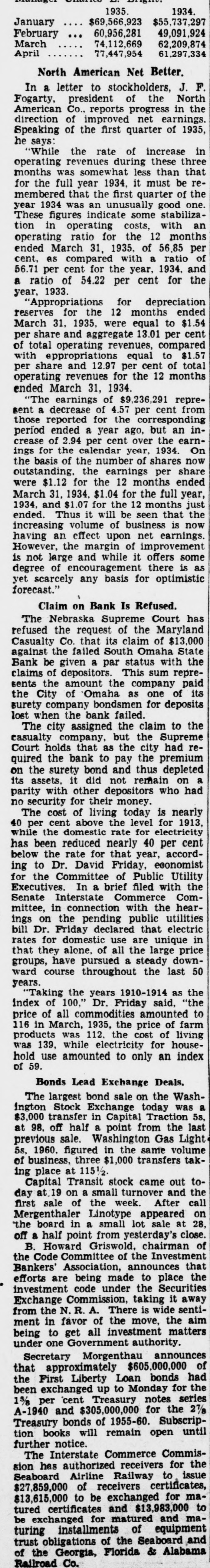 vanuages 1935 1934. $69,566,923 $55,737,297 January 49,091,924 60,956,281 February March 62,209,874 74,112,669 April 77,447,954 61,297,334 North American Net Better. In a letter to stockholders, J. F. Fogarty, president of the North American Co., reports in improved net of the first of 1935, Speaking direction of quarter progress earnings. the he says: 'While the rate of increase in operating revenues during these three months was somewhat less than that for the full year 1934, it must be remembered that the first quarter of the year 1934 was an unusually good one. These figures indicate some stabilization in operating costs, with an operating ratio for the 12 months ended March 31. 1935. of 56.85 per cent, as compared with a ratio of 56.71 per cent for the year. 1934, and a ratio of 54.22 per cent for the year, 1933. Appropriations for depreciation reserves for the 12 months ended March 31, 1935, were equal to $1.54 per share and aggregate 13.01 per cent of total operating revenues, compared with eppropriations equal to $1.57 per share and 12.97 per cent of total operating revenues for the 12 months ended March 31, 1934. "The earnings of $9,236,291 represent a decrease of 4.57 per cent from those reported for the corresponding period ended a year ago, but an increase of 2.94 per cent over the earnings for the calendar year, 1934. On the basis of the number of shares now outstanding. the earnings per share were $1.12 for the 12 months ended March 31, 1934, $1.04 for the full year, 1934, and $1.07 for the 12 months just ended. Thus it will be seen that the increasing volume of business is now having an effect upon net earnings. However, the margin of improvement is not large and while it offers some degree of encouragement there is as yet scarcely any basis for optimistic forecast. Claim on Bank Is Refused. The Nebraska Supreme Court has refused the request of the Maryland Casualty Co. that its claim of $13,000 against the failed South Omaha State Bank be given a par status with the claims of depositors. This sum represents the amount the company paid the City of Omaha as one of its surety company bondsmen for deposits lost when the bank failed. The city assigned the claim to the casualty company, but the Supreme Court holds that as the city had required the bank to pay the premium on the surety bond and thus depleted its assets, it did not remain on a parity with other depositors who had no security for their money. The cost of living today is nearly 40 per cent above the level for 1913, while the domestic rate for electricity has been reduced nearly 40 per cent below the rate for that year, according to Dr. David Friday, economist for the Committee of Public Utility Executives. In a brief filed with the Senate Interstate Commerce Committee, in connection with the hearings on the pending public utilities bill Dr. Friday declared that electric rates for domestic use are unique in that they alone, of all the large price groups, have pursued a steady downward course throughout the last 50 years. years 1910-1914 100," Dr. to index price "Taking of of all the commodities Friday amounted said, as "the the 116 in March, 1935, the price of farm products was 112. the cost of living was 139, while electricity for household use amounted to only an index of 59. Bonds Lead Exchange Deals. The largest bond sale on the Washington Stock Exchange today was a $3,000 transfer in Capital Traction 5s, at 98, off half a point from the last previous sale. Washington Gas Light 5s, 1960, figured in the same volume of business, three $1,000 transfers taking place at 1151/2. Capital Transit stock came out today at.19 on a small turnover and the first sale of the week. After call Mergenthaler Linotype appeared on the board in a small lot sale at 28, off a half point from yesterday's close. B. Howard Griswold, chairman of the Code Committee of the Investment Bankers' Association, announces that efforts are being made to place the investment code under the Securities Exchange Commission, taking it away from the N. R A. There is wide sentiment in favor of the move, the aim being to get all investment matters under one Government authority. Secretary Morgenthau announces that approximately $605,000,000 of the First Liberty Loan bonds had been exchanged up to Monday for the 1 per 'cent Treasury notes series A-1940 and $305,000,000 for the 2 1/8 Treasury bonds of 1955-60. Subscription books will remain open until further notice. The Interstate Commerce Commission has authorized receivers for the Seaboard Airline Railway to issue $27,859,000 of receivers certificates, $13,615,000 to be exchanged for matured certificates and $13,983,000 to be exchanged for matured and maSeaboard turing trust obligations installments of the of equipment and of the Georgia, Florida & Alabama Railroad Co.