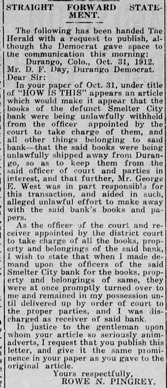STATEFORWARD STRAIGHT MENT. The following has been handed The Herald with a request to publish, although the Democrat gave space to the communication this morning: Durango, Colo., Oct. 31, 1912. Mr. D. F. Day, Durango Democrat. Dear Sir: In your paper of Oct. 31, under title of "HOW IS THIS" appears an article which would make it appear that the books of the defunct Smelter City bank were being unlawfully withheld from the officer appointed by the court to take charge of them, and all other things belonging to said bank-that the said books were being unlawfully shipped away from Durango, so as to keep them from the said officer of court and parties in interest, and that further, Mr. George E. West was in part responsible for this transaction, and aided in such, alleged unlawful effort to make away with the said bank's books and papers. As the officer of the court and receiver appointed by the district court to take charge of all the books, property and belongings of the said bank, I wish to state that when I made demand upon the officers of the said Smelter City bank for the books. property and belongings of same, they were at once promptly turned over to me and remained in my possession until delivered up by order of court to the proper parties, and I was discharged as receiver of said bank. In justice to the gentleman upon whom your article so seriously animadverts, I request that you publish this letter, and give it the same prominence in your paper as you gave to the original article. Yours respectfully, ROWE N. PINGREY.