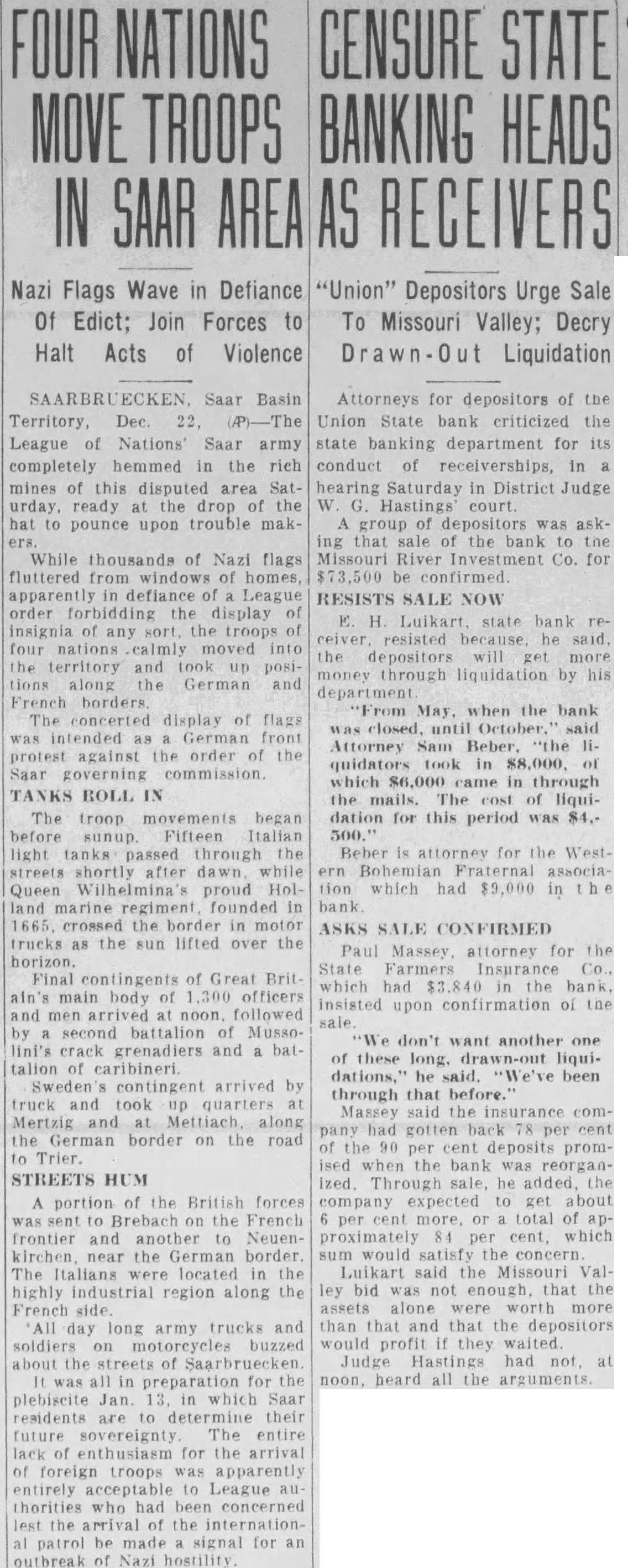 E½ 3-30-14 Holt County. Reported to be clear fo encumbrances except 1933 taxes. County, Iowa. Subject to encumbrances of record. All real estate to be sold OTHER ASSETS: Tomes, Geo. charged off note, $700. Thompson, & Nellie, rent note, $38. Gorgen, Frank Bertha, Bal. due on real estate contract, $700. STOCKHOLDER'S CONSTITUTIONAL LIABILITY: All right, title and interest in and to the contingent claims for constitutional double liability against stockholders of the Union State Bank, Omaha, Nebraska, under the provisions of Sec. of Article XII of the Constitution of the State of Nebraska, and other provisions of said constitution and the laws of said state, to include the right to commence, maintain and prosecute any suitable action, either in law or in equity for the collection thereof, in any cuort or courts of competent jurisdiction, in the name of the receiver, in the name of the assignee of said claims, or the name of the successors of said assignee, with full and complete subrogation of the rights of the receiver and the rights of the creditors of said bank in said action, said contingent claims for constitutional liability of stockholders being as follows, to-wit: All of the double liability of all stockholders of said bank as fully listed and itemized in Exhibit attached to the application of the receiver to sell the assets of said bank now on file in the District Court of Douglas CounNebraska. The above list of assets subject to any change before time of sale. The above assets will be offered both separately and also as whole. Full lists of note, judgments and other assets will found in the office of the Clerk of the District Court of said county, and all notes subject to inspection at the fice of the Receivership vision of the Department Banking of the State of braska, in the State House, Lincoln, Nebraska. All property herein adver tised for sale is subject to dation prior to date of sale. Application to confirm sale will be made to the court after date of sale. Said sale shall be for by law provided. Dated this 26th day of tember, 1934. DEPARTMENT OF Receiver and Liquidating Agent of the State Bank, Omaha, braska by E. H. Superintendent of Banks. Sept. 28 Oct