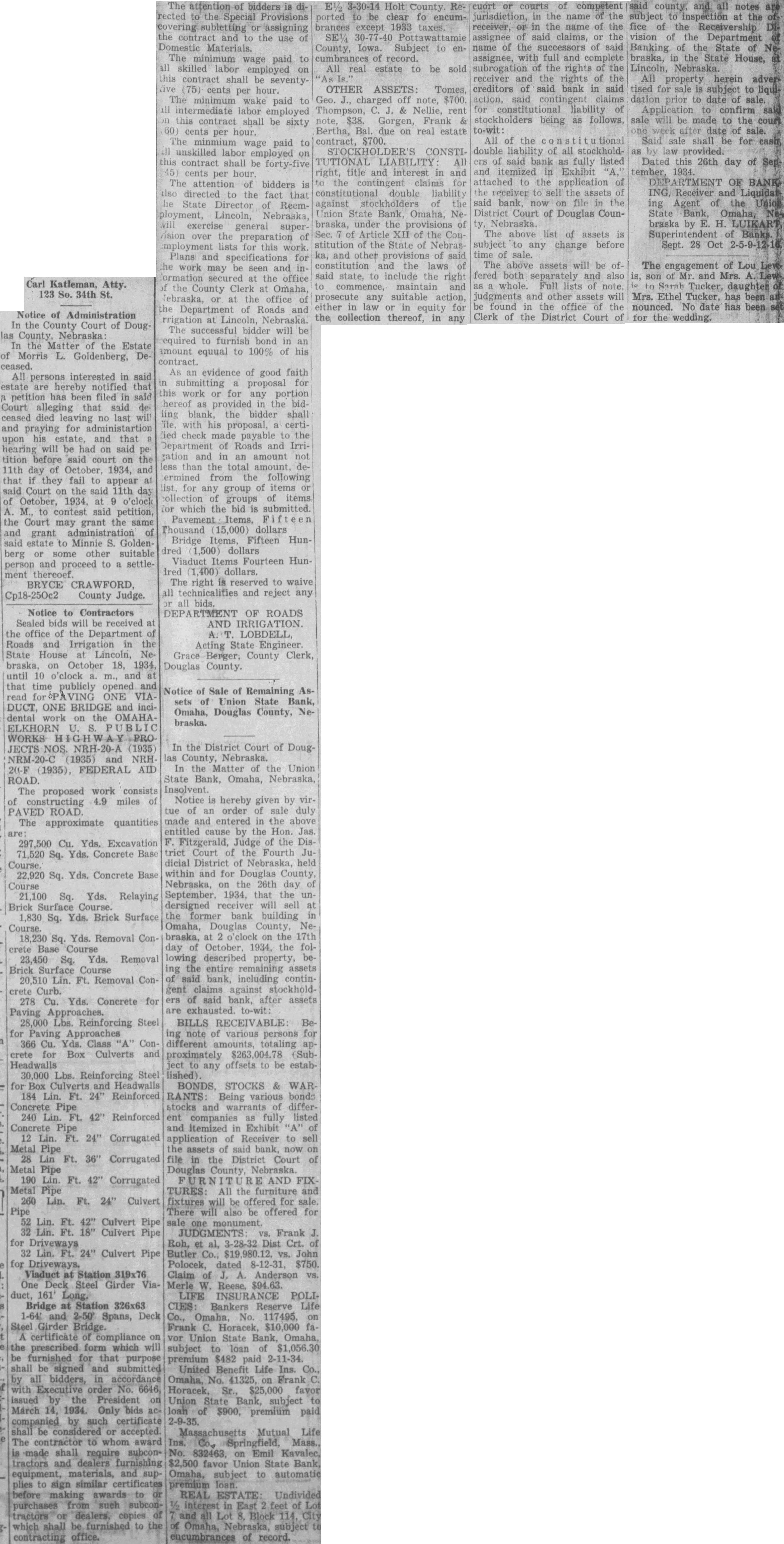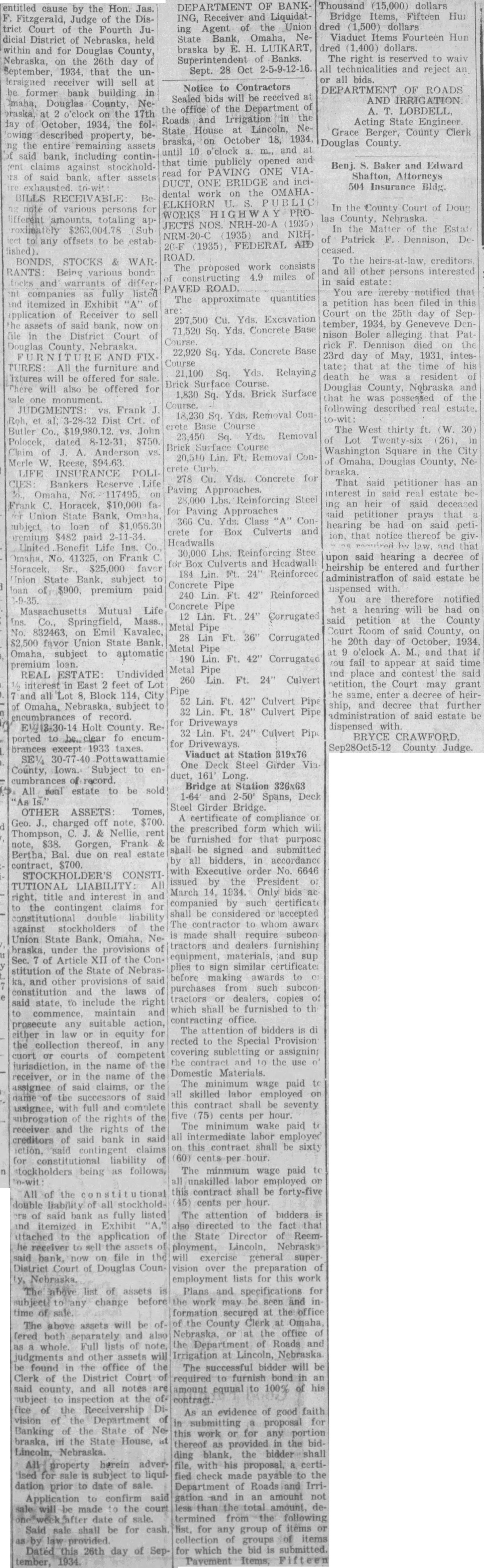 In the District Court of Douglas County, Nebraska. In the Matter of the Union State Bank, Omaha, Nebraska, Insolvent. Notice is hereby given by virtue of an order of sale duly made and entered in the above entitled cause by the Hon. Jas Fitzgerald, Judge of the District Court of the Fourth Judicial District of Nebraska, held within and for Douglas County, Nebraska, on the 26th day of September, 1934, that the undersigned receiver will sell at the former bank building in Omaha, Douglas County, Nebraska, at o'clock on the 17th day of October, 1934, the following described property, being the entire remaining assets of said bank, including contingent claims against stockholdof said bank, after assets are exhausted. to-wit: BILLS RECEIVABLE: Being note of various persons for different amounts, totaling approximately $263,004.78 (Subject to any offsets to be established). BONDS, STOCKS & RANTS Being various bonds stocks and warrants of different companies as fully listed and itemized in Exhibit "A" of application of Receiver to sell the assets of said bank, now on file in the District Court of Douglas County, Nebraska. AND FIXTURES: All the furniture and fixtures will be offered for sale. There will also be offered for sale one monument. JUDGMENTS Frank Roh, et al, 3-28-32 Dist Crt. of Butler Co., vs. John Polocek, dated 8-12-31, $750. Claim of Anderson Merle W. Reese, $94.63. LIFE INSURANCE POLICIES: Bankers Reserve Life Co., Omaha, No. 117495, on Frank C. Horacek, $10,000 vor Union State Bank, Omaha, subject to loan of $1,056.30 premium $482 paid 2-11-34. United Benefit Life Ins. Co., Omaha, No. 41325, on Frank Horacek, Sr., $25,000 favor Union State Bank, subject to loan of $900, premium paid 2-9-35. Massachusetts Mutual Life Ins. Co., Springfield, Mass., No. 832463, on Emil Kavalec, favor Union State Bank, Omaha, subject to automatic premium loan. REAL ESTATE: Undivided interest in East feet of Lot all Block Omaha, Nebraska, subject encumbrances of record.