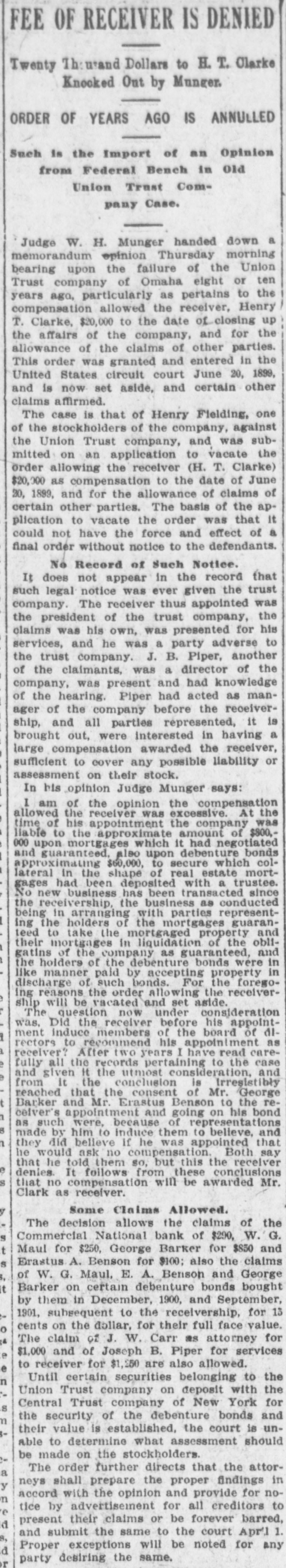 FEE OF RECEIVER IS DENIED Twenty Thousand Dollars to H. T. Clarke Knocked Out by Munger. ORDER OF YEARS AGO IS ANNULLED Such is the Import of an Opinion from Federal Bench in Old Union Trust Company Case. : Judge W. H. Munger handed down a memorandum opinion Thursday morning bearing upon the failure of the Union Trust company of Omaha eight or ten years ago, particularly as pertains to the compensation allowed the receiver, Henry T. Clarke, $20,000 to the date of closing up the affairs of the company, and for the allowance of the claims of other parties. This order was granted and entered in the United States circuit court June 20, 1899, and is now set aside, and certain other claims affirmed. The case is that of Henry Fielding, one of the stockholders of the company, against the Union Trust company, and was submitted on an application to vacate the order allowing the receiver (H. T. Clarke) $20,000 as compensation to the date of June 20, 1899, and for the allowance of claims of certain other parties. The basis of the application to vacate the order was that It could not have the force and effect of a final order without notice to the defendants. No Record of Such Notice. It does not appear in the record that such legal notice was ever given the trust company. The receiver thus appointed was the president of the trust company, the claims was his own, was presented for his services, and he was a party adverse to the trust company. J. B. Piper, another of the claimants, was a director of the company, was present and had knowledge of the hearing. Piper had acted as manager of the company before the receivership, and all parties represented, it is brought out, were interested in having a large compensation awarded the receiver, sufficient to cover any possible liability or assessment on their stock. In his opinion Judge Munger says: I am of the opinion the compensation allowed the receiver was excessive. At the time of his appointment the company was liable to the approximate amount of $800,000 upon mortgages which it had negotiated and guaranteed. also upon debenture bonds approximating $60,000, to secure which collateral in the shape of real estate mortgages had been deposited with a trustee. No new business has been transacted since the receivership, the business as conducted being in arranging with parties representing the holders of the mortgages guaranteed to take the mortgaged property and their mortgages In liquidation of the obligatins of the company as guaranteed, and the holders of the debenture bonds were in like manner paid by accepting property in discharge of such bonds. For the foregoing reasons the order allowing the receivership will be vacated and set aside. The question now under consideration was. Did the receiver before his appointment induce members of the board of dlrectors to recommend his appointment as receiver? After two years I have read carefully all the records pertaining to the case and given It the utmost consideration, and from it the conclusion is Irresistibly reached that the consent of Mr. George Barker and Mr. Erastus Benson to the receiver's appointment and going on his bond as such were. because of representations made by him to induce them to believe, and they did believe if he was appointed that he would ask no compensation. Both say that he told them so, but this the receiver denies. It follows from these conclusions that no compensation will be awarded Mr. Clark as receiver. Some Claims Allowed. The decision allows the claims of the S Commercial National bank of $290, W. G. Maul for $250, George Barker for $850 and S Erastus A. Benson for $100; also the claims of W. G. Maul, E. A. Benson and George Barker on certain debenture bonds bought by them in December, 1900, and September, 1901, subsequent to the receivership, for 13 cents on the dollar, for their full face value. The claim of J. W. Carr as attorney for $1,000 and of Joseph B. Piper for services to receiver for $1,250 are also allowed. Until certain securities belonging to the C Union Trust company on deposit with the Central Trust company of New York for S the security of the debenture bonds and n their value is established, the court is unable to determine what assessment should be made on the stockholders. The order further directs that the attora neys shall prepare the proper findings in accord with the opinion and provide for non tice by advertisement for all creditors to present their claims or be forever barred, d and submit the same to the court Apr'l 1. Proper will noted