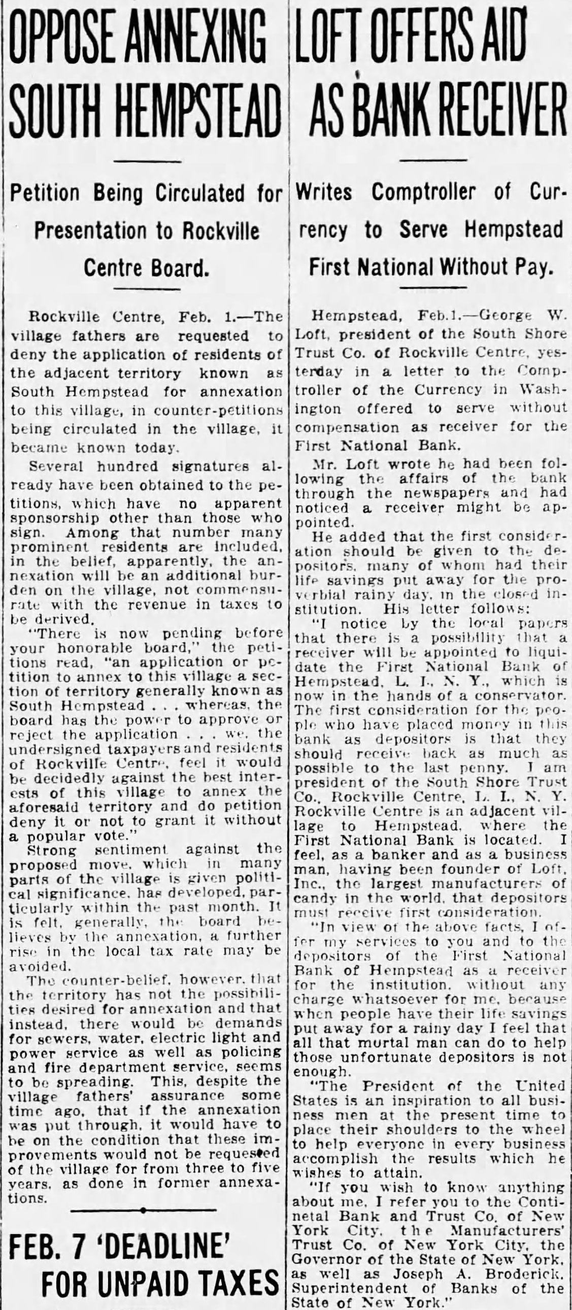 Hempstead, W Loft, president the South Shore Trust Co. of Rockville Centre, terday letter the Comp. troller the Currency in Washington offered to serve without receiver for the First National Bank. Mr. Loft had been lowing affairs through newspapers had noticed might be pointed added that the first conside ation should given to the positors. had the stitution. His follows: notice by papers that there possibility liquiNational Bank which The placed money should much possible the adjacent the National Bank banker founder of largest candy and to National Bank of institution any day murtal those depositors enough President of the United their to to help business the results which he attain. you to know anything about the Bank and Trust of York City Trust York City. Governor of the State of York. Joseph Broderick. Superintendent Banks of the State of