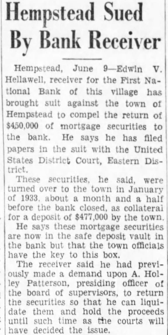 Hempstead, June 9-Edwin Hellawell, receiver for the First National Bank this village has brought suit against the town of Hempstead to compel the return of $450,000 of mortgage securities the bank. He says he has filed papers in the suit with the United States District Court, Eastern DisThese securities, he said, were turned to the 1933, about and before the closed, for deposit by the town. He says these securities the deposit vault the bank but that the town officials the key said he had previmade Holley Patterson, presiding officer of the board supervisors, to return the securities that he can liquithem and hold the proceeds until time the courts will decided the issue.