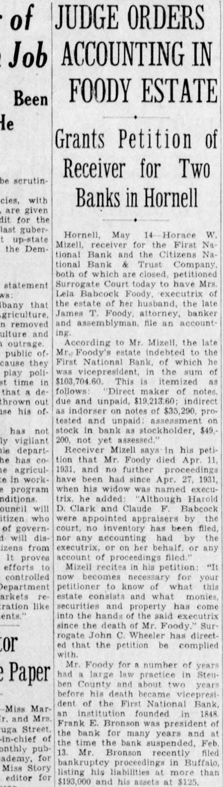 DIRECTORS CLOSE BANK AT HORNELL Federal Examiner in Charge; Two Other Institutions Announce Merger. Special the BUFFALO EVENING NEWS. HORNELL Feb. First National bank did not open for business Monday At M. Sunday the following notice was posted upon the door the Closed by order of the board of directors. This bank in charge of National Bank Examiner Connor.' The notice dated Feb. 13. Following closing of the bank came an official merger Citizens' National Bank Trust company and the Steuben Trust company result complete the banking complexion While could add nothing to notice posted bank. known that business will be done under his jurisdiction cept receive money due on loans and employes been duty, the pointed the comptroller of currency, Pole Interests Protected. Records assets and liabilities being and such cases usually takes from six months to President F. Bronson could not be his has been three but Henry. issued the following statement "It was deemed advisable the board of directors close the order to protect the interests the depositors. By further run on the will be avoided preference Rumors that First National was to close current in the city Saturday Sunday but nothing was known officially until the notice posted upon door. Crowds gathered in front the bank Sunday night after the The bank founded by the Adsit leading this section. and remained their control unthe death of Charles Adsit few years With Bank 30 Years. President Bronson has been the for 30 years and the institution has always been garded one of the strongest banks officers of the bank include: (Continued on Page Column 1.)