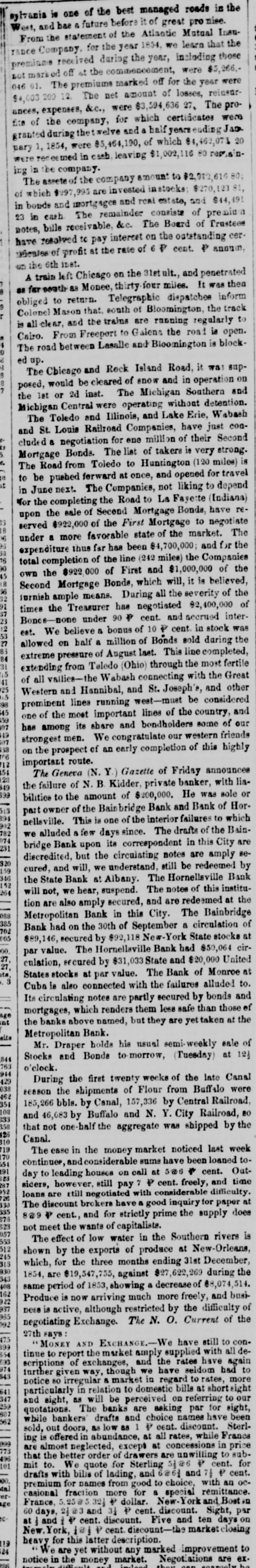 sylvania is one of the best managed reads in the West, and has a future before it of great pro nise. From the statement of the Atlantic Mutual Insurance Company, for the year 1854, we learn that the premiums received during the year, including those -'996'98 eq: 19 # po 10% 046 01. The premiums marked off for the year were 10 junome 194 eas 10. 209 800'*$ ances, expenses, &c., were $3,594,636 27, The profits of the company, for which certificates were our Super there J189 . pus exter the Supp granted 0% vhhich Jo area 1854 'I Cred were deemed in cash, leaving $1,002,116 80 regisinequal us But of ;unome Company eq: so Basete "4" '18 invoited are 966'268' 10 in bonds and mortgages and real estate, and $44,491 23 in cash The remainder consists of premium notes, bills receivable, &c. The Board of Trustees -190 eq: uo And 01 DATE 'mmous & 0000 4 9 jo THE eq: 18 190.1₫ jo service 1801 419 eq: A train left Chicago on the 31stult., and penetrated the SUM " raof 88 ques Jaj # obliged to return. Telegraphic dispatches inform Colonel Mason that, south of Bloomington, the track is all clear, and the trains are running regularly to Cairo. From Freeport to alena the road is open. The road between Lasalle and Bloomington is blockdn pe The Chicago and Rock Island Road, it was supposed, would be cleared of snow and in operation on the 1st or 2d inst. The Michigan Southern and Michigan Central were operating without detention. The Toledo and Illinois, and Lake Erie, Wabash and St. Louis Railroad Companies, have just concluded a negotiation for ene million of their Second Mortgage Bonds. The list of takers is very strong. The Road from Toledo to Huntington (120 miles) is to be pushed ferward at once, and opened for travel $ in June next. The Companies, not liking to depend for the completing the Road to La Fayette (Indiana) upon the sale of Second Mortgage Bonds, have reserved $922,000 of the First Mortgage to negotiate under a more favorable state of the market. The expenditure thus far has been $4,700,000; and for the total completion of the line (242 miles) the Companies jo 000'000'1$ pus jo 000 $922 the UMO Second Mortgage Bonds, which will, it is believed, furnish ample means. During all the severity of the times the Treasurer has negotiated $2,400,000 of Bones-none under 90 P cent. and accrued interest. We believe a bonus of 10 P cent. in stock was allowed on half a million of Bonds sold during the extreme pressure of August last. This line completed, extending from Teledo (Ohio) through the most fertile of all vallies-the Wabash connecting with the Great Western and Hannibal, and St. Joseph's, and other 86 prominent lines running west-must be considered 94 one of the most important lines of the country, and 691 has among its share and bondholders some of our 611 strongest men. We congratulate our western friends 89 on the prospect of an early completion of this highly 904 important route. 214 The Geneva (N. Y.) Gazette of Friday announces the failure of N. B. Kidder, private banker, with lia611 669 bilities to the amount of $200,000. He was sole or 815 part owner of the Bainbridge Bank and Bank of Hor$68 nellsville. This is one of the interior failures to which 202 782 we alluded a few days since. The drafts of the Bain120 bridge Bank upon its correspondent in this City are 197 discredited, but the circulating notes are amply se028 cured, and will, we understand, still be redeemed by 691 919 the State Bank at Albany. The Hornellaville Bank 142 $61 will not, we hear, suspend. The notes of this institution are also amply secured, and are redeemed at the 880 Metropolitan Bank in this City. The Bainbridge 385 Bank had on the 30th of September a circulation of 702 900 $89, secured by $92,118 New-York State stocks at 00 par value. The Hornellaville Bank had $50,064 cirLZ culation, secured by $31,033 State and $20,000 United '12 States stocks at par value. The Bank of Monroe at S Cuba is also connected with the failures alluded to. Its circulating notes are partly secured by bonds and mortgages, which renders them less safe than those of 979 sur the banks above named, but they are yet taken at the Metropolitan Bank. **** Mr. Draper holds his usual semi-weekly sale of 118 Stocks and Bonds to morrow, (Tuesday) at 121 894 o'clock. H6 429 During the first twenty weeks of the late Canal 880 season the shipments of Flour from Buffalo were 291 199 185,266 bbls. by Canal, 157,336 by Central Railroad, 801 08 AND 'A 'N pus sq 46,08 pus $33 898 that not one-half the aggregate was shipped by the 921 Canal. 018 614 The ease in the money market noticed last week 021 continues, and considerable sums have been loaned to199 161 day to leading houses on call at 5@6 + cent. Out82 siders, however, still pay 7 P cent. freely, and time loans are still negotiated with considerable difficulty. 921 The discount brokers have a good inquiry for paper at 988 8@9 P cent., and for strictly prime the supply does 925 825 not meet the wants of capitalists. The effect of low water in the Southern rivers is 899 512 shown by the exports of produce at New-Orleans, 215 818 which, for the three months ending 31st December, 030 1854, are $19,547,755, against $27,622,269 during the as 801 same period of 1853, showing a decrease of 88,074,514. 191 Produce is now arriving much more freely, and busi226 ness is active, although restricted by the difficulty of 996 negotiating Exchange. The N. O. Current of the 260 SAFE 9714 945 MONEY AND EXCHANGE.-We have still to con668 199 tinue to report the market amply supplied with all de$69 scriptions of exchanges, and the rates have again 01 paq mopies easy 0M though 'Sum diven SMS notice 80 irregular a market in regard to rates, more 119 particularly in relation to domestic bills at short 347 and sight, as will be perceived on referring to our 299 quotations. The banks are asking par for sight, 209 while bankers drafts and choice names have been 299 sold, out doors, as low as 1 P cent. discount. Sterling is