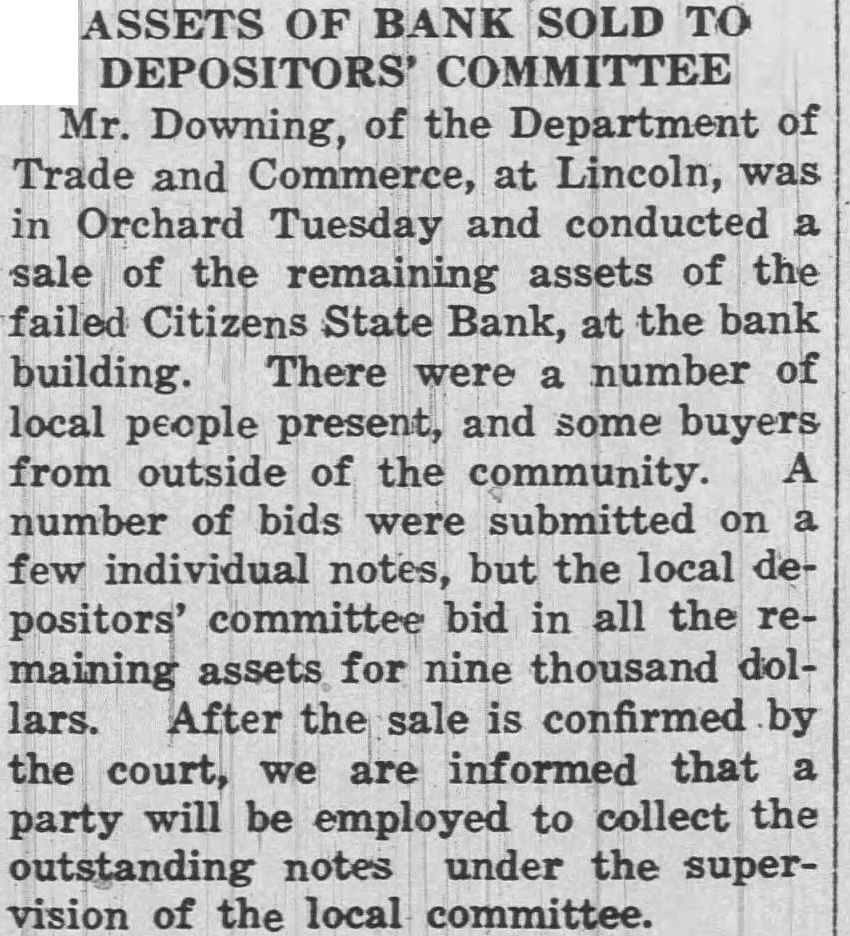 ASSETS OF BANK SOLD TO DEPOSITORS' COMMITTEE Mr. Downing, of the Department of Trade and Commerce, at Lincoln, was in Orchard Tuesday and conducted sale of the remaining assets of the failed Citizens State Bank, at the bank building. There were number of local people present, and some buyers from outside of the community. number of bids were submitted on few individual notes, but the local positors' committee bid in all the maining assets for nine thousand dollars. After the sale is confirmed by the court, we are informed that party will be employed to collect the outstanding notes under the supervision of the local committee.