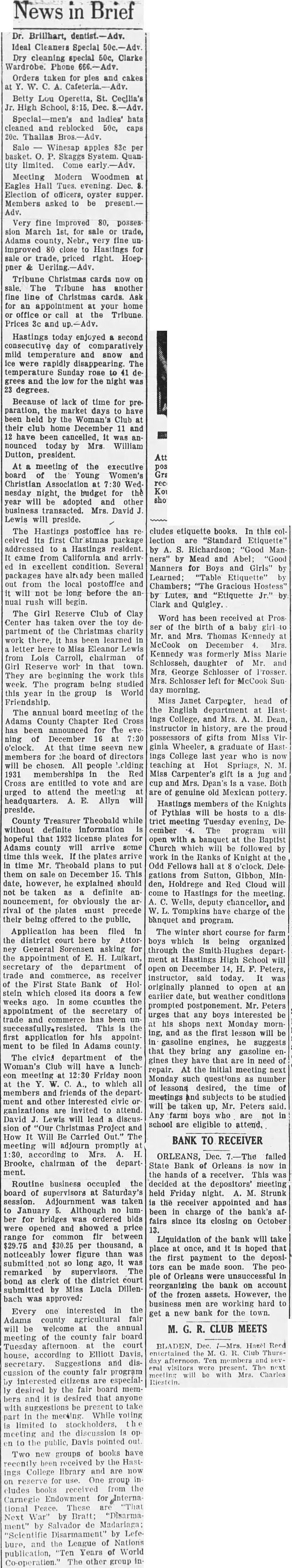 Hastings today enjoyed a second consecutive comparatively mild temperature snow ice were rapidly disappearing. The temperature Sunday rose 41 deand the low for the night was degrees. Because of lack of time for preparation, the market days have been held the Woman's Club at their club home December 11 and 12 have been cancelled, it an nounced today Mrs William Dutton, president. At meeting of the executive of the Young Women's Christian at Wedthe budget for the year will be and other business transacted. Mrs. David Lewis preside. The Hastings postoffice has received first stmas package addressed to Hastings resident. came from California and arriv ed in excellent condition. Several packages have been mailed out from the local postoffice and will not be long before the an rush will begin. The Girl Reserve Club of Clay Center has taken over the toy department of the charity work has in letter here Eleanor Lewis from Carroll, of Girl in that They beginning the this week. program being studied this year the group is World The board meeting of the Adams County Chapter Red Cross has been announced for the eve ning December at 7:30 o'clock. At time seevn new members for the board directors will be chosen. All people .clding 1931 memberships the Red Cross are entitled vote are urged attend the meeting headquarters. Allyn will preside. County Treasurer Theobald while without definite information hopeful that 1932 license plates for Adams county will arrive some week. plates arrive time Mr. Theobald plans to put them sale December 15. This date however, explained should not be taken definite an nouncement, for obviously the ar rival the plates must precede their being offered to the public. Application has been filed in the district here by General asking for the appointment of Luikart, secretary department trade as of the First State Bank of Holstein which closed doors few weeks ago. some counties the appointment of the secretary trade and commerce been unThis is the first application for his appoint ment be filed in Adams county The civics department the will have lunch meeting Friday the to which members and friends of the department and other interested civic ganizations are invited to attend David will lead discussion of "Our Christmas Project and How Will Be The will promptly Brooke, chairman of the department.