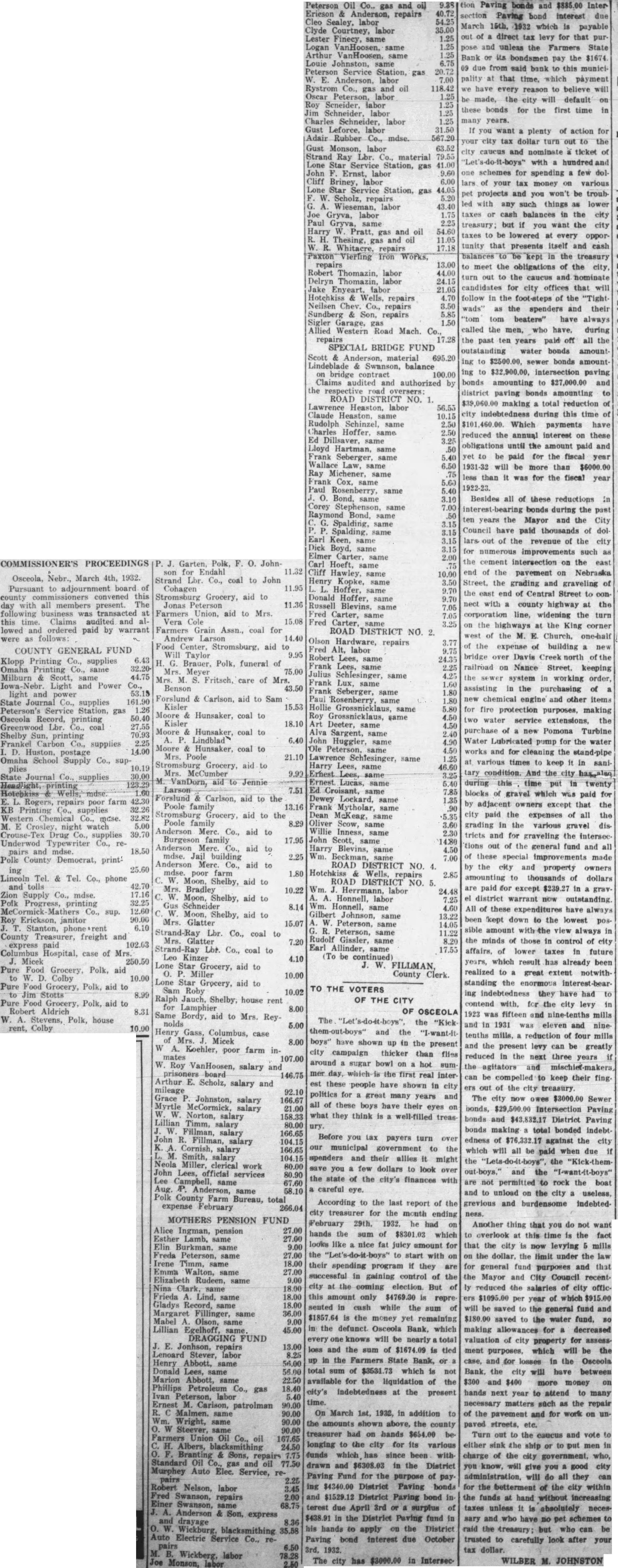 COMMISSIONER'S PROCEEDINGS Osceola, Nebr., March 4th, 1932. Pursuant to adjournment board of county convened this day with all members present. The following business transacted this time. Claims audited and allowed and ordered paid by warrant were as follows: COUNTY GENERAL FUND Klopp Printing Co., supplies 6.43 Omaha Printing same 32.20Milburn Scott, same 44.75 Iowa-Nebr. Light and Power light and 53.15 power State Journal Co., supplies Peterson's Station, gas 1.26 Osceola Record, printing 50.40 Greenwood Lbr. coal 27.55 Shelby Sun, printing 70.93 Frankel Carbon Co., supplies 2.25 Huston, postage 14.00 Omaha School Supply Co., supplies 10.19 State Journal Co., supplies 30.00 printing 123.29 Hotebkiss 1.60 Rogers, repairs poor farm 42.30 KB Printing supplies 32.26 Western Chemical Co., mcse. 32.82 M. Crosley, night watch 5.00 Drug Co., supplies 39.70 Underwod Typewriter Co., repairs and mdse. 18.50 Polk County Democrat, printing 25.60 Lincoln Tel. & Tel. Co., phone and tolls 42.70 Zion Supply Co., mdse. 17.16 Polk Progress, printing 32.25 Mathers Co., sup. 12.60 Roy Erickson, janitor 90.00 Stanton, 6.10 County Treasurer, freight and express paid 102.03 Columbus Hospital, case of Mrs. Micek 250.50 Pure Food Grocery, Polk, aid Colby 10.00 Pure Food Grocery, Polk, aid to Jim Stotts 8.99 Pure Food Grocery, Polk, aid to Robert Aldrich 8.31 Stevens, Polk, house rent, Colby 10.00 Garten, Polk, F. Johnson for Endahl 11.32 Strand Lbr. Co., coal to John Cohagen 11.95 Stromsburg Grocery, aid to Jonas Peterson 11.36 Farmers Union, aid to Mrs. Vera Cole 15.08 Farmers Grain Assn., coal for Andrew 14.40 Food Center, Stromsburg, aid to Will Taylor 9.95 H. Brauer, Polk, funeral of Mrs. Meyer 75.00 Mrs. M. S. Fritsch, care of Mrs. Benson 43.50 Forslund & Carlson, aid to Sam Kisler 15.53 Moore Hunsaker, coal to Kisler 18.10 Moore Hunsaker, coal to 6.40 Moore Hunsaker, coal to Mrs. Poole 21.10 Stromsburg Grocery, aid to Mrs. McCumber 9.93 VanDorn, aid to Jennie Larson 7.51 Forslund Carlson, aid to the Poole family 13.16 Grocery, aid to the Poole family 8.29 Anderson Merc. Co., aid to Burgeson family 17.95 Anderson aid to mdse. building 2.25 Anderson Merc. Co., aid to mdse. poor farm 1.80 Moon, Shelby, aid to Mrs. Bradley 10.22 Moon, Shelby, aid to Gus Schneider 8.14 Moon, Shelby, aid to Mrs. Glatter 15.07 Strand-Ray Lbr. Co., coal to Mrs. Glatter 7.20 Lbt. Co., coal to Leo Kinzer 4.10 Lone Star Grocery, aid to Miller 10.00 Lone Star Grocery, aid to Sam Roby 10.02 Ralph Jauch, Shelby, house rent for Lamphier 8.00 Same Bordy, aid to Mrs. Reynolds 5.00 Henry Gass, Columbus, case Micek 8.00 W A. Koehler, poor farm inmates 107.00 W. Roy VanHoosen, salary and board 146.75 Arthur E. Scholz, salary and mileage 92.10 Grace Johnston, 166.67 Myrtle McCormick, salary salary 21.00 Norton, salary 158.33 Lillian Timm, salary 80.00 Fillman, 166.65 John R. Fillman, salary salary 104.15 Cornish, salary 166.65 Smith, salary 104.15 Neola Miller, clerical work 80.00 John Lees, official services 80.90 Lee Campbell, same 67.60 Aug. Anderson, same 58.10 Polk County Farm Bureau, total expense February 266.04 MOTHERS PENSION FUND Alice Ingman, pension 27.00 Esther Lamb, same 27.00 Elin Burkman. same 9.00 Freda Peterson, same 27.00 Irene Timm, same 18.00 Emma Walton, same 27.00 Rudeen, same 9.00 Nina Clark, same 18.00 Frieda Lind, same 18.00 Gladys Record, same 18.00 Margaret Fillinger, same 36.00 Mabel Olson, same 9.00 Lillian Egelhoff, same 45.00 DRAGGING FUND Jonhson, repairs 13.00 Lenoard Stever, labor 8.25 Henry Abbott, same 56.00 Donald Lees, same 56.00 Marion Abbott, 22.50 Phillips Petroleum Co., gas 18.40 Ivan Peterson, labor 5.40 Ernest M. Carison, patrolman 90.00 same 90.00 Wright, same 90.00 Steever, same 90.00 Farmers Union Oil Co., oil 167.65 Albers, blacksmithing 24.50 Branting Sons, repairs 7.75 Standard Oil gas and oil 77.50 Murphey Auto Elec. Service, repairs Robert Nelson, labor 3.45 2.00 Einer Fred Swanson, repairs Swanson, same 68.75 Anderson & Son, express drayage 8.36 Wickburg, blacksmithing 35.58 Auto Electric Service Co., repairs 6.50 Wickberg, labor 78.28 Joe Monson, labor 2.50 Peterson Oil Co., and oil gas Erieson Anderson, repairs 40.72 Cleo Sealey, labor 54.25 Clyde Courtney, labor 35.00 Lester Finecy, same 1.25 Logan VanHoosen, same 1.25 Arthur VanHoosen, same 1.25 Louie Johnston, same 6.75 Peterson Service Station, gas E. Anderson, labor 7.00 Rystrom Co., gas and oil 118.42 Oscar Peterson, labor Roy Scneider, labor 1.25 Jim Schneider, labor 1.25 Charles Schneider, labor 1.25 Gust Leforce, labor 31.50 Adair Rubber Co., mdse. 567.20 Gust Monson, labor 63.52 Strand Ray Lbr. Co., material 79.55 Lone Star Service Station, gas 41.00 John Ernst, labor 9.60 Cliff Briney, labor 6.00 Lone Star Service Station, gas 44.05 Scholz, repairs 5.20 Wieseman, labor 43.40 Joe Gryva, labor 1.75 Paul Gryva, same 2.25 Harry Pratt, gas and oil 54.60 Thesing, gas and oil 11.05 Whitacre, repairs 17.18 Paxton Vierling Iron Works, repairs 13.00 Robert Thomazin, labor 44.00 Delryn Thomazin, labor 24.15 Jake Enyeart. labor 21.05 Hotehkiss Wells. repairs 4.70 Neilsen Chev. Co., repairs 3.50 Sundberg Son, repairs 5.85 Sigler Garage, gas 1.50 Allied Western Road Mach. Co., repairs 17.28 SPECIAL BRIDGE FUND Scott material 695.20 & Swanson, balance bridge contract 100.00 Claims audited and authorized by the road ROAD DISTRICT NO. Lawrence Heaston, labor 56.53 Claude Heaston. same 10.15 Rudolph Schinzel, same 2.50 Charles Hoffer, same 2.50 Ed Dillsaver, same 3.25 Lloyd Hartman, same .50 Frank Seberger, same 5.40 Wallace Law, same 6.50 Ray Michener, same Frank Cox, same 5.60 Paul Rosenberry, same 5.40 same 3.10 Corey Stephenson, same 7.00 Bond, same .50 Spalding, same 3.15 Spalding, same 3.15 Earl Keen, same Dick same 3.15 Elmer Carter. same 2.00 Carl Hoeft, same Cliff Hawley, same 10.00 Henry Kopke, same 3.50 Hoffer, same 9.70 Donald Hoffer, same 9.70 Russell Blevins, same 7.05 Fred Carter, same 7.05 Fred Carter. same 3.25 ROAD DISTRICT N