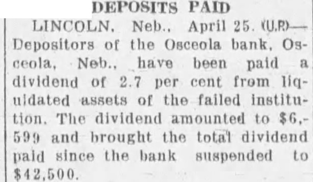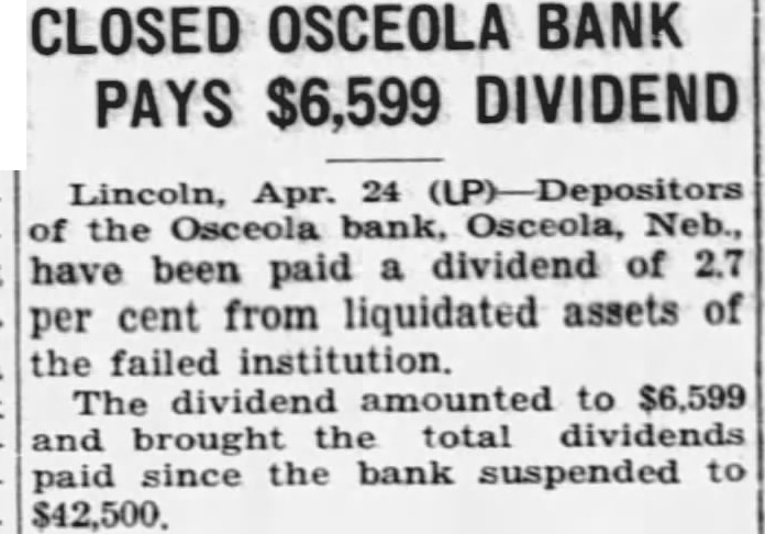 Lincoln. Depositors of the Osceola banw, dividend Osceola, Neb., have been paid of per liquidated The dividend assets of the failed cent institu- from amounted to $6,599 and the total dividends paid since the bank suspended to $42,500.