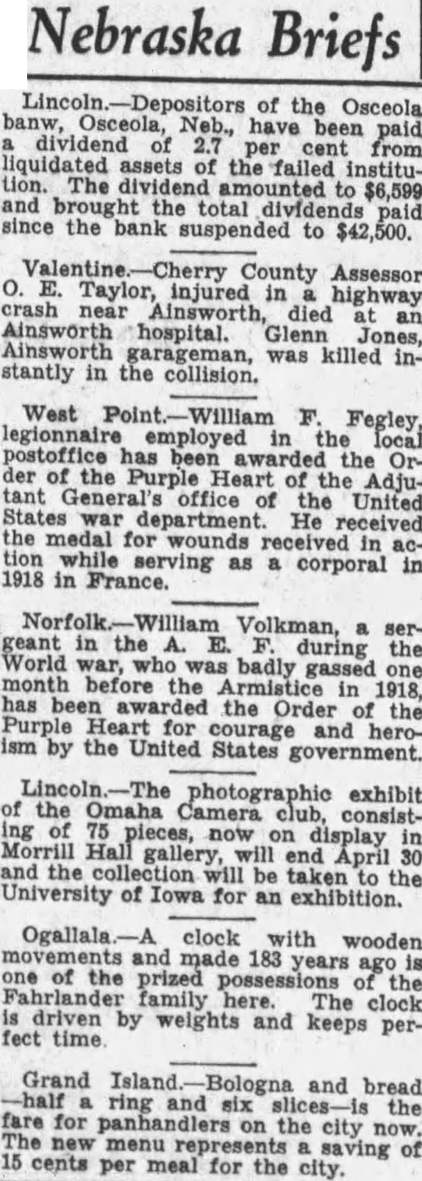 West Point William F. Fegley, employed in the local postoffice has been awarded the Order of the Purple Heart of the Adjutant General's office of the United States war department. He received the medal for wounds in 1918 tion in while serving as a corporal in France.