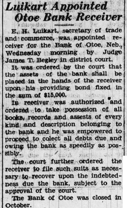 Luikart Appointed Otoe Bank Receiver E. H. Luikart, secretary of trade and commerce, was appointed receiver for the Bank of Otoe, Neb., Wednesday morning by Judge James T. Begley in district court. It. was ordered by the court that the assets of the bank shall be placed in the hands of the receiver uponal providing bond fixed in the sum of $15,000. In reeciver was authorized and ordered to take possession of all books, records and assests of every kind and description belonging to the bank and he was empowered to proceed to colect all debts due and owing the bank as speedily as possibly. The court further ordered the receiver to file such suits as necessary to recover upon the indebtedness due the bank, subject to the approval of the court. The Bank of Otoe was closed in October.