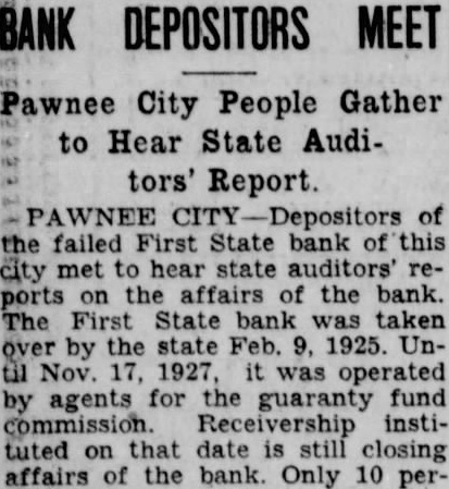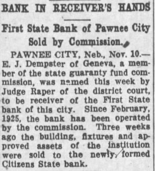 BANK IN RECEIVER'S HANDS First State Bank of Pawnee City Sold by Commission. PAWNEE CITY, Neb., Nov. 10.E. J. Dempster of Geneva, member of the state guaranty fund commission, was named this week by Judge Raper of the district court, to be receiver of the First State bank of this city. Since February, 1925, the bank has been operated by the commission. Three weeks ago the building, fixtures and approved assets of the institution were sold to the newly, formed Citizens State bank.
