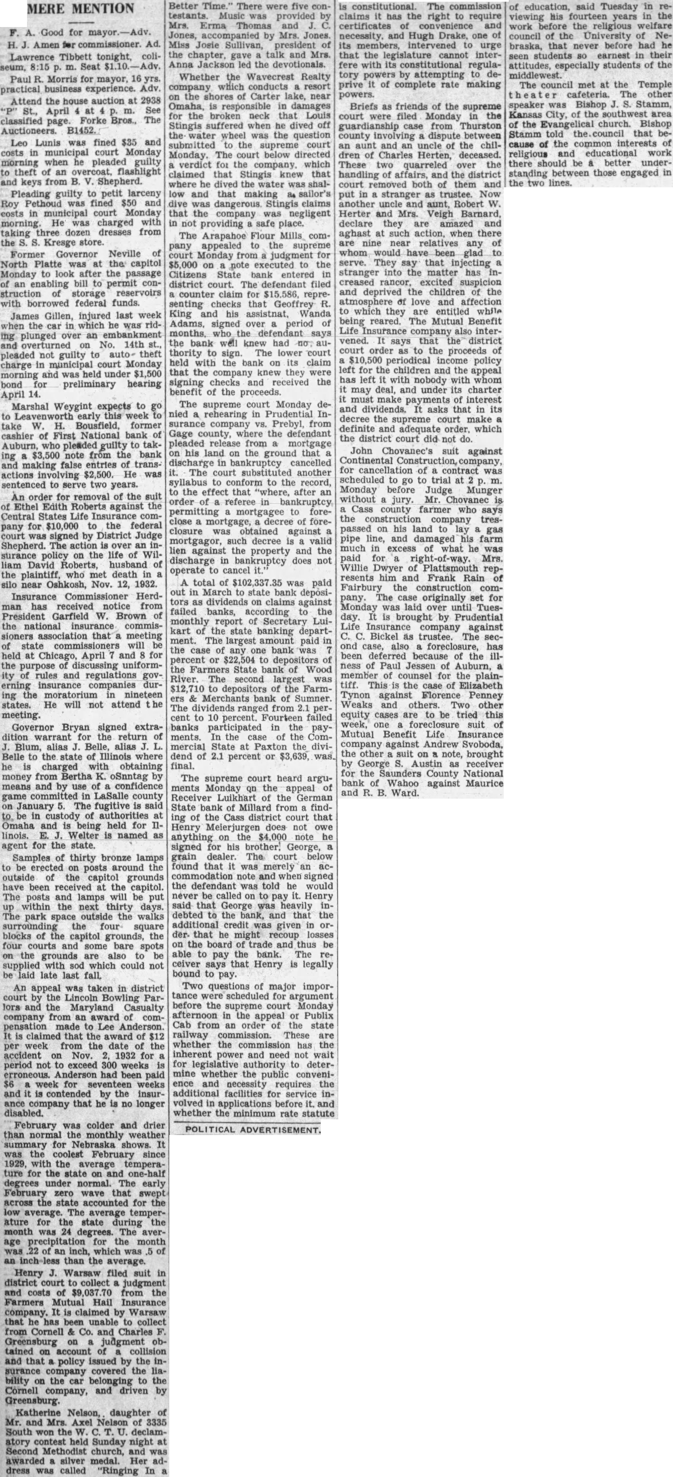 MERE MENTION F. A. Good for mayor.-Adv. H. Amen for commissioner. Ad. Tibbett tonight, coliseum, 8:15 m. Seat Adv. Paul R. Morris for mayor, 16 yrs. practical business experience. Adv. Attend the house auction at 2938 St., April m. See classified page. Forke Bros., The Auctioneers. B1452. Leo Lunis was fined $35 and costs in municipal court Monday morning when he pleaded guilty to theft of an overcoat, flashlight and keys from B. V. Shepherd. Pleading guilty to petit larceny Roy Pethoud was fined and eosts in municipal court Monday morning He was charged with taking three dozen dresses from the S. S. Kresge store. Former Governor Neville of North Platte was at the capitol Monday to look after the passage of an enabling bill to permit construction of storage reservoirs with borrowed federal funds. James Gillen, injured last week when the car in which was riding plunged over an embankment overturned on No. 14th pleaded not guilty to auto- theft charge in municipal court Monday morning and was held under $1,500 bond preliminary hearing April 14. Marshal Weygint expects to to Leavenworth early this week take W. H. Bousfield, former cashier of First National bank of Auburn, who pleaded guilty to taking $3,500 note from the bank making false entries of transactions involving $2,500. He was sentenced to serve two years. An order for removal of the suit of Ethel Edith Roberts against the Central States Life company for $10,000 to the federal court signed by District Judge Shepherd. The action over an insurance policy on the life of William David Roberts, husband of the plaintiff, who met death in silo near Oshkosh, Nov. 12, 1932. Insurance Commissioner Herdman received notice from President Garfield W. Brown of the national insurance commissioners association that meeting state commissioners will be held at Chicago, April and 8 for the purpose of discussing uniformity of rules and regulations erning insurance companies during the moratorium in nineteen states. He will not attend the meeting. Governor Bryan signed extradition warrant for the return of Blum, alias J. Belle, alias L. Belle to the state of Illinois where he is charged with obtaining money from Bertha K. oSnntag by means and by use of confidence game in LaSalle county on January 5. The fugitive is said to. be in custody of authorities at Omaha and is being held for Illinois. E. Welter is named as agent for the state. Samples of thirty bronze lamps to be erected on posts around the outside of the capitol grounds have been received at the capitol. The posts and lamps will be put up within the next thirty days. The park space outside the walks surrounding four square blocks of the capitol grounds, the four courts and some bare spots on the grounds are also to be supplied with sod which could not be laid late last fall. An appeal was taken in district court by the Lincoln Bowling Parlors and the Maryland Casualty company from an award of compensation made to Lee Anderson. is claimed that the award of $12 per week from the date of the accident on Nov. 1932 for period not to exceed 300 weeks is erroneous. Anderson had been paid $6 week for seventeen weeks and it is contended by the insurance company that he is no longer disabled. February was colder and drier than normal the monthly weather summary for Nebraska shows. It the coolest February since 1929, with the average temperature for the state on and one-half degrees under normal. The early February zero wave that swept across the state accounted for the low average. The average ature for the state during the month was 24 degrees. The average precipitation for the month was .22 of an inch, which was .5 of an than the average. Henry J. Warsaw filed suit in district court to collect judgment and costs of $9,037.70 from the Farmers Mutual Hail Insurance company. It is claimed by Warsaw that he has been unable to collect from Cornell & Co. and Charles F. Greensburg on judgment obtained on account of collision and that a policy issued by the incompany covered the liability on the car belonging to the Cornell company, and driven by Greensburg. Katherine Nelson, daughter of Mr. and Mrs. Axel Nelson of 3335 South won the W. U. declamatory contest held Sunday night at Second Methodist church, and was awarded silver medal. Her address was called "Ringing In Better Time. There were five contestants. Music was provided by Mrs. Erma and Jones, accompanied by Mrs. Jones. Miss Josie Sullivan, president of the chapter, talk and Mrs. Anna Jackson led the devotionals. Whether the Wavecrest Realty which conducts resort on the shores of Carter lake, near Omaha, is in damages for the broken neck that Louis Stingis suffered when he dived off the water wheel was the question submitted to the supreme court Monday. The court below directed verdict for the company. which claimed that Stingis knew that where he dived the water was shallow and that making as sailor's dive was dangerous. Stingis elaims that the company was negligent in not providing safe place. The Arapahoe Flour Mills company appealed to the supreme court Monday from a judgment for $5,000 on note to the Citizens State bank entered in district court. The defendant filed counter claim for $15,586, representing checks that Geoffrey R. King and his assistnat, Wanda Adams, signed over period of months, who the defendant says the bank well knew had no authority to sign. The lower court held with the bank on its claim that the company knew they were signing checks and received the benefit of the proceeds. The supreme court Monday denied rehearing in Prudential Insurance company VS. Prebyl, from Gage county, where the defendant pleaded release from mortgage on his land on the ground that discharge in bankruptcy cancelled it. The court substituted another syllabus to conform to the record, to the effect that "where, after an order of referee in bankruptcy permitting mortgagee to foreclose a mortgage, decree of foreclosure was obtained against mortgagor, suc