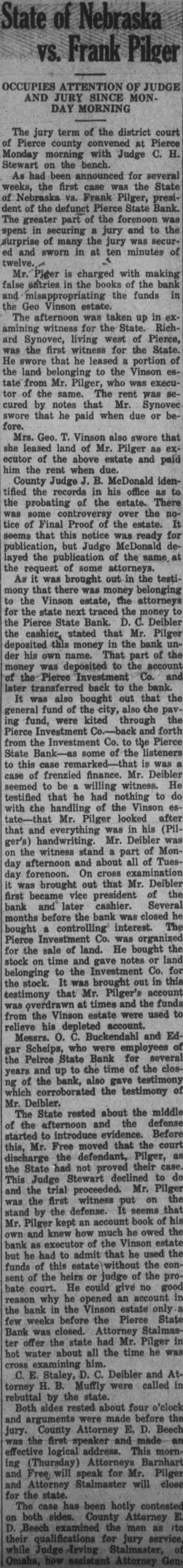 Nebraska OCCUPIES ATTENTION OF JUDGE AND JURY SINCE DAY MORNING The jury term of the district court Pierce county convened at Pierce Monday morning with Judge Stewart on the bench. As had been announced for several weeks, the first case was the State Nebraska Frank Pilger, of the defunct Pierce State The greater part of the forenoon was in securing jury and to the spent surprise the jury securmany and sworn in at ten minutes of charged with making false entries in the books of the bank and the funds the Geo Vinson estate. The afternoon was taken amining witness for the State. Richard Synovec, living west of Pierce, the first witness for the State. He swore that he leased portion of the land belonging to the Vinson from Mr. Pilger, who was executor of the same. The rent was cured by notes that Mr. Synovec swore that he paid when due or fore. Geo. Vinson also swore that she leased land of Mr. Pilger ecutor of the above estate and paid him the rent when due. County Judge identified the records his office the probating of the estate. There some controversy over the notice of Final Proof the estate. seems that this notice ready for but Judge the publication of the the request of some attorneys. As brought out the testimony that there was money the Vinson estate, the attorneys for the state next traced the the Pierce State Bank. Deibler the cashier, stated that Mr. Pilger deposited money in the bank his own name. That part of the was deposited to the Investment Co. later transferred back to the bank. It also bought out that the general fund of the city, also the fund, were kited through the Pierce and forth from the Investment to the Pierce State some of the listeners this case is was of frenzied finance. Mr. Deibler case seemed to be willing witness. He testified that he had nothing to do the handling of the Vinson Mr. Pilger looked after that and everything was his ger's) handwriting. Mr. Deibler was the witness stand part of Monafternoon and about all of Tuesday day forenoon. On cross examination brought out that Mr. Deibler first became vice president of the bank and later cashier. Several months before the bank was closed bought controlling interest. The Pierce Investment Co. was organized the sale of land. He bought the for stock on time and gave notes land the Investment for It brought out in this the stock. that Mr. Pilger's account testimony overdrawn times and the funds from the Vinson were used relieve his depleted account. Buckendahl and EdMessrs. Scheips, who were employees the Peirce State Bank for several and to the time of the closyears of bank, also gave testimony which corroborated the testimony Deibler. rested about the middle The State afternoon and the defense the introduce evidence. Before started to Free moved that the court Mr. the defendant, Pilger, had not their State Stewart declined This Judge the trial proceeded. Pilger and was the first witness put on defense. that stand by the Pilger kept account book how much he owed the and knew executor of the Vinson estate bank had to admit that he used the but of this the confunds the heirs or judge of the sent bate court. He could give no good reason why he opened account the bank in the Vinson estate weeks before the Pierce State Bank closed. Attorney Stalmasoffer the state had Mr. Pilger about all the time he water examining him. Staley, Deibler and Muffly called torney rebuttal by the state. Both sides rested about four o'clock and arguments were made before the jury. County Attorney the and effective logical address. This (Thursday) Attorneys Barnhart speak for Pilger Attorney Stalmaster will close for the state. has been hotly contested both sides. County Atterney Beech examined the men their qualifications for jury service, Stalmaster, Attorney