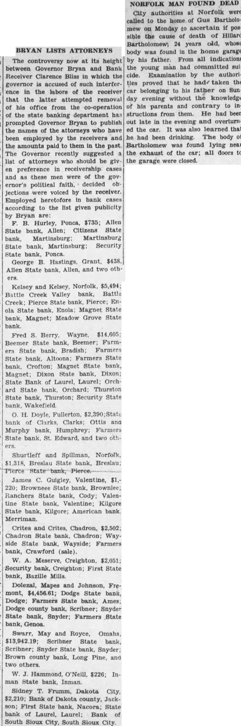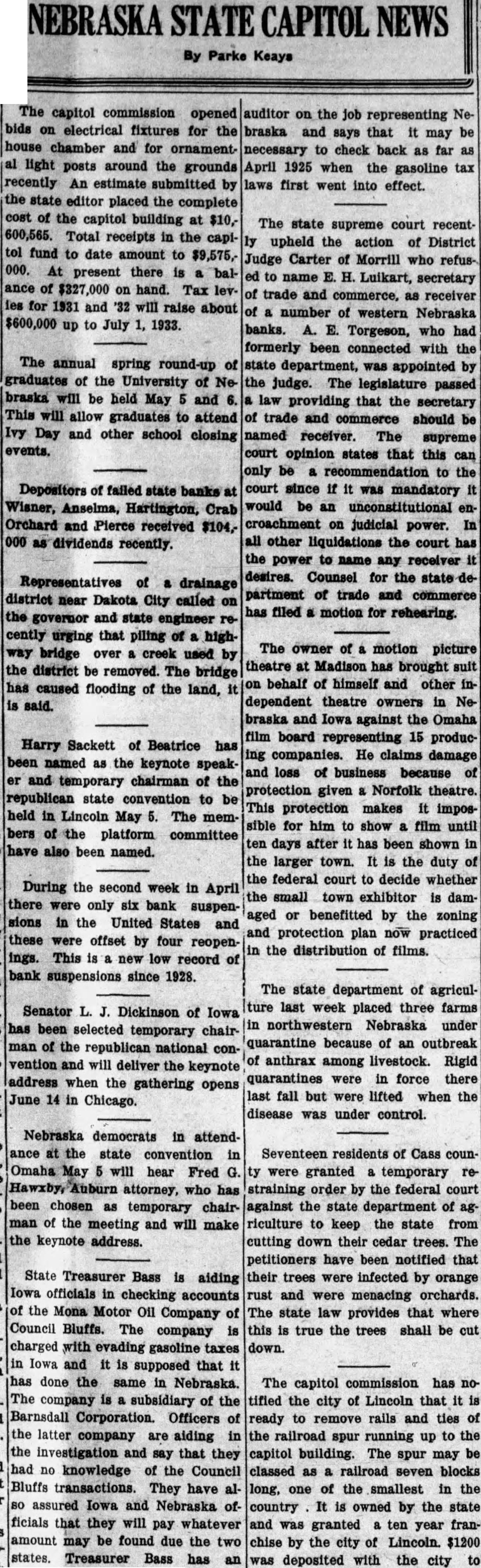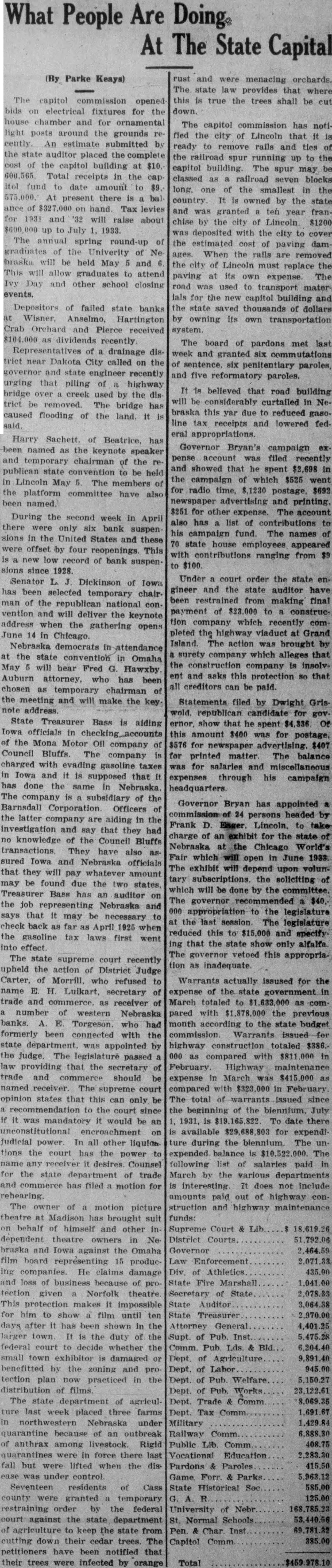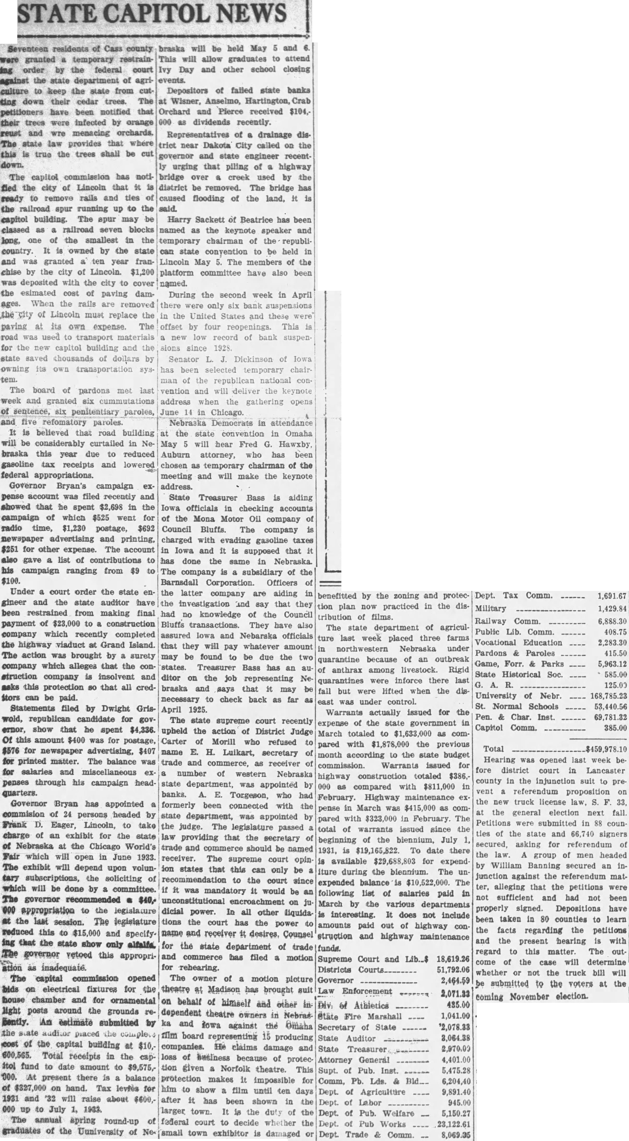 State Treasurer Bass is aiding Iowa officials in checking accounts of the Mona Motor Oil company of Council Bluffs. The company is charged with evading gasoline taxes in Iowa and it is supposed that it has done the same in Nebraska The company is a subsidiary of the Barnsdall Corporation. Officers of the latter company are aiding in the investigation and say that they had no knowledge of the Council Bluffs transactions. They have also assured Iowa and Nebarska officials that they will pay whatever amount may be found to be due the two states. Treasurer Bass has an au ditor on the job representing Nebraska and says that it may be necessary to check back as far as April 1925. The state supreme court recently upheld the action of District Judge Carter of Morill who refused to name E. H. Luikart, secretary of trade and commerce, as receiver of a number of western Nebraska state department, was appointed by banks. A. E. Torgeson, who had formerly been connected with the state department, was appointed by the judge. The legislature passed law providing that the secretary of trade and commerce should be named receiver. The supreme court opinion states that this can only be a recommendation to the court since if it was mandatory it would be an unconstitutional encroachment on judicial power. In all other liquidations the court has the power to name and receiver it desires, Counsel for the state department of trade and commerce has filed a motion for rehearing. The owner of a motion picture theatre at Madison has brought suit on behalf of himself and other in dependent theatre owners in Nebraska and Iowa against the Omaha film board representing 15 producing companies. He claims damage and loss of business because of protection given a Norfolk theatre. This protection makes it impossible for him to show a film until ten days after it has been shown in the larger town. It is the duty of the federal court to decide whether the small town exhibitor is damaged or benefitted by the zoning and protection plan now practiced in the distribution of films. The state department of agriculture last week placed three farms in northwestern Nebraska under quarantine because of an outbreak of anthrax among livestock. Rigid quarantines were inforce there last fall but were lifted when the diseast was under control. Warrants actually issued for the expense of the state government in March totaled to $1,633,000 as compared with $1,878,000 the previous month according to the state budget commission. Warrants issued for highway construction totaled $386,000 as compared with $811,000 in February. Highway maintenance expense in March was $415,000 as com pared with $323,000 in February. The total of warrants issued since the beginning of the biennium, July 1, 1931, is $19,165,822. To date there is available $29,688,803 for expend iture during the biennium. The un expended balance is $10,522,000. The following list of salaries paid in March by the various departments is interesting. It does not include amounts paid out of highway con struction and highway maintenance funds.