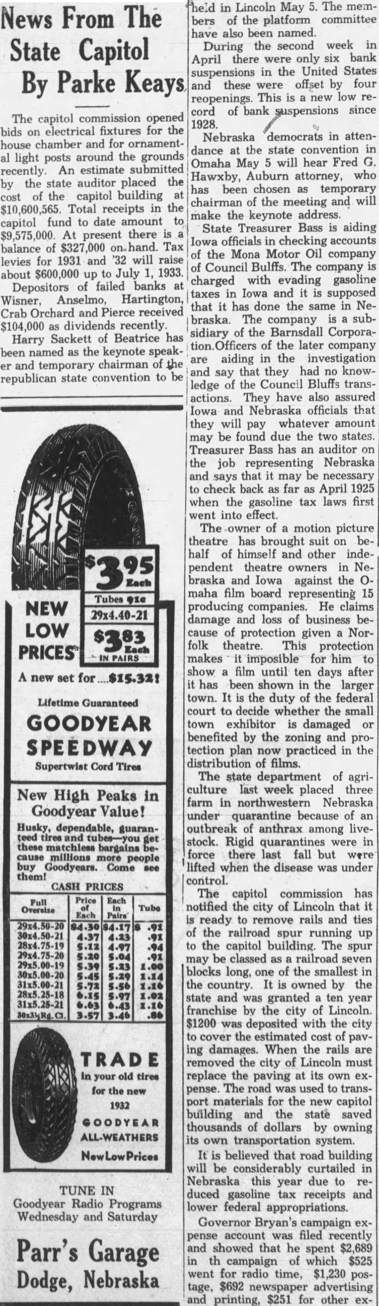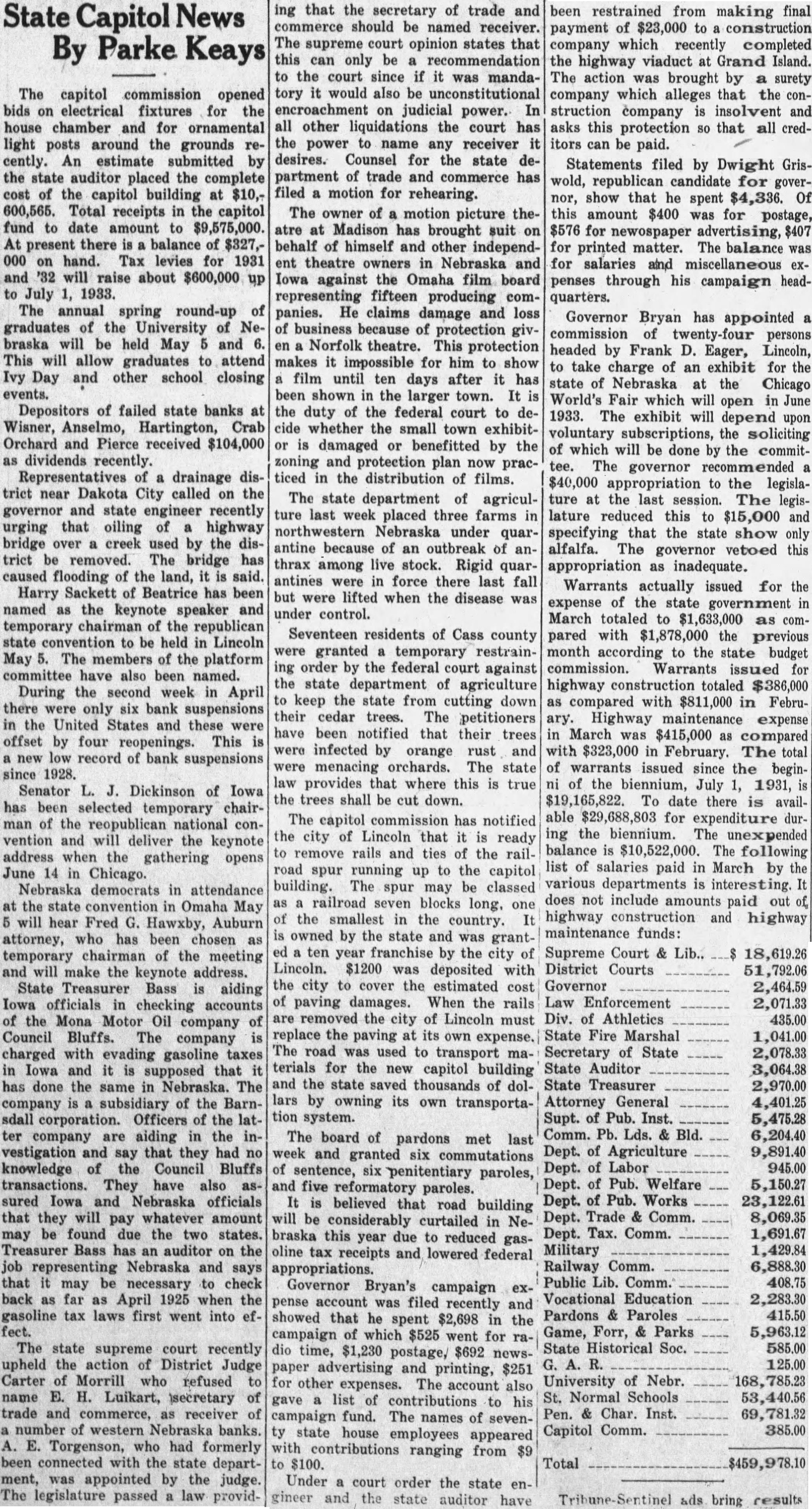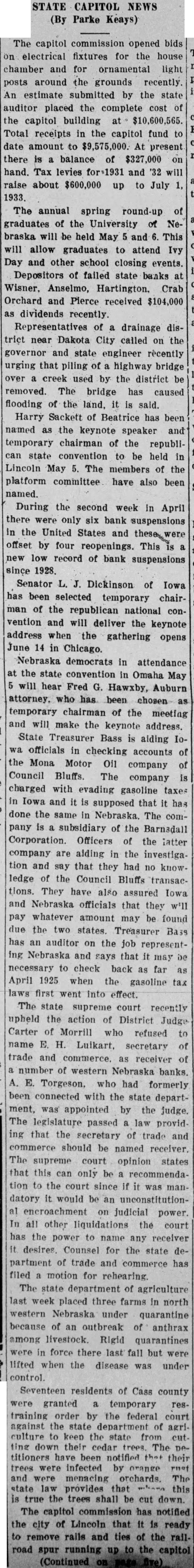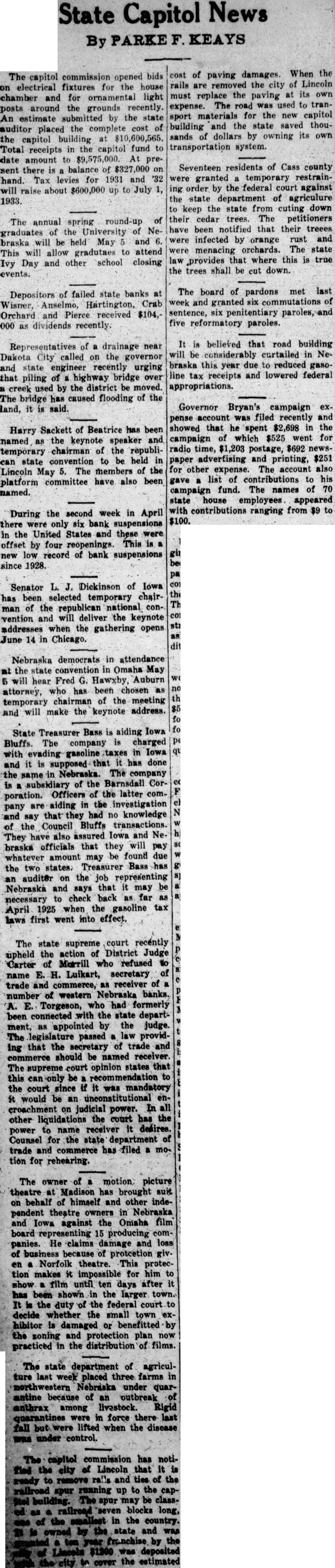 The board of pardons met last week and granted six cummutations of sentence, six penitentiary paroles, and five refomatory paroles. It is believed that road building will be considerably curtailed in Nebraska this year due to reduced gasoline tax receipts and lowered federal appropriations. Governor Bryan's campaign expense account was filed recently and showed that the spent $2,698 in the campaign of which $525 went for radio time, $1,230 postage, $692 newspaper advertising and printing, $251 for other expense. The account also gave a list of contributions to his campaign ranging from $9 to $100. Under a court order the state engineer and the state auditor have been restrained from making final payment of $23,000 to a construction company which recently completed the highway viaduct at Grand Island. The action was brought by a surety company which alleges that the construction company is insolvent and asks this protection so that all credStors can be paid. Statements filed by Dwight Griswold, republican candidate for governor, show that he spent $4,336. Of this amount $400 was for postage, $576 for newspaper advertising, $407 for printed matter. The balance was for salaries and miscellaneous expenses through his campaign headquarters. Governor Bryan has appointed a commision of 24 persons headed by Frank D. Eager, Lincoln, to take charge of an exhibit for the state of Nebraska at the Chicago World's Fair which will open in June 1933. The exhibit will depend upon voluntary subscriptions, the soliciting of which will be done by a committee. The governor recommended a $40,000 appropriation to the legislature at the last session. The legislature reduced this to $15,000 and specifying that the state show only alfalfa. The governor vetoed this appropriation as inadequate. The capital commission opened bids on electrical fixtures for the house chamber and for ornamental light posts around the grounds reCently. An estimate submitted by the state auditor placed the complete reost of the capital building at $10,600,565. Total receipts in the capitol fund to date amount to $9,575,000. At present there is a balance of $327,000 on hand. Tax levies for 1931 and '32 will raise about $600,000 up to July 1, 1933. The annual spring round-up of graduates of the University of Ne- braska will be held May 5 and 6. This will allow graduates to attend Ivy Day and other school closing events.