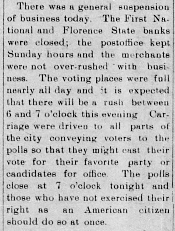 There was a general suspension of business today. The First Na. tional and Florence State banks were closed: the postoffice kept Sunday hours and the merchants were not over-rushed with business. The voting places were full nearly all day and it is expected that there will be a rush between 6 and 7 o'clock this evening Carriage were driven to all parts of the city conveying voters to the polls SO that they might east their vote for their favorite party or candidates for office. The polls close at 7 o'clock tonight and those who have not exercised their right as an American citizen should do so at once.