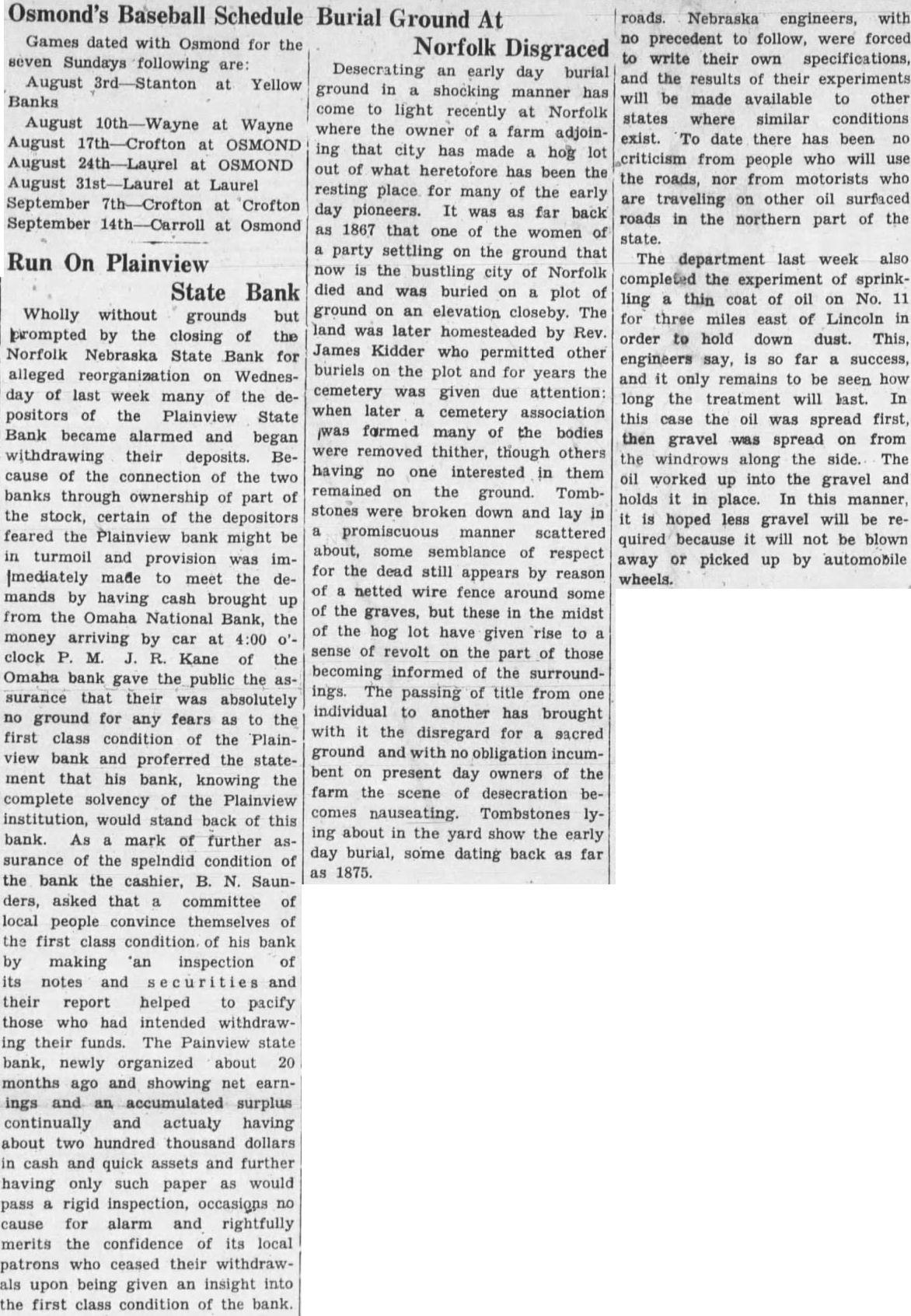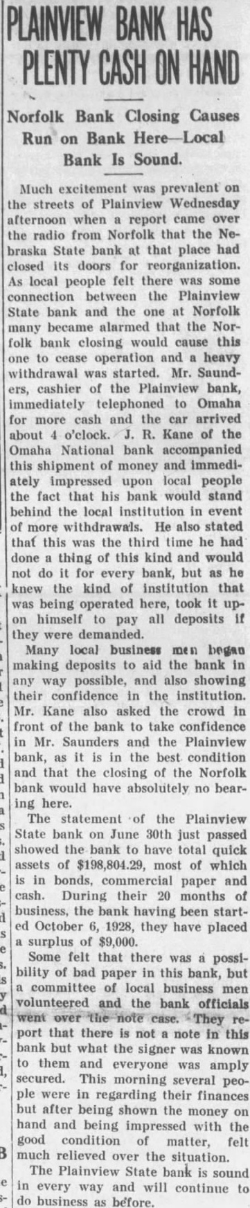 Norfolk Bank Closing Causes Run on Bank Bank Is Sound. Much excitement was prevalent the streets of Plainview Wednesday afternoon when report came over the radio from Norfolk that the Nebraska State bank at that place had closed its doors for As local people felt there was some connection between the Plainview State bank and the one at Norfolk many became alarmed that the Norfolk bank closing would cause this to operation and heavy withdrawal was started. Mr. Saundcashier of the Plainview bank, immediately telephoned Omaha for more cash and the car arrived about o'clock. R. Kane of the Omaha National bank accompanied this shipment of money and immediately impressed upon local people the fact that his bank would stand behind the local institution event of more withdrawals. He also stated that this was the third time he had done thing this kind and would not do for every bank, but as he knew the kind of institution that being operated here, took upon himself to pay all deposits if they Many local business began making deposits to bank possible, and also showing their confidence in the institution. Mr. Kane also asked the crowd in front of the bank to take confidence Mr. Saunders and the Plainview bank, in the best condition and that the closing of the Norfolk bank would have absolutely no bearhere. The statement of the Plainview State bank June 30th just passed showed the bank to have total quick assets of $198,804.29, most of which in bonds, commercial and paper cash. During their 20 months of business, the bank having been startOctober 1928, they have placed surplus of $9,000. Some felt that there was possibility of bad paper in this bank, but committee of local business men volunteered and the bank officials port that there not note in this bank but what the signer was known them and everyone was amply secured. This morning several peowere in regarding their finances but after being shown the money hand and being impressed with the good condition matter, felt much relieved the situation. The Plainview State bank is sound every way and will continue to business before.