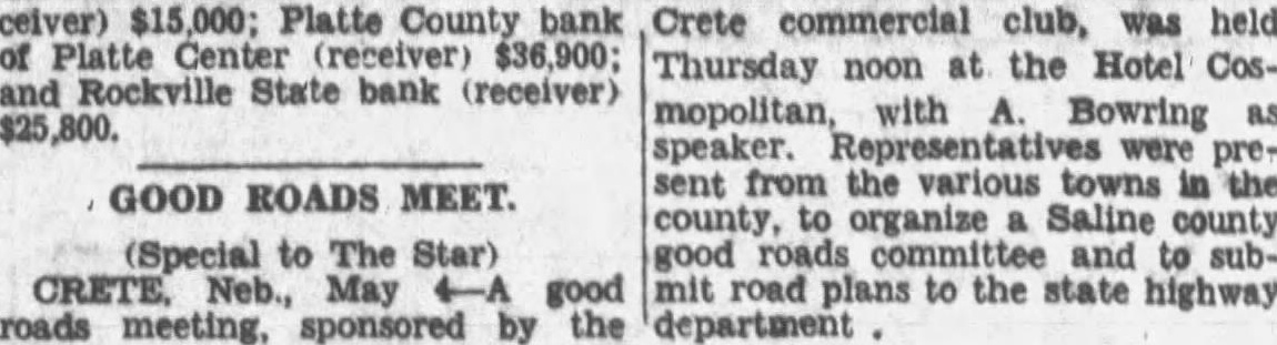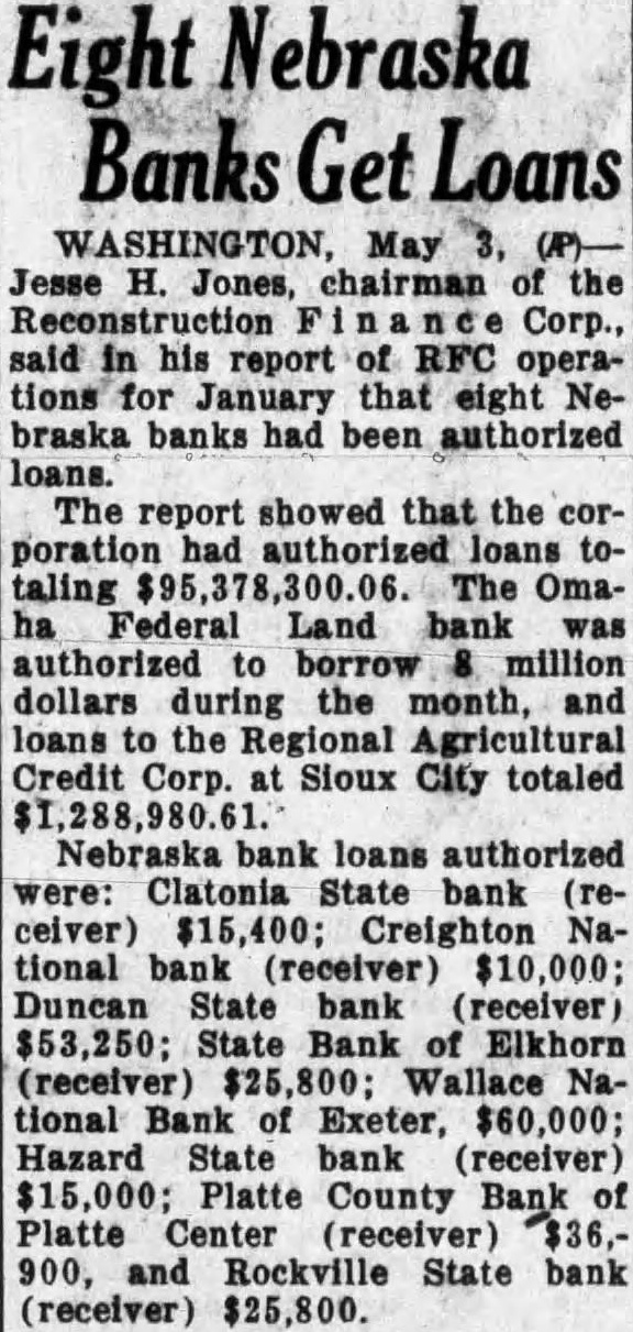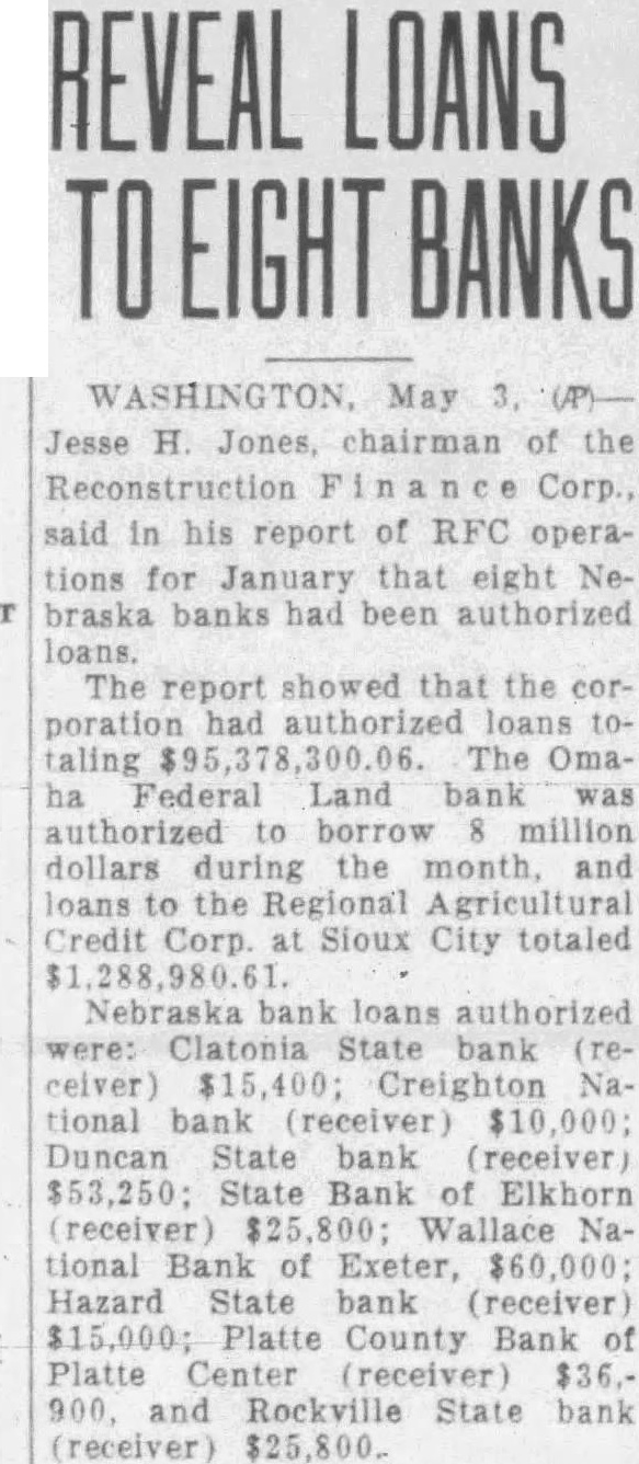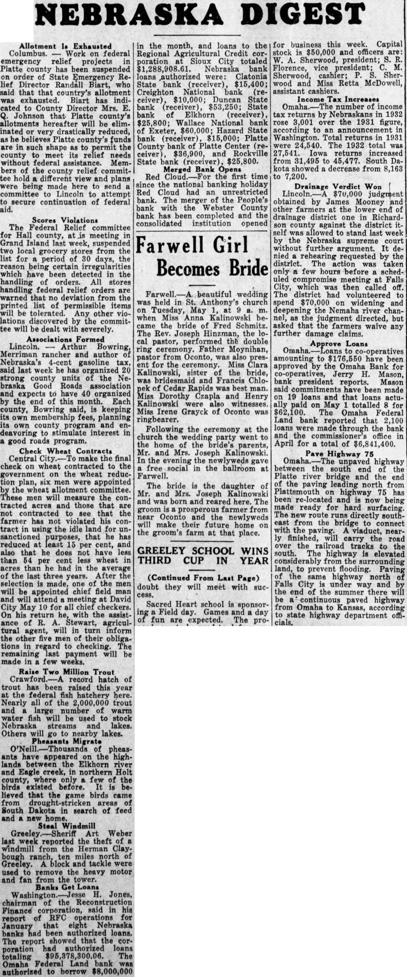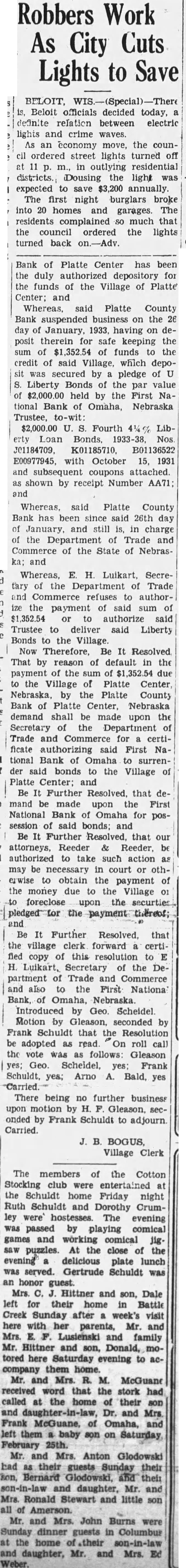 Robbers Work As City Cuts to Save Lights BELOIT, Beloit officials decided today, definite relation between electric lights and crime waves. As an economy move, the counordered street lights turned off in outlying residential districts. Dousing the light was expected to save $3,200 annually. The first night burglars broke into 20 homes and garages. The residents complained so much that the council ordered the lights turned back Bank of Platte Center has been the duly authorized depository for the funds of the Village of Platte and Whereas, said Platte County Bank suspended business on the day of January, 1933, having deposit therein for safe keeping the sum $1,352.54 of funds to the credit of said Village, which deposit was secured by pledge of Liberty Bonds of the par value of $2,000.00 held by the First National Bank of Omaha, Nebraska Trustee, to-wit: $2,000.00 Fourth Liberty Loan Bonds, 1933-38, Nos October 15, 1931 and subsequent coupons attached. shown by receipt Number AA71; and said Platte County Bank has been since said 26th day of and still in charge the Department of Trade and Commerce of the State of Nebrasand Whereas, E. H. Secretary of the Department of Trade and Commerce refuses to authorize the payment of said sum of or authorize said Trustee to deliver said Liberty Bonds to the Village Now Therefore, It Resolved That by reason of default in the payment of the sum of $1,352.54 due the Village of Platte by the Platte County Bank of Platte Center, Nebraska demand shall be made upon the Secretary of the Department Trade and Commerce for certificate authorizing said First National Bank of Omaha to surrender said bonds to the Village of Platte Center: and Be Further Resolved. that demand be made upon the First National Bank of Omaha for possession of said bonds; and Be It Further that our attorneys, Reeder Reeder, authorized to take such action may be necessary in court or othto obtain the payment of the money due to the Village foreclose upon the the and Be It Further that the village clerk forward certified copy of this resolution to Luikart, Secretary of the Department of Trade and Commerce and also to the First National Bank, of Omaha, Nebraska. Introduced by Geo. Scheidel. Motion by Gleason, seconded by Frank Schuldt that the Resolution be adopted as On roll call the vote was as follows: Gleason Geo. Scheidel, yes; Frank Schuldt, yes; Arno yes There being no further business upon motion by Gleason, onded by Frank Schuldt to adjourn Carried. Village Clerk The members of the Cotton Stocking club were entertained at the Schuldt home Friday night Ruth Schuldt and Dorothy Crumley were hostesses. The evening passed by playing comical games and working comical jig. puzzles. At the close of the evening delicious plate lunch was served. Gertrude Schuldt was an honor Mrs. C. Hittner and son, Dale left for their home in Battle Creek Sunday after week's visit here with parents, Mr. and Mrs. Lusienski and family Mr. Hittner and son, Donald, tored here Saturday evening to company them home. Mr. and Mrs. R. M. McGuane received word that the stork had called at the home of their son and Dr. and Mrs. Frank of Omaha, and them baby son on Saturday February 25th. Mr. and Mrs. Anton Glodowski had their guests Sunday their Bernard Glodowski, their son-in-law and daughter, Mr. and Mrs. Ronald Stewart and little son all Amerson. Mr. and Mrs. John were Sunday dinner guests in Columbus the home and daughter, Mr. and Mrs. Weber.