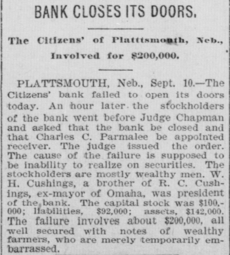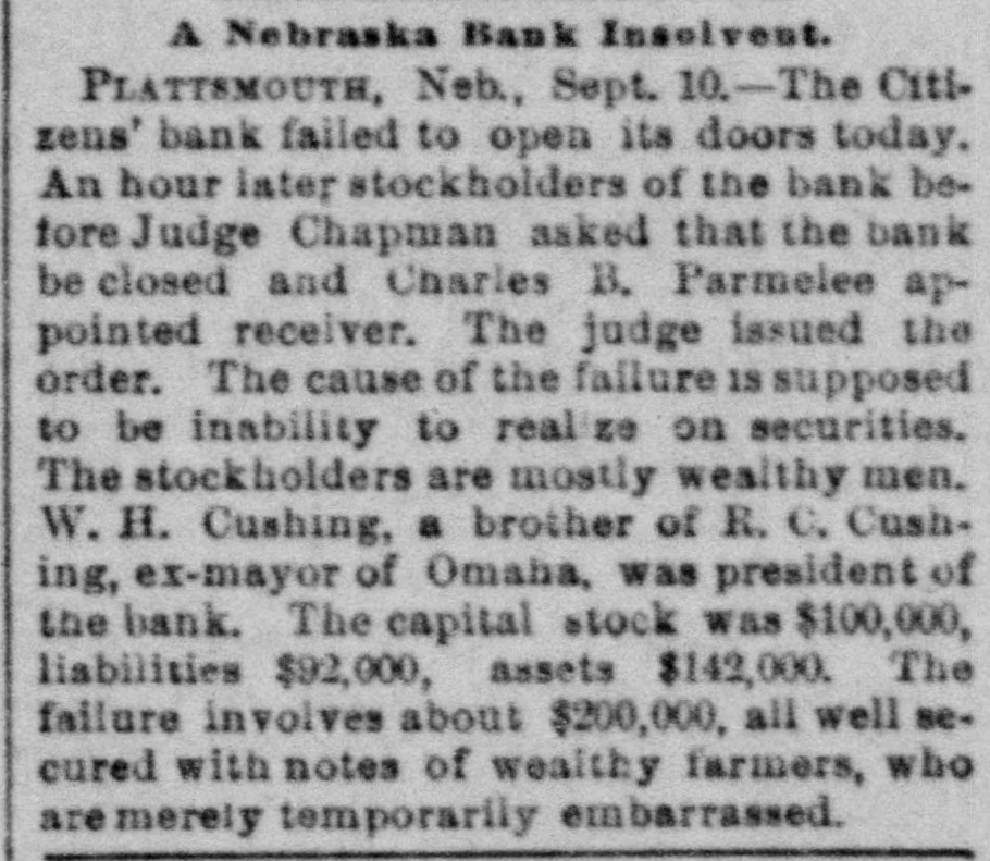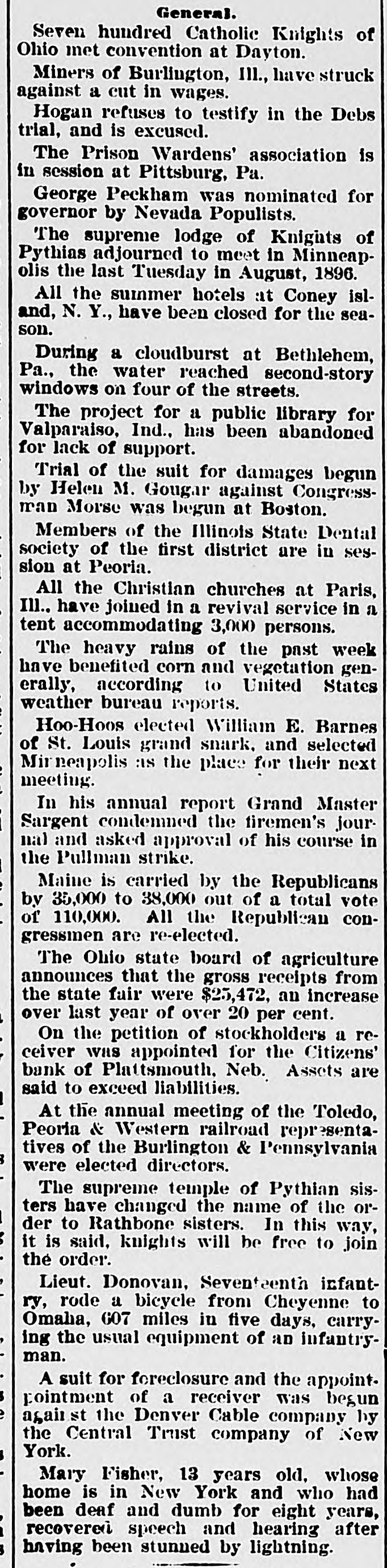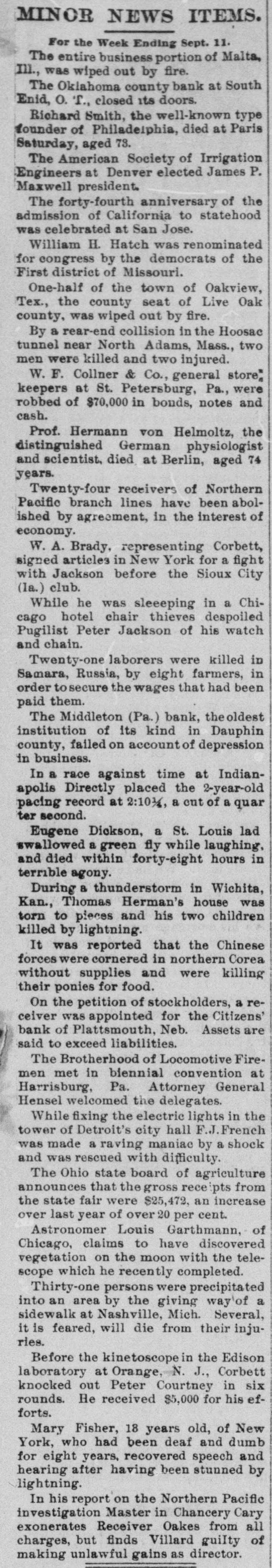 MINOR NEWS ITEMS. For the Week Ending Sept. 11. The entire business portion of Malta, Ill., was wiped out by fire. The Oklahoma county bank at South Enid, O. 'I., closed its doors. Richard Smith, the well-known type founder of Philadelphia, died at Paris Saturday, aged 78. The American Society of Irrigation Engineers at Denver elected James P. Maxwell president. The forty-fourth anniversary of the admission of California to statehood was celebrated at San Jose. William H. Hatch was renominated for congress by the democrats of the First district of Missouri. One-half of the town of Oakview, Tex., the county seat of Live Oak county, was wiped out by fire. By a rear-end collision in the Hoosac tunnel near North Adams, Mass., two men were killed and two injured. W. F. Collner & Co., general store" keepers at St. Petersburg, Pa., were robbed of $70,000 in bonds, notes and cash. Prof. Hermann von Helmoltz, the distinguished German physiologist and scientist, died at Berlin, aged 74 years. Twenty-four receivers of Northern Pacific branch lines have been abolished by agreement, in the interest of economy. W. A. Brady, representing Corbett, signed articles in New York for a fight with Jackson before the Sioux City (la.) club. While he was sleeeping in a Chicago hotel chair thieves despoiled Pugilist Peter Jackson of his watch and chain. Twenty-one laborers were killed in Samara, Russia, by eight farmers, in order tosecure the wages that had been paid them. The Middleton (Pa.) bank, the oldest institution of its kind in Dauphin county, failed on account of depression in business. In a race against time at Indianapolis Directly placed the 2-year-old pacing record at 2:10 a cut of a quar ter second. Eugene Dickson, a St. Louis lad swallowed a green fly while laughing, and died within forty-eight hours in terrible agony. During a thunderstorm in Wichita, Kan., Thomas Herman's house was torn to pieces and his two children killed by lightning. It was reported that the Chinese forces were cornered in northern Corea without supplies and were killing their ponies for food. On the petition of stockholders, a receiver was appointed for the Citizens' bank of Plattsmouth, Neb. Assets are said to exceed liabilities. The Brotherhood of Locomotive Firemen met in biennial convention at Harrisburg, Pa. Attorney General Hensel welcomed the delegates. While fixing the electric lights in the tower of Detroit's city hall F.J. French was made a raving maniac by a shock and was rescued with difficulty. The Ohio state board of agriculture announces that the gross receipts from the state fair were $25,472, an increase over last year of over 20 per cent. Astronomer Louis Garthmann, of Chicago, claims to have discovered vegetation on the moon with the telescope which he recently completed. Thirty-one persons were precipitated into an area by the giving way'of a sidewalk at Nashville, Mich. Several, it is feared, will die from their injuries. Before the kinetoscope in the Edison laboratory at Orange, N. J., Corbett knocked out Peter Courtney in six rounds. He received $5,000 for his efforts. Mary Fisher, 18 years old, of New York, who had been deaf and dumb for eight years. recovered speech and hearing after having been stunned by lightning. In his report on the Northern Pacific investigation Master in Chancery Cary exonerates Receiver Oakes from all charges, but finds Villard guilty of making unlawful gains as director.