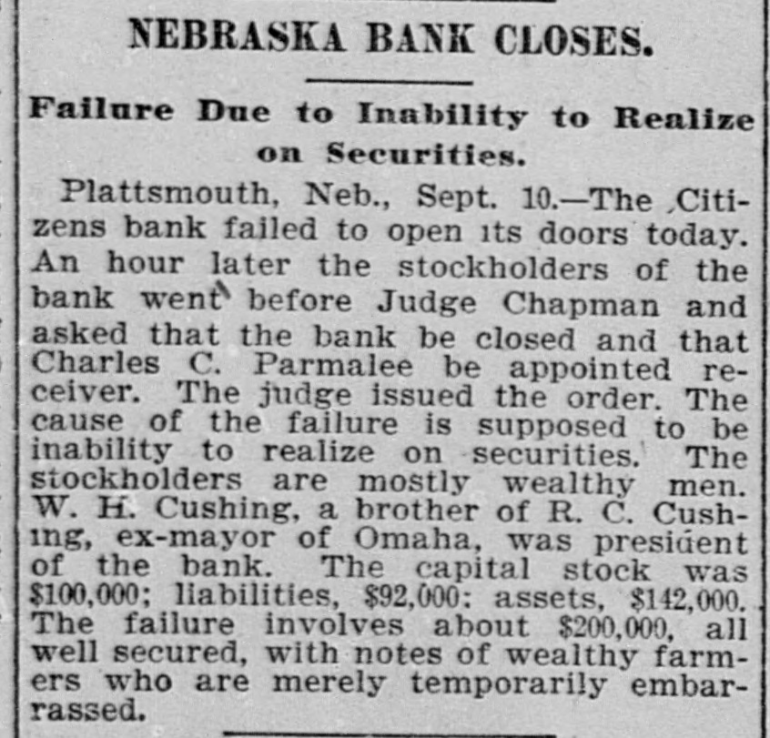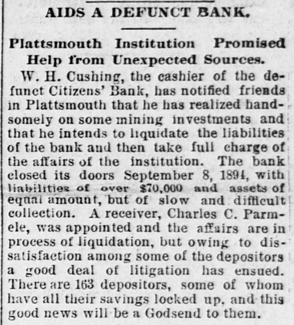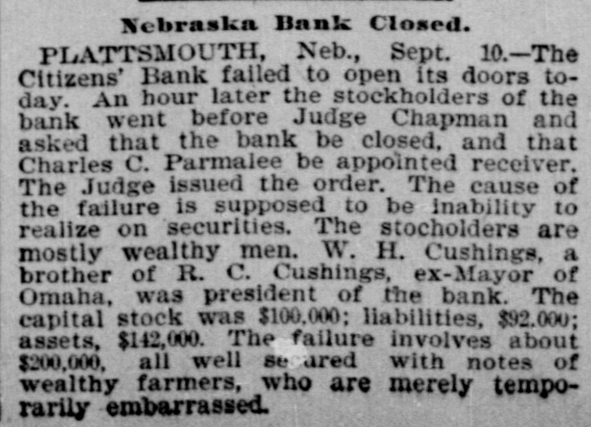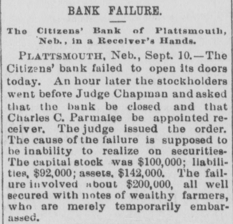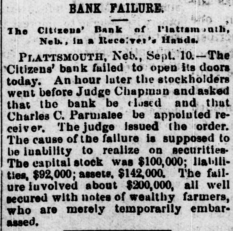 MINOR NEWS ITEMS. For the Week Ending Sept. 11. The entire business portion of Malta, Ill., was wiped out by fire. The Oklahoma county bank at South Enid, O. 'I., closed its doors. Richard Smith, the well-known type founder of Philadelphia, died at Paris Saturday, aged 78. The American Society of Irrigation Engineers at Denver elected James P. Maxwell president. The forty-fourth anniversary of the admission of California to statehood was celebrated at San Jose. William H. Hatch was renominated for congress by the democrats of the First district of Missouri. One-half of the town of Oakview, Tex., the county seat of Live Oak county, was wiped out by fire. By a rear-end collision in the Hoosac tunnel near North Adams, Mass., two men were killed and two injured. W. F. Collner & Co., general store" keepers at St. Petersburg, Pa., were robbed of $70,000 in bonds, notes and cash. Prof. Hermann von Helmoltz, the distinguished German physiologist and scientist, died at Berlin, aged 74 years. Twenty-four receivers of Northern Pacific branch lines have been abolished by agreement, in the interest of economy. W. A. Brady, representing Corbett, signed articles in New York for a fight with Jackson before the Sioux City (la.) club. While he was sleeeping in a Chicago hotel chair thieves despoiled Pugilist Peter Jackson of his watch and chain. Twenty-one laborers were killed in Samara, Russia, by eight farmers, in order tosecure the wages that had been paid them. The Middleton (Pa.) bank, the oldest institution of its kind in Dauphin county, failed on account of depression in business. In a race against time at Indianapolis Directly placed the 2-year-old pacing record at 2:10 a cut of a quar ter second. Eugene Dickson, a St. Louis lad swallowed a green fly while laughing, and died within forty-eight hours in terrible agony. During a thunderstorm in Wichita, Kan., Thomas Herman's house was torn to pieces and his two children killed by lightning. It was reported that the Chinese forces were cornered in northern Corea without supplies and were killing their ponies for food. On the petition of stockholders, a receiver was appointed for the Citizens' bank of Plattsmouth, Neb. Assets are said to exceed liabilities. The Brotherhood of Locomotive Firemen met in biennial convention at Harrisburg, Pa. Attorney General Hensel welcomed the delegates. While fixing the electric lights in the tower of Detroit's city hall F.J. French was made a raving maniac by a shock and was rescued with difficulty. The Ohio state board of agriculture announces that the gross receipts from the state fair were $25,472, an increase over last year of over 20 per cent. Astronomer Louis Garthmann, of Chicago, claims to have discovered vegetation on the moon with the telescope which he recently completed. Thirty-one persons were precipitated into an area by the giving way'of a sidewalk at Nashville, Mich. Several, it is feared, will die from their injuries. Before the kinetoscope in the Edison laboratory at Orange, N. J., Corbett knocked out Peter Courtney in six rounds. He received $5,000 for his efforts. Mary Fisher, 18 years old, of New York, who had been deaf and dumb for eight years. recovered speech and hearing after having been stunned by lightning. In his report on the Northern Pacific investigation Master in Chancery Cary exonerates Receiver Oakes from all charges, but finds Villard guilty of making unlawful gains as director.