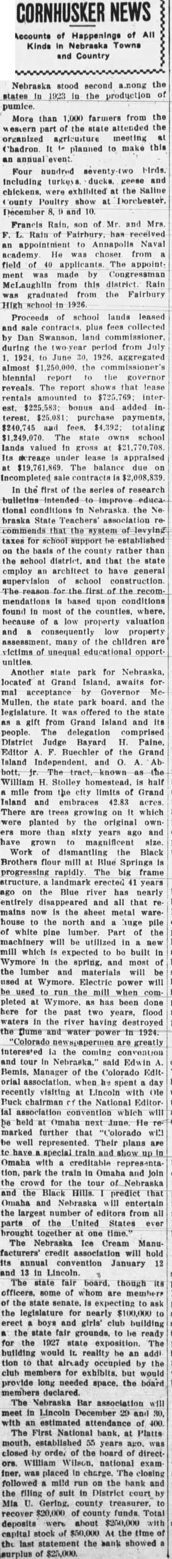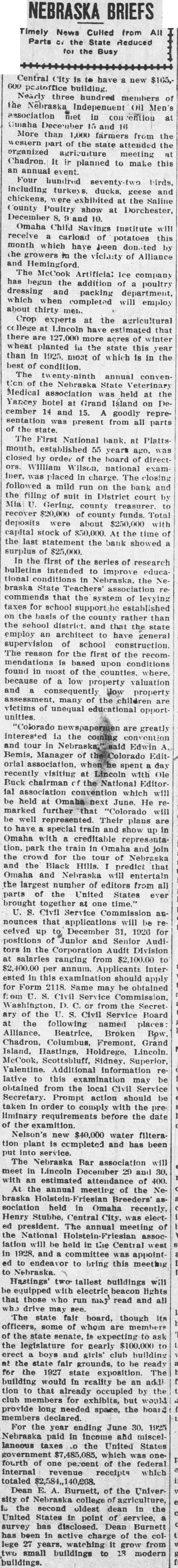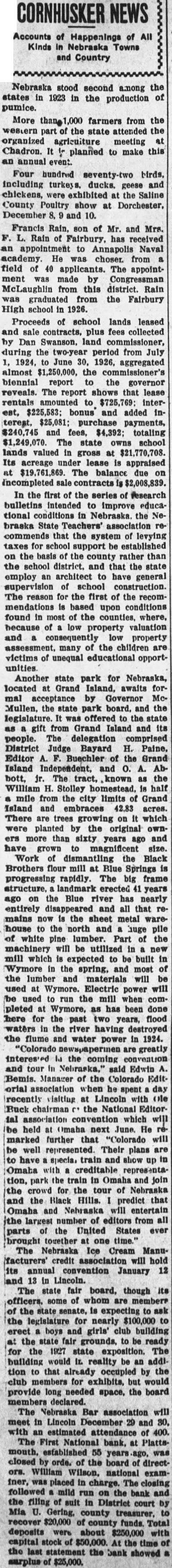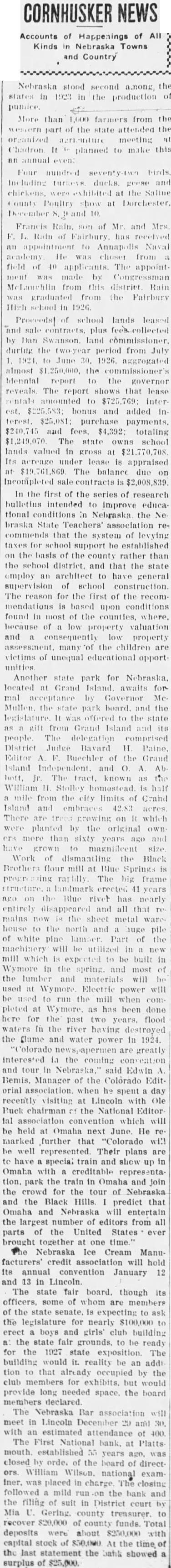 Accounts Happenings Kinds Nebraska Towns and Country states the production pumice. More than 1,000 farmers from the western part of the state attended the organized agricuiture- meeting planned to make this annual including turkeys, ducks, geese and chickens, were exhibited at the Saline County Poultry show at Dorchester, December 10. Francis Rain, son of Mr. and Mrs. Rain of Fairbury, has received appointment to Annapolis Naval academy. He was choser. from field of applicants. The appoint ment was made by McLaughlin from this district. Rain was graduated from the Fairbury High school in 1926. Proceeds of school lands leased and sale contracts, plus fees collected Dan Swanson, land during the period from July 1924, to June 1926, aggregated almost $1,250,000, the commissioner's biennial report to the governor reveals. The report shows that lease rentals amounted to interest, $225,583; bonus and added terest, $25,081: purchase payments, $240,745 and fees, $4,392; totaling $1,249,070. The state owns school lands valued in gross at $21,770,708. Its acreage under lease appraised $19,761,869. The balance due incompleted sale contracts is $2,008,839. In the first of the series of research bulletins intended to Improve educational conditions in Nebraska. the braska State Teachers' association commends that the system of levying taxes for school support be established on the basis of the county rather than the school district, and that the state employ an architect to have general supervision of school construction. reason for the first of the mendations based upon conditions found in the counties, where, because of low property valuation and consequently low property assessment, many of the children are victims of unequal educational opportunities. Another state park for Nebraska, located Grand Island, awaits for. mal acceptance by Governor McMullen. the state park board, and the legislature. It was offered to the state gift from Grand Island and its people. The delegation comprised District Judge Bayard Paine, Editor Buechler of the Grand Island Independent, and bott, The tract. known as the William H. Stolley homestead, half mile from the city limits of Grand Island and embraces 42.83 acrès. There are trees growing on which were planted by the original ownmore than sixty years ago and have grown magnificent size. Work of dismantling the Black Brothers flour mill at Blue Springs progressing rapidly. The big frame structure, landmark erected 41 years on the Blue river has nearly entirely disappeared and all that mains now is the sheet metal warehouse to the north and huge pile of white pine lumber. Part the machinery will be utilized in mill which is expected to be built in Wymore in the spring, and most of the lumber materials will used at Wymore. Electric power will be used run the mill when pleted at Wymore, as has been done here for the past two years, flood waters in the river having destroyed flume and water power in 1924. "Colorado are greatly interes'ed the coming and tour in Nebraska," said Edwin Bemis, Manager of the Colorado Edit. orial association, when recently visiting at Lincoln Ole association will held Omaha next June. He marked further that "Colorado well represented. Their plans have special train and show Omaha with creditable representation, park the train in Omaha and join the crowd for the tour of Nebraska and the Black Hills. predict that Omaha and Nebraska will entertain the largest number of editors from all parts the United States ever brought together at one The Nebraska Ice Cream Manufacturers' credit association will hold Its annual convention January 12 and 13 in Lincoln. The state fair board. though its officers, some of whom are members of the state senate, Is expecting to ask the legislature for nearly $100,000 erect boys and girls' club building the state fair grounds, to be ready the 1927 state exposition. The building would reality be addition to that already occupied by the club members for exhibits, but would long needed space, the board members declared. The Nebraska Bar association will meet in Lincoln December 29 and 30. with an estimated attendance of 400 The First National bank, Platts mouth. established years ago, closed by order the board direct William Wilson, iner. placed in charge. The closing followed mild run on the bank and the of suit District court filing Mia county treasurer recover $20,000 of county funds. Total about $250,000 with deposits were capital of $50,000. the time statement the bank showed