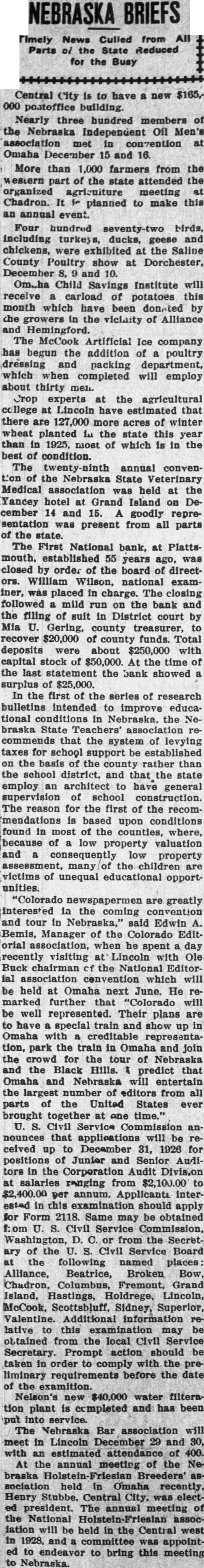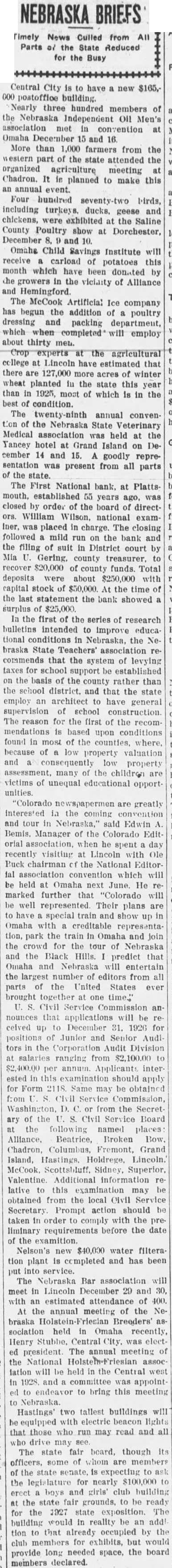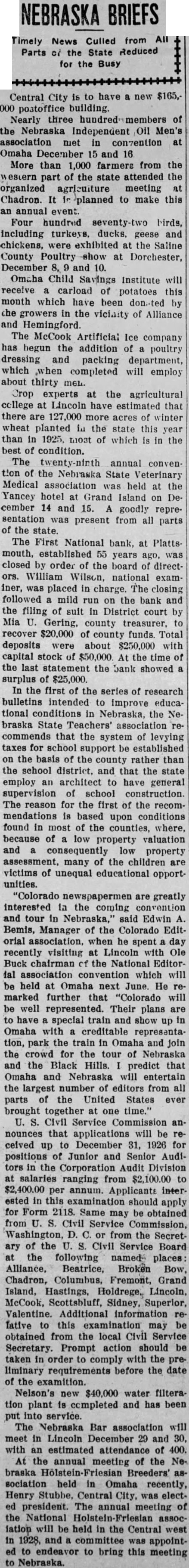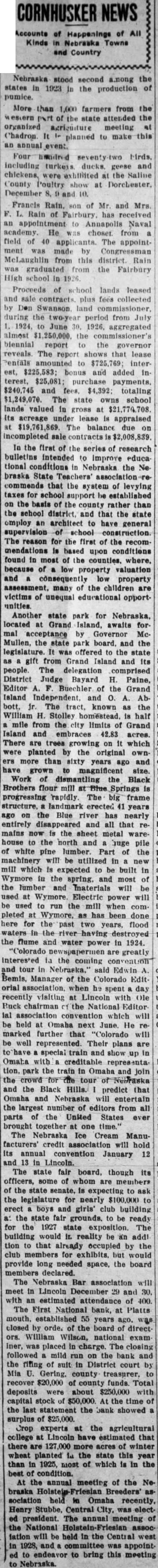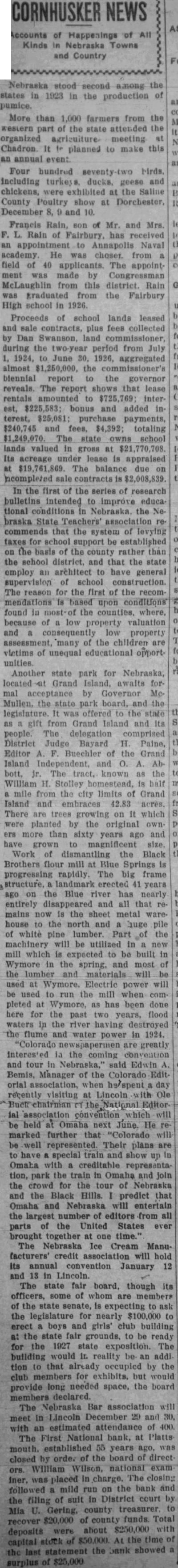 Accounts Happenings Kinds Nebraska Towns and Country states the production pumice. More than 1,000 farmers from the western part of the state attended the organized agricuiture- meeting planned to make this annual including turkeys, ducks, geese and chickens, were exhibited at the Saline County Poultry show at Dorchester, December 10. Francis Rain, son of Mr. and Mrs. Rain of Fairbury, has received appointment to Annapolis Naval academy. He was choser. from field of applicants. The appoint ment was made by McLaughlin from this district. Rain was graduated from the Fairbury High school in 1926. Proceeds of school lands leased and sale contracts, plus fees collected Dan Swanson, land during the period from July 1924, to June 1926, aggregated almost $1,250,000, the commissioner's biennial report to the governor reveals. The report shows that lease rentals amounted to interest, $225,583; bonus and added terest, $25,081: purchase payments, $240,745 and fees, $4,392; totaling $1,249,070. The state owns school lands valued in gross at $21,770,708. Its acreage under lease appraised $19,761,869. The balance due incompleted sale contracts is $2,008,839. In the first of the series of research bulletins intended to Improve educational conditions in Nebraska. the braska State Teachers' association commends that the system of levying taxes for school support be established on the basis of the county rather than the school district, and that the state employ an architect to have general supervision of school construction. reason for the first of the mendations based upon conditions found in the counties, where, because of low property valuation and consequently low property assessment, many of the children are victims of unequal educational opportunities. Another state park for Nebraska, located Grand Island, awaits for. mal acceptance by Governor McMullen. the state park board, and the legislature. It was offered to the state gift from Grand Island and its people. The delegation comprised District Judge Bayard Paine, Editor Buechler of the Grand Island Independent, and bott, The tract. known as the William H. Stolley homestead, half mile from the city limits of Grand Island and embraces 42.83 acrès. There are trees growing on which were planted by the original ownmore than sixty years ago and have grown magnificent size. Work of dismantling the Black Brothers flour mill at Blue Springs progressing rapidly. The big frame structure, landmark erected 41 years on the Blue river has nearly entirely disappeared and all that mains now is the sheet metal warehouse to the north and huge pile of white pine lumber. Part the machinery will be utilized in mill which is expected to be built in Wymore in the spring, and most of the lumber materials will used at Wymore. Electric power will be used run the mill when pleted at Wymore, as has been done here for the past two years, flood waters in the river having destroyed flume and water power in 1924. "Colorado are greatly interes'ed the coming and tour in Nebraska," said Edwin Bemis, Manager of the Colorado Edit. orial association, when recently visiting at Lincoln Ole association will held Omaha next June. He marked further that "Colorado well represented. Their plans have special train and show Omaha with creditable representation, park the train in Omaha and join the crowd for the tour of Nebraska and the Black Hills. predict that Omaha and Nebraska will entertain the largest number of editors from all parts the United States ever brought together at one The Nebraska Ice Cream Manufacturers' credit association will hold Its annual convention January 12 and 13 in Lincoln. The state fair board. though its officers, some of whom are members of the state senate, Is expecting to ask the legislature for nearly $100,000 erect boys and girls' club building the state fair grounds, to be ready the 1927 state exposition. The building would reality be addition to that already occupied by the club members for exhibits, but would long needed space, the board members declared. The Nebraska Bar association will meet in Lincoln December 29 and 30. with an estimated attendance of 400 The First National bank, Platts mouth. established years ago, closed by order the board direct William Wilson, iner. placed in charge. The closing followed mild run on the bank and the of suit District court filing Mia county treasurer recover $20,000 of county funds. Total about $250,000 with deposits were capital of $50,000. the time statement the bank showed