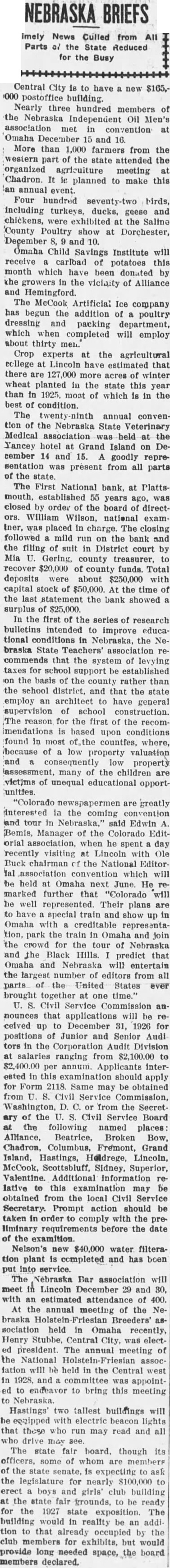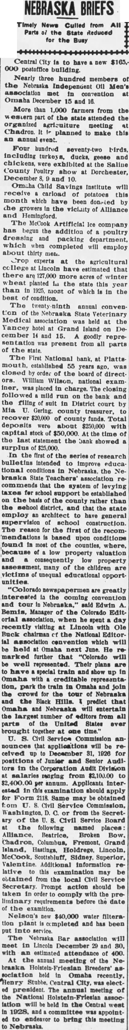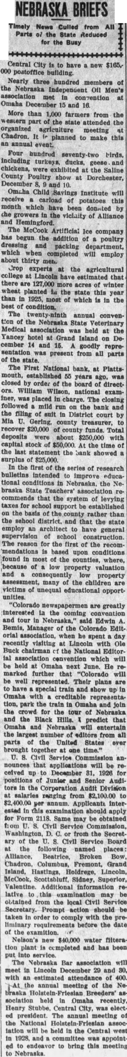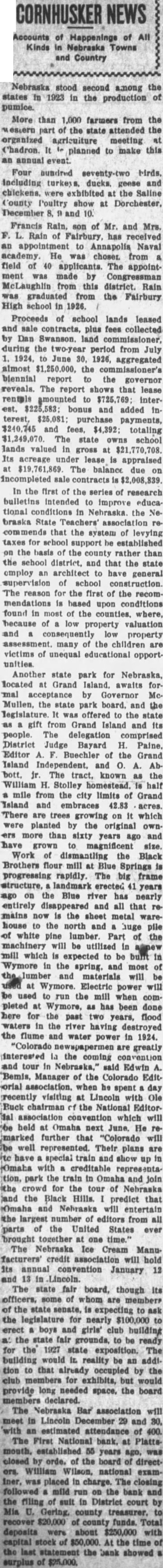 Accounts Happenings Kinds Nebraska Towns and Country states the production pumice. More than 1,000 farmers from the western part of the state attended the organized agricuiture- meeting planned to make this annual including turkeys, ducks, geese and chickens, were exhibited at the Saline County Poultry show at Dorchester, December 10. Francis Rain, son of Mr. and Mrs. Rain of Fairbury, has received appointment to Annapolis Naval academy. He was choser. from field of applicants. The appoint ment was made by McLaughlin from this district. Rain was graduated from the Fairbury High school in 1926. Proceeds of school lands leased and sale contracts, plus fees collected Dan Swanson, land during the period from July 1924, to June 1926, aggregated almost $1,250,000, the commissioner's biennial report to the governor reveals. The report shows that lease rentals amounted to interest, $225,583; bonus and added terest, $25,081: purchase payments, $240,745 and fees, $4,392; totaling $1,249,070. The state owns school lands valued in gross at $21,770,708. Its acreage under lease appraised $19,761,869. The balance due incompleted sale contracts is $2,008,839. In the first of the series of research bulletins intended to Improve educational conditions in Nebraska. the braska State Teachers' association commends that the system of levying taxes for school support be established on the basis of the county rather than the school district, and that the state employ an architect to have general supervision of school construction. reason for the first of the mendations based upon conditions found in the counties, where, because of low property valuation and consequently low property assessment, many of the children are victims of unequal educational opportunities. Another state park for Nebraska, located Grand Island, awaits for. mal acceptance by Governor McMullen. the state park board, and the legislature. It was offered to the state gift from Grand Island and its people. The delegation comprised District Judge Bayard Paine, Editor Buechler of the Grand Island Independent, and bott, The tract. known as the William H. Stolley homestead, half mile from the city limits of Grand Island and embraces 42.83 acrès. There are trees growing on which were planted by the original ownmore than sixty years ago and have grown magnificent size. Work of dismantling the Black Brothers flour mill at Blue Springs progressing rapidly. The big frame structure, landmark erected 41 years on the Blue river has nearly entirely disappeared and all that mains now is the sheet metal warehouse to the north and huge pile of white pine lumber. Part the machinery will be utilized in mill which is expected to be built in Wymore in the spring, and most of the lumber materials will used at Wymore. Electric power will be used run the mill when pleted at Wymore, as has been done here for the past two years, flood waters in the river having destroyed flume and water power in 1924. "Colorado are greatly interes'ed the coming and tour in Nebraska," said Edwin Bemis, Manager of the Colorado Edit. orial association, when recently visiting at Lincoln Ole association will held Omaha next June. He marked further that "Colorado well represented. Their plans have special train and show Omaha with creditable representation, park the train in Omaha and join the crowd for the tour of Nebraska and the Black Hills. predict that Omaha and Nebraska will entertain the largest number of editors from all parts the United States ever brought together at one The Nebraska Ice Cream Manufacturers' credit association will hold Its annual convention January 12 and 13 in Lincoln. The state fair board. though its officers, some of whom are members of the state senate, Is expecting to ask the legislature for nearly $100,000 erect boys and girls' club building the state fair grounds, to be ready the 1927 state exposition. The building would reality be addition to that already occupied by the club members for exhibits, but would long needed space, the board members declared. The Nebraska Bar association will meet in Lincoln December 29 and 30. with an estimated attendance of 400 The First National bank, Platts mouth. established years ago, closed by order the board direct William Wilson, iner. placed in charge. The closing followed mild run on the bank and the of suit District court filing Mia county treasurer recover $20,000 of county funds. Total about $250,000 with deposits were capital of $50,000. the time statement the bank showed