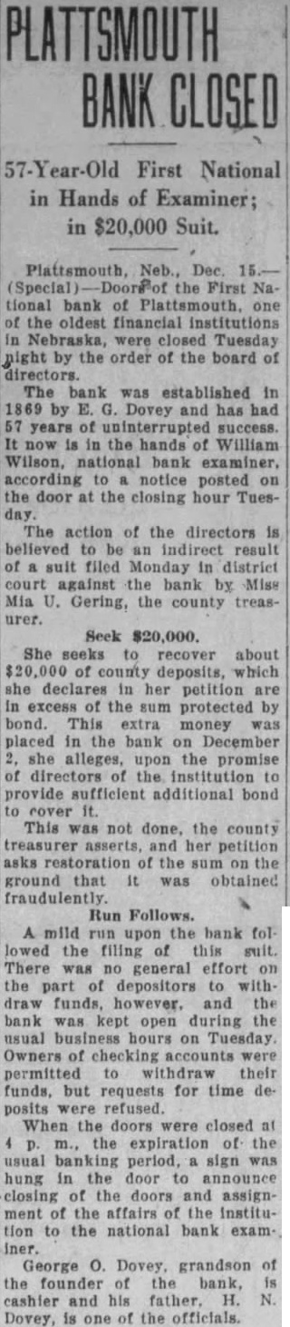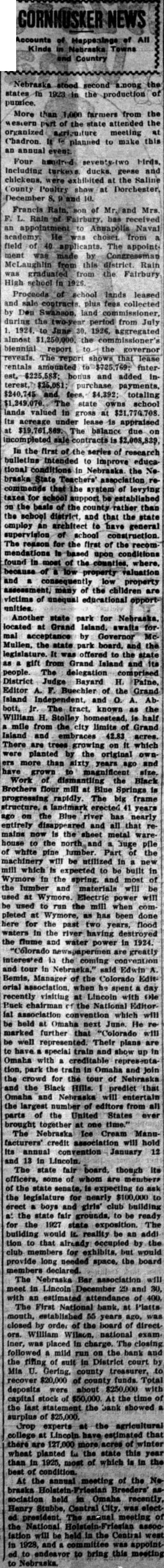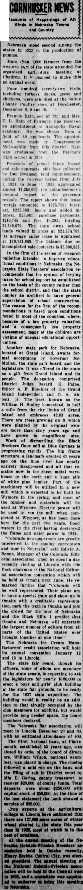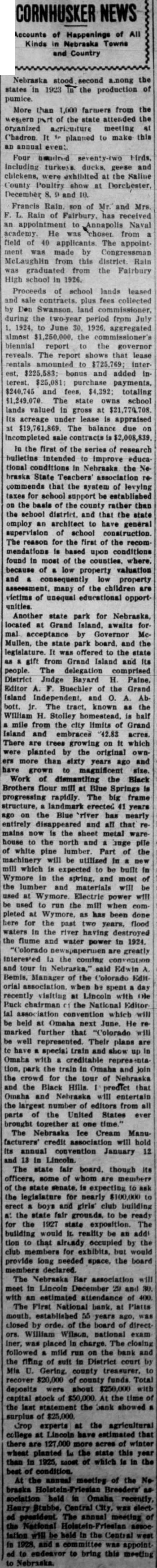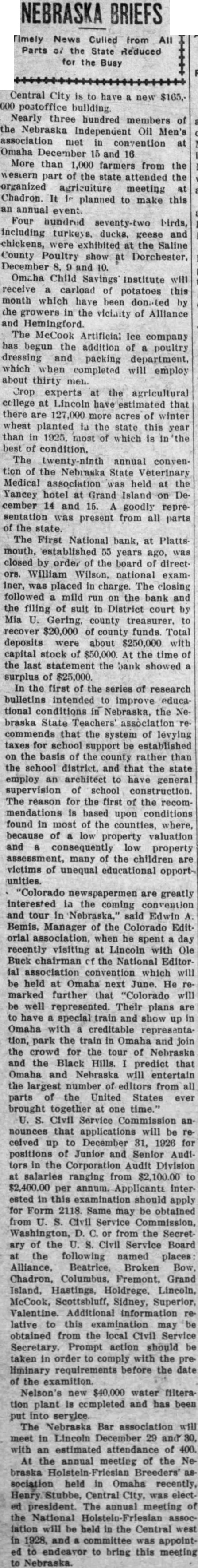 Accounts Happenings Kinds Nebraska Towns and Country states the production pumice. More than 1,000 farmers from the western part of the state attended the organized agricuiture- meeting planned to make this annual including turkeys, ducks, geese and chickens, were exhibited at the Saline County Poultry show at Dorchester, December 10. Francis Rain, son of Mr. and Mrs. Rain of Fairbury, has received appointment to Annapolis Naval academy. He was choser. from field of applicants. The appoint ment was made by McLaughlin from this district. Rain was graduated from the Fairbury High school in 1926. Proceeds of school lands leased and sale contracts, plus fees collected Dan Swanson, land during the period from July 1924, to June 1926, aggregated almost $1,250,000, the commissioner's biennial report to the governor reveals. The report shows that lease rentals amounted to interest, $225,583; bonus and added terest, $25,081: purchase payments, $240,745 and fees, $4,392; totaling $1,249,070. The state owns school lands valued in gross at $21,770,708. Its acreage under lease appraised $19,761,869. The balance due incompleted sale contracts is $2,008,839. In the first of the series of research bulletins intended to Improve educational conditions in Nebraska. the braska State Teachers' association commends that the system of levying taxes for school support be established on the basis of the county rather than the school district, and that the state employ an architect to have general supervision of school construction. reason for the first of the mendations based upon conditions found in the counties, where, because of low property valuation and consequently low property assessment, many of the children are victims of unequal educational opportunities. Another state park for Nebraska, located Grand Island, awaits for. mal acceptance by Governor McMullen. the state park board, and the legislature. It was offered to the state gift from Grand Island and its people. The delegation comprised District Judge Bayard Paine, Editor Buechler of the Grand Island Independent, and bott, The tract. known as the William H. Stolley homestead, half mile from the city limits of Grand Island and embraces 42.83 acrès. There are trees growing on which were planted by the original ownmore than sixty years ago and have grown magnificent size. Work of dismantling the Black Brothers flour mill at Blue Springs progressing rapidly. The big frame structure, landmark erected 41 years on the Blue river has nearly entirely disappeared and all that mains now is the sheet metal warehouse to the north and huge pile of white pine lumber. Part the machinery will be utilized in mill which is expected to be built in Wymore in the spring, and most of the lumber materials will used at Wymore. Electric power will be used run the mill when pleted at Wymore, as has been done here for the past two years, flood waters in the river having destroyed flume and water power in 1924. "Colorado are greatly interes'ed the coming and tour in Nebraska," said Edwin Bemis, Manager of the Colorado Edit. orial association, when recently visiting at Lincoln Ole association will held Omaha next June. He marked further that "Colorado well represented. Their plans have special train and show Omaha with creditable representation, park the train in Omaha and join the crowd for the tour of Nebraska and the Black Hills. predict that Omaha and Nebraska will entertain the largest number of editors from all parts the United States ever brought together at one The Nebraska Ice Cream Manufacturers' credit association will hold Its annual convention January 12 and 13 in Lincoln. The state fair board. though its officers, some of whom are members of the state senate, Is expecting to ask the legislature for nearly $100,000 erect boys and girls' club building the state fair grounds, to be ready the 1927 state exposition. The building would reality be addition to that already occupied by the club members for exhibits, but would long needed space, the board members declared. The Nebraska Bar association will meet in Lincoln December 29 and 30. with an estimated attendance of 400 The First National bank, Platts mouth. established years ago, closed by order the board direct William Wilson, iner. placed in charge. The closing followed mild run on the bank and the of suit District court filing Mia county treasurer recover $20,000 of county funds. Total about $250,000 with deposits were capital of $50,000. the time statement the bank showed