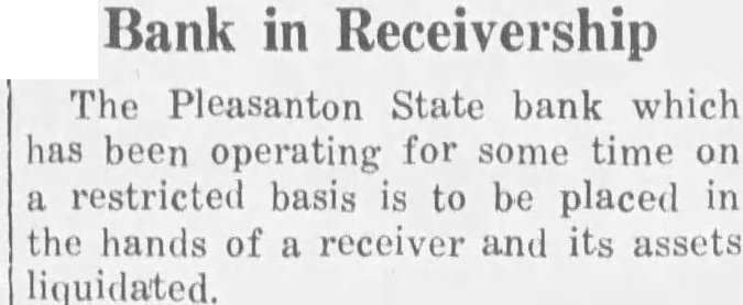 Article (1934-01-25) states the Pleasanton State Bank was operating on a restricted basis and 'is to be placed in the hands of a receiver and its assets liquidated.' No run is mentioned; regulatory/receiver action leading to permanent closure is indicated.
