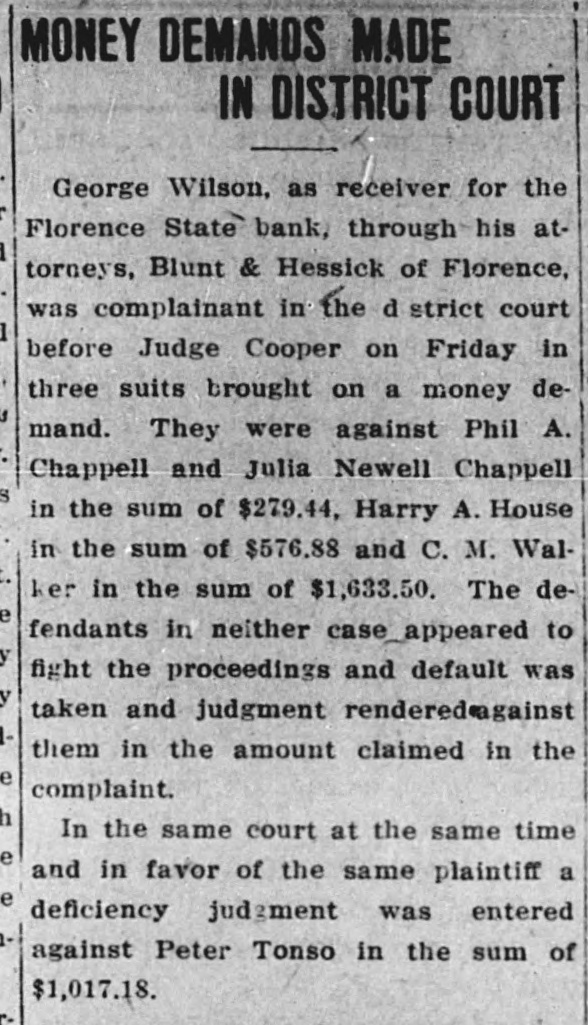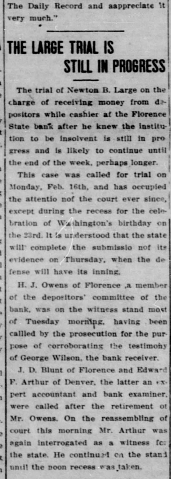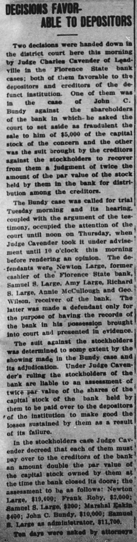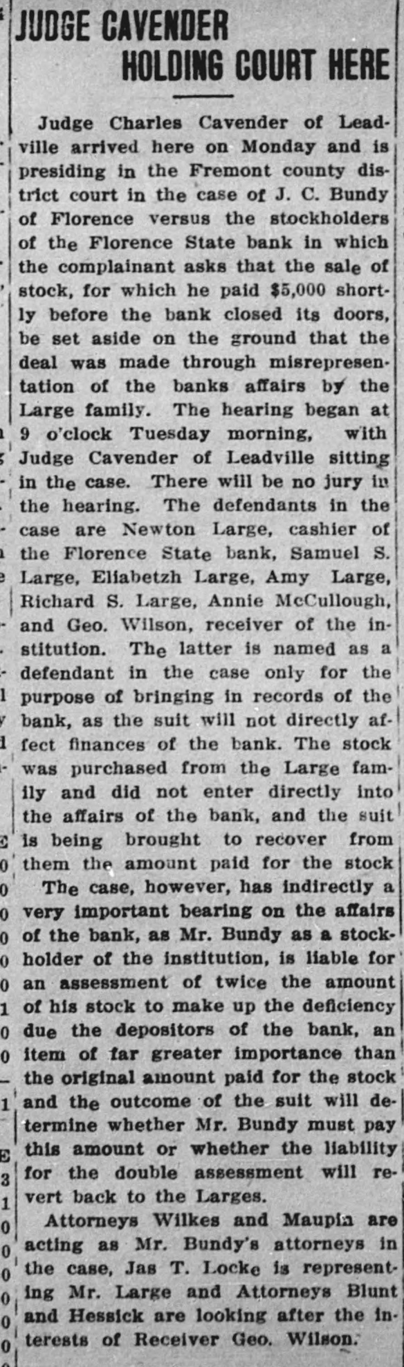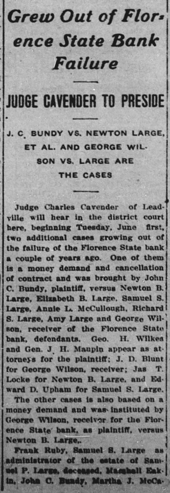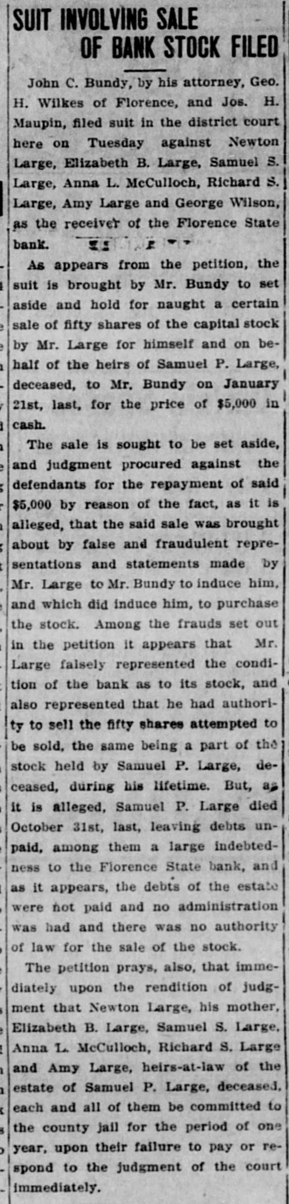 SUIT INVOLVING SALE OF BANK STOCK FILED John C. Bundy, by his attorney, Geo. H. Wilkes of Florence, and Jos. H. Maupin, filed suit in the district court here on Tuesday against Newton Large, Elizabeth B. Large, Samuel S. Large, Anna L. McCulloch, Richard S. Large, Amy Large and George Wilson, as the receiver of the Florence State bank. 5: F As appears from the petition, the suit is brought by Mr. Bundy to set aside and hold for naught a certain sale of fifty shares of the capital stock by Mr. Large for himself and on be1 half of the heirs of Samuel P. Large, deceased, to Mr. Bundy on January / 21st, last, for the price of $5,000 in cash. 1 1 The sale is sought to be set aside, e and judgment procured against the defendants for the repayment of said : $5,000 by reason of the fact, as it is 1 alleged, that the said sale was brought about by false and fraudulent repret sentations and statements made by Mr. Large to Mr. Bundy to induce him, and which did induce him, to purchase the stock. Among the frauds set out in the petition it appears that Mr. Large falsely represented the condition of the bank as to its stock, and also represented that he had authority to sell the fifty shares attempted to be sold, the same being a part of the stock held by Samuel P. Large, deceased, during his lifetime. But, as it is alleged, Samuel P. Large died October 31st, last, leaving debts unpaid, among them a large indebtedness to the Florence State bank, and as it appears, the debts of the estate were not paid and no administration was had and there was no authority of law for the sale of the stock. The petition prays, also, that immediately upon the rendition of judgment that Newton Large, his mother, $ e Elizabeth B. Large, Samuel S. Large, I Anna L. McCulloch, Richard S. Large I and Amy Large, heirs-at-law of the estate of Samuel P. Large, deceased, 1 each and all of them be committed to ( 8 the county jail for the period of one o year, upon their failure to pay or respond to the judgment of the court immediately.